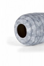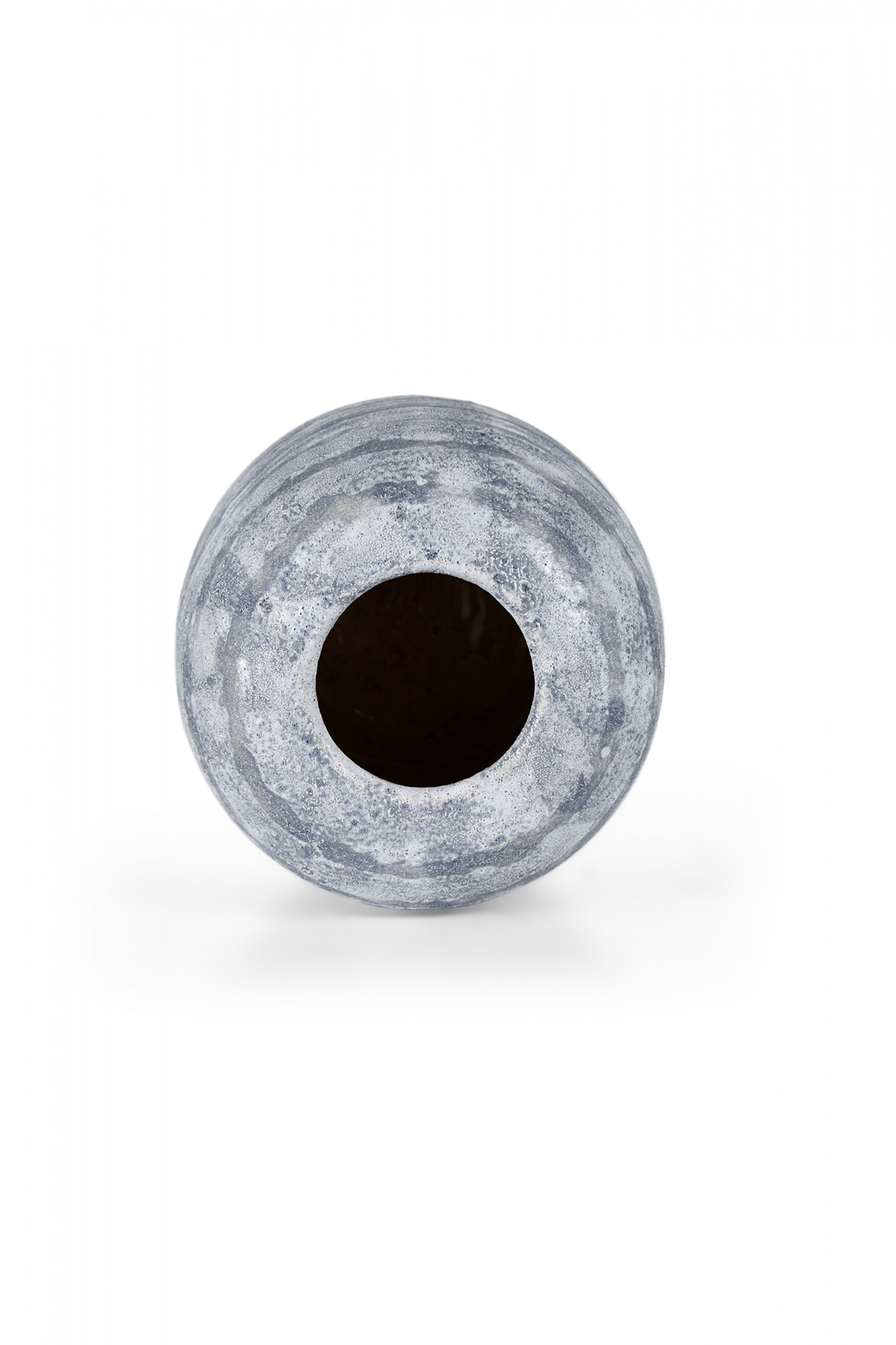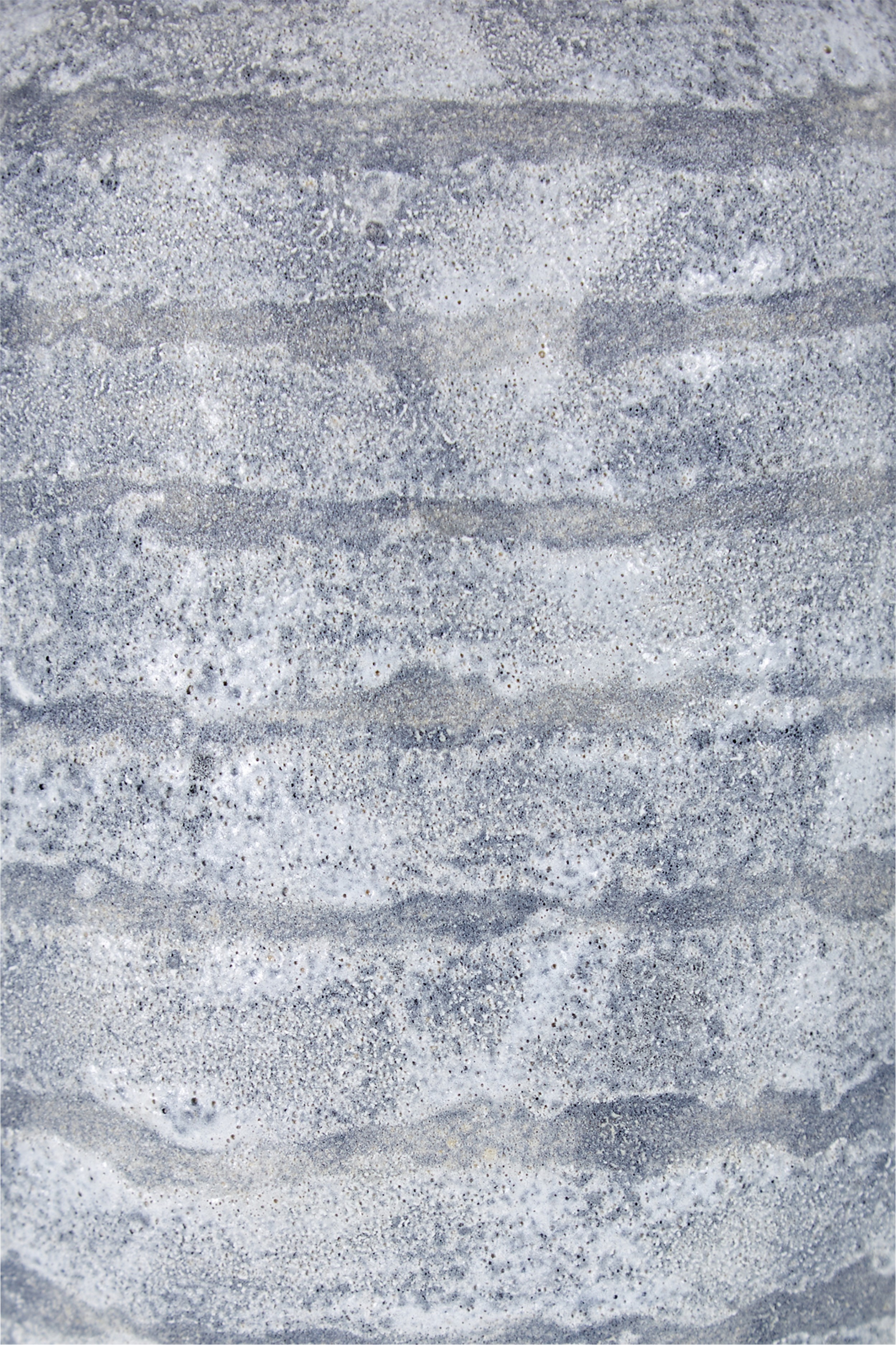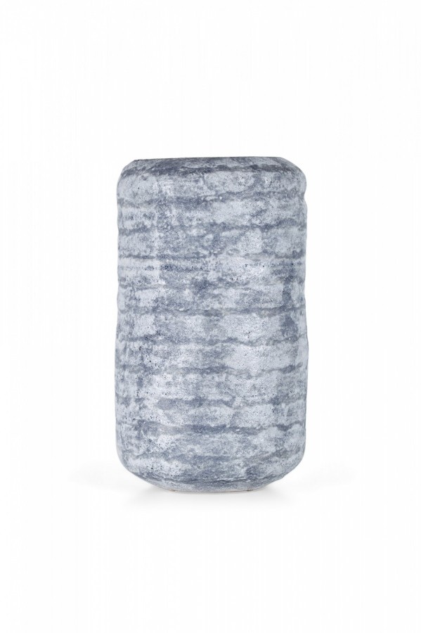Contemporary thrown clay vase with a cylindrical form with rounded bottom and top with a small circular opening and incised horizontal stripes with a textured gray finish. (GARY DIPASQUALE) (Companion pieces: NWL6474, NWL6475).