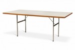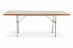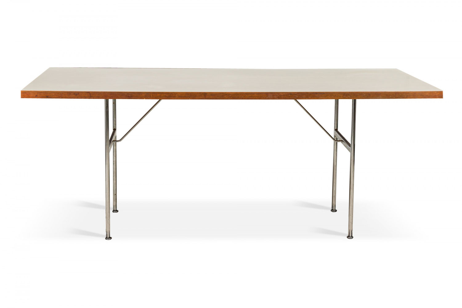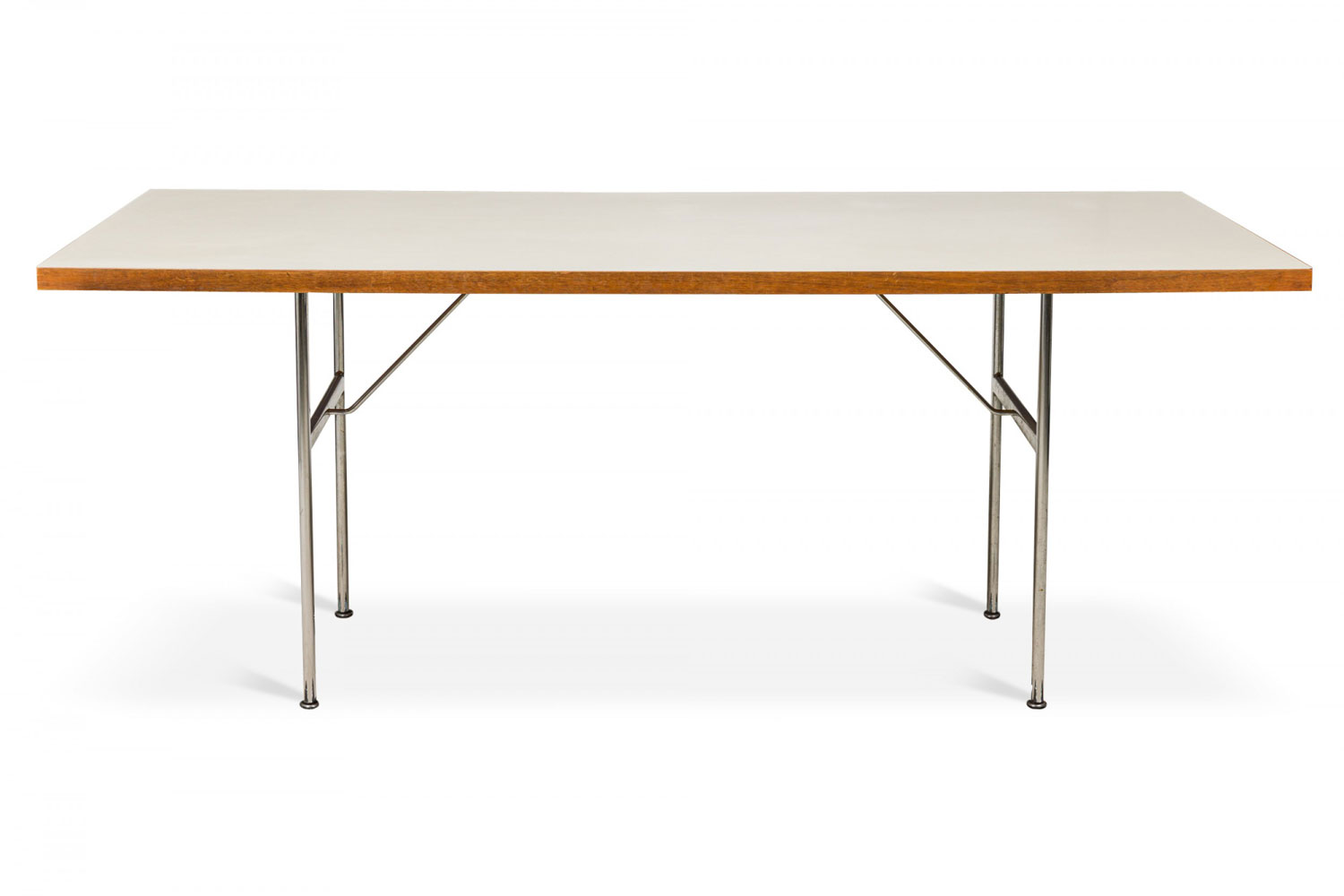 American Mid-Century dining / conference table with a rectangular white laminate top resting having a light wood edge on two H-shaped tubular steel legs. (GEORGE NELSON / HERMAN MILLER)