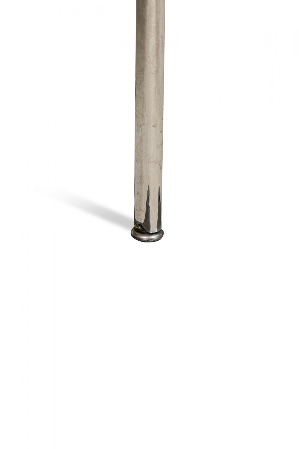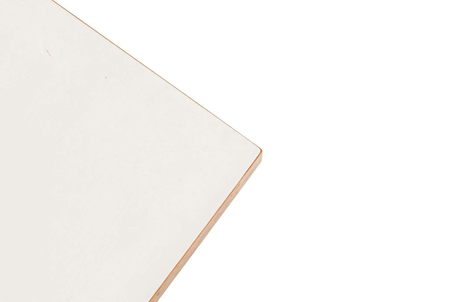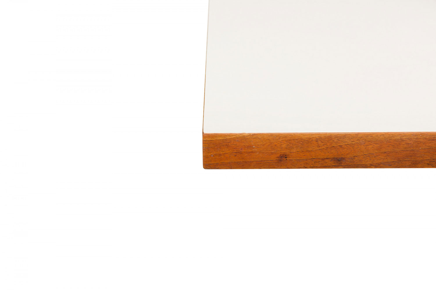 Style: Mid-Century Materials & Techniques: Laminate, metal, steel, wood Category: Tables, Office/Library, Dining Room Condition: Scuffing and staining to white tabletop Good; Wear consistent with age and use