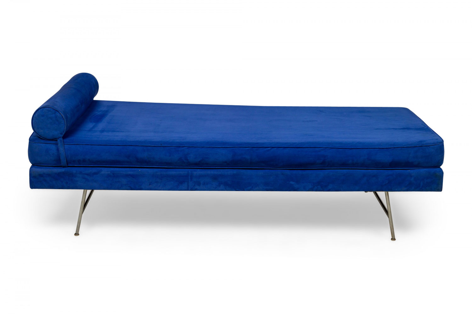 American Mid-Century daybed with a royal blue velour upholstered rectangular bed with two matching bolster pillows resting on a chrome frame with a central curved wooden framing piece. (GEORGE NELSON FOR HERMAN MILLER)
