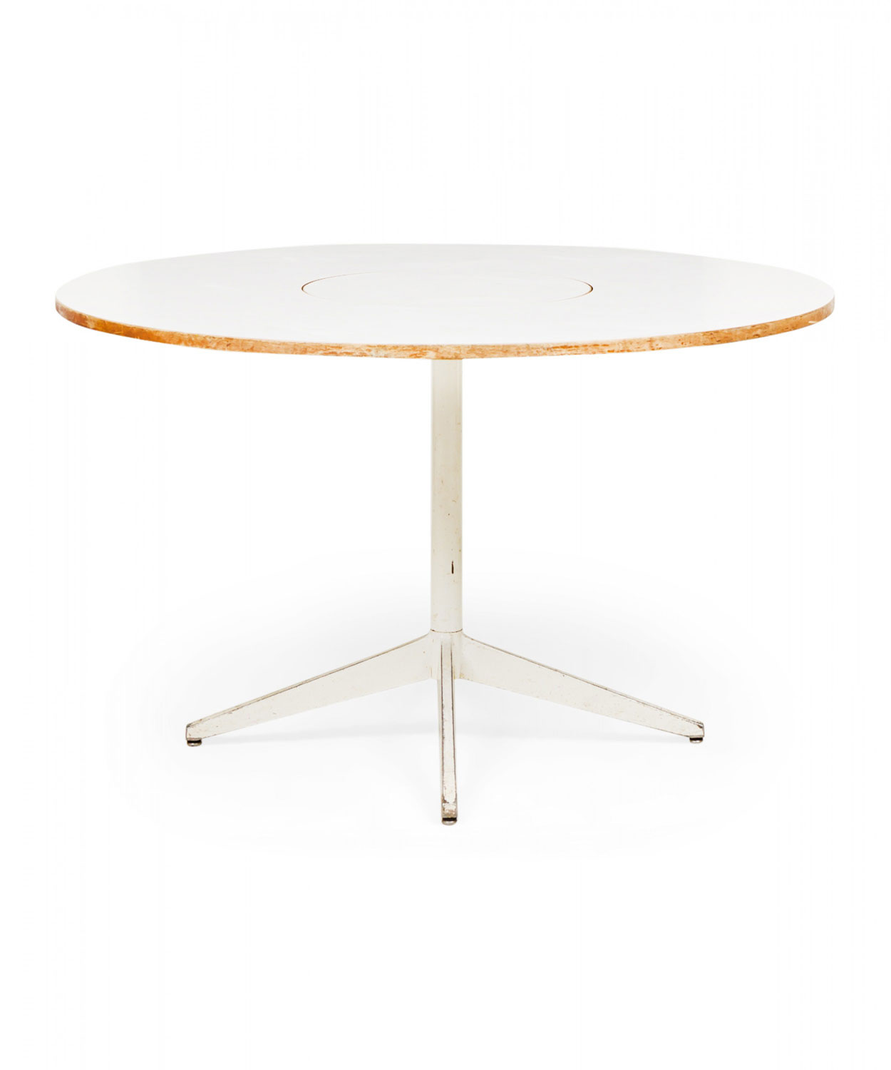 American Mid-Century circular dining table with a white laminate top featuring a central lazy susan circular section that rotates, resting on a white powder coated metal pedestal base with four angled legs. (GEORGE NELSON FOR HERMAN MILLER)
