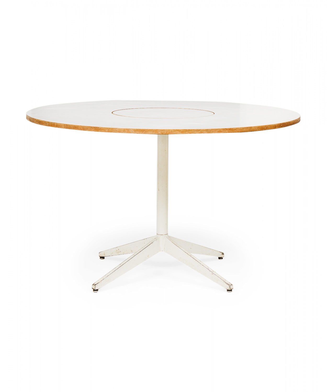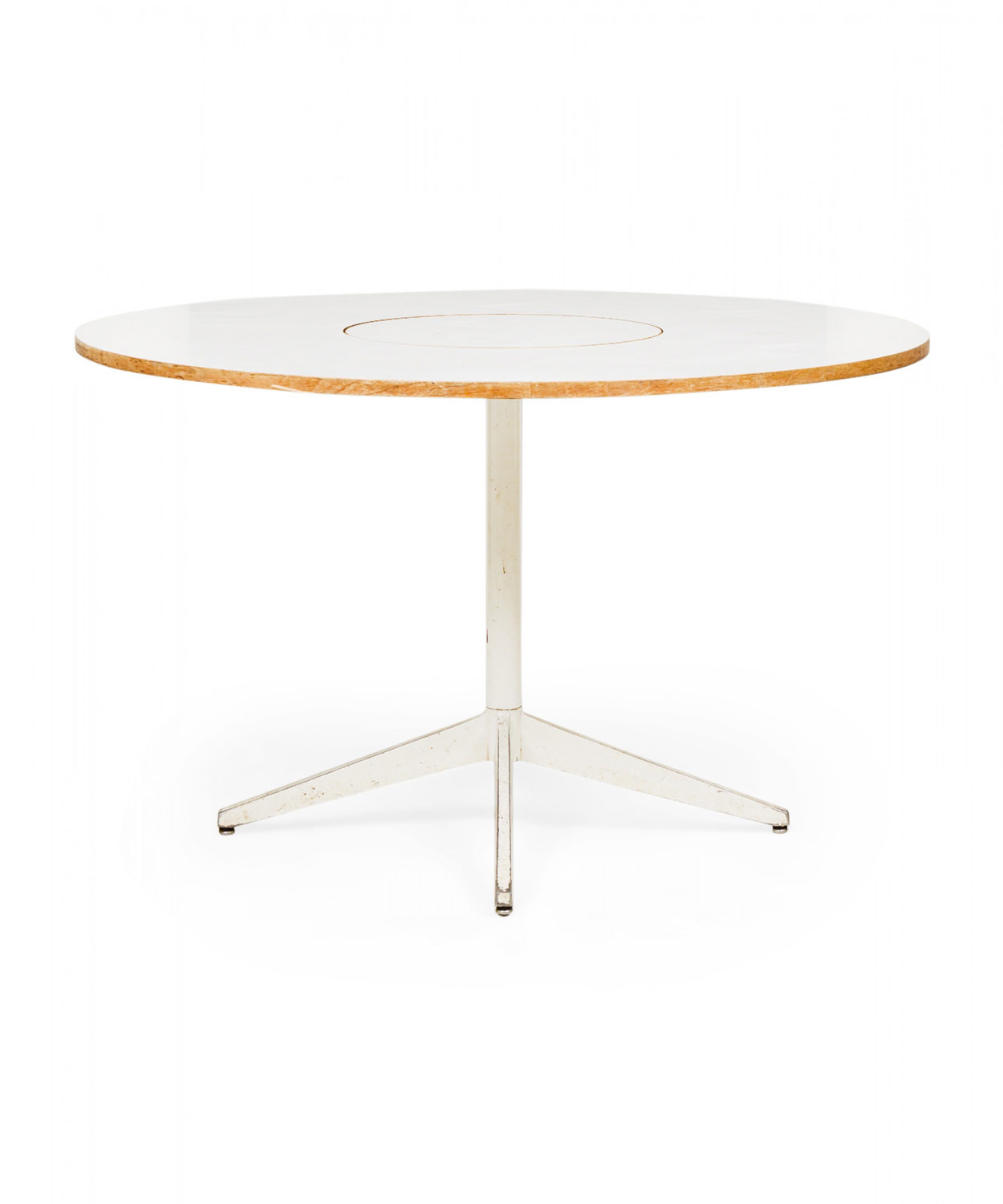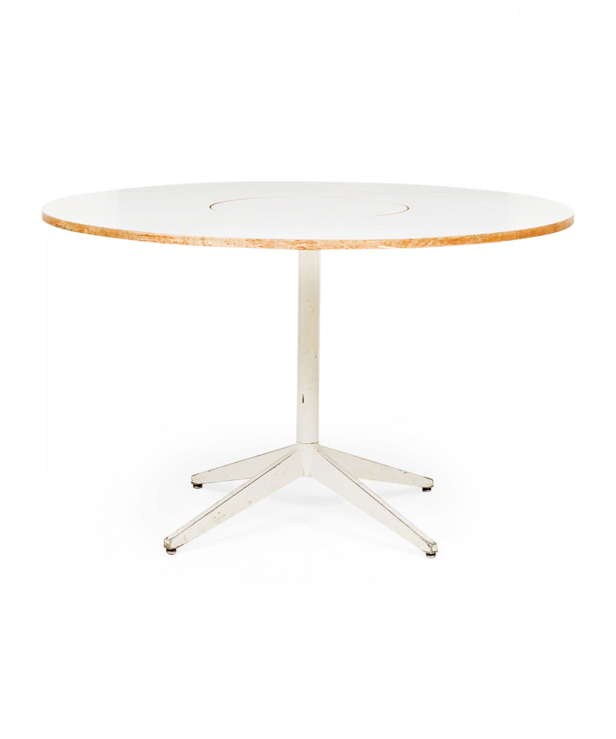 American Mid-Century circular dining table with a white laminate top featuring a central lazy susan circular section that rotates, resting on a white powder coated metal pedestal base with four angled legs. (GEORGE NELSON FOR HERMAN MILLER).