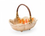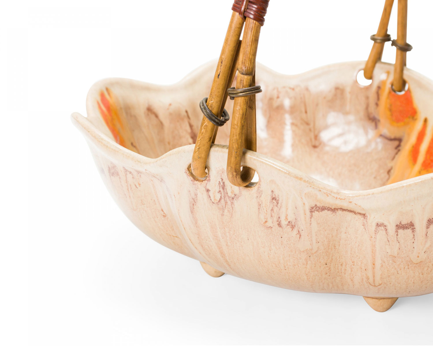 German Mid-Century ceramic and porcelan decorative basket with a wrapped rattan handle supported by a scalloped ceramic basket with an abstract orange, brown and beige glaze. (numbered on bottom)