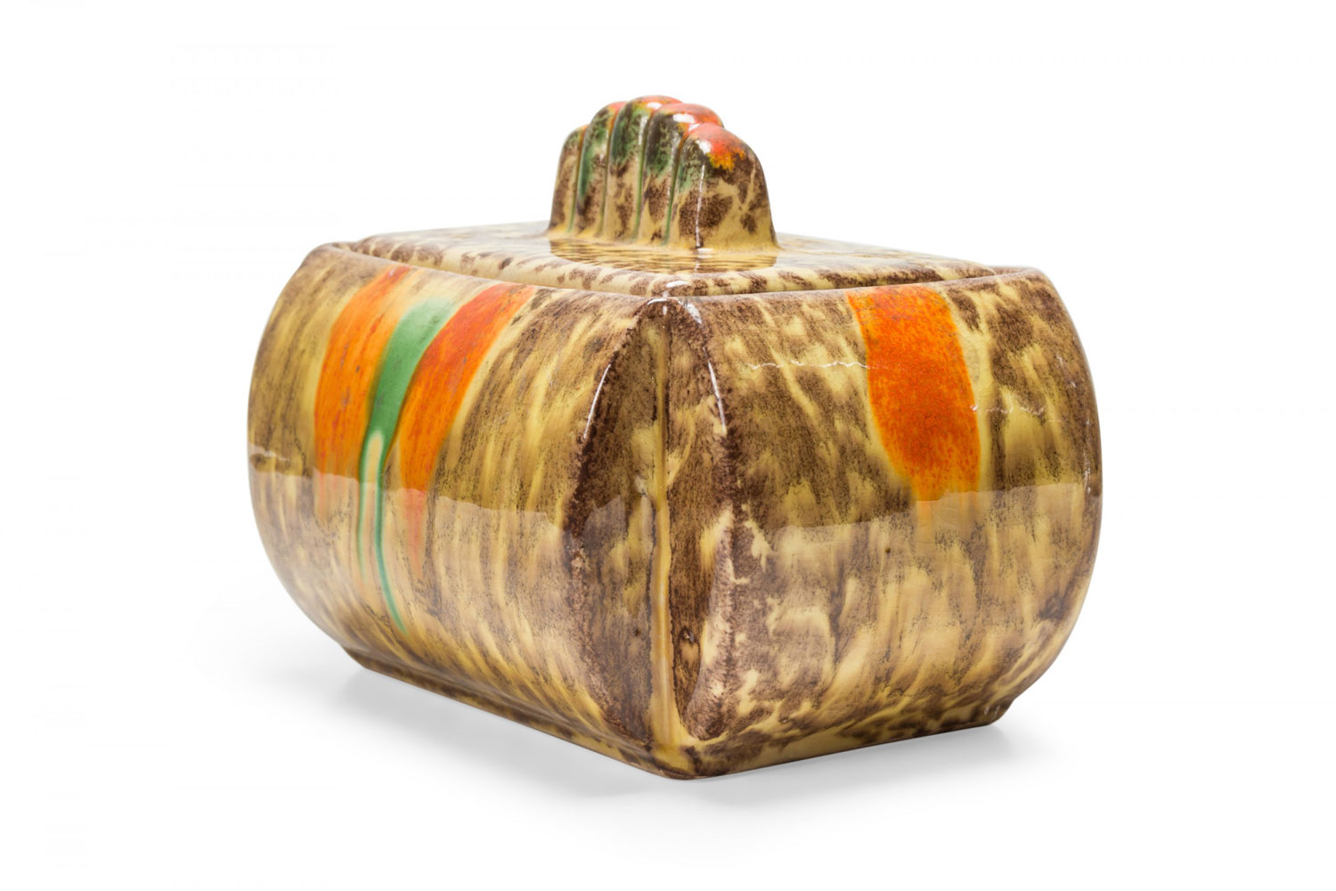 German Mid-Century ceramic lidded box with rounded sides and an incised lid handle, and an orange and green brushed shape on the side against a beige and brown specked glazed ground. (numbered on bottom, 11)
