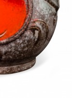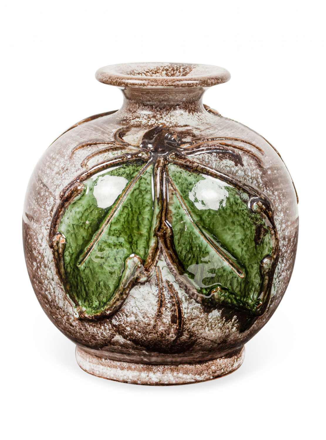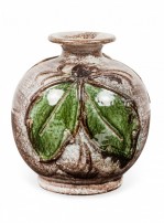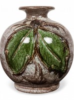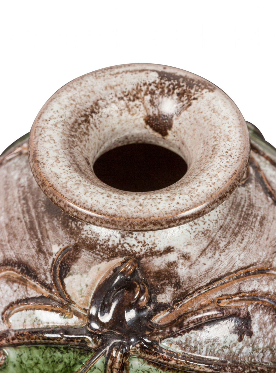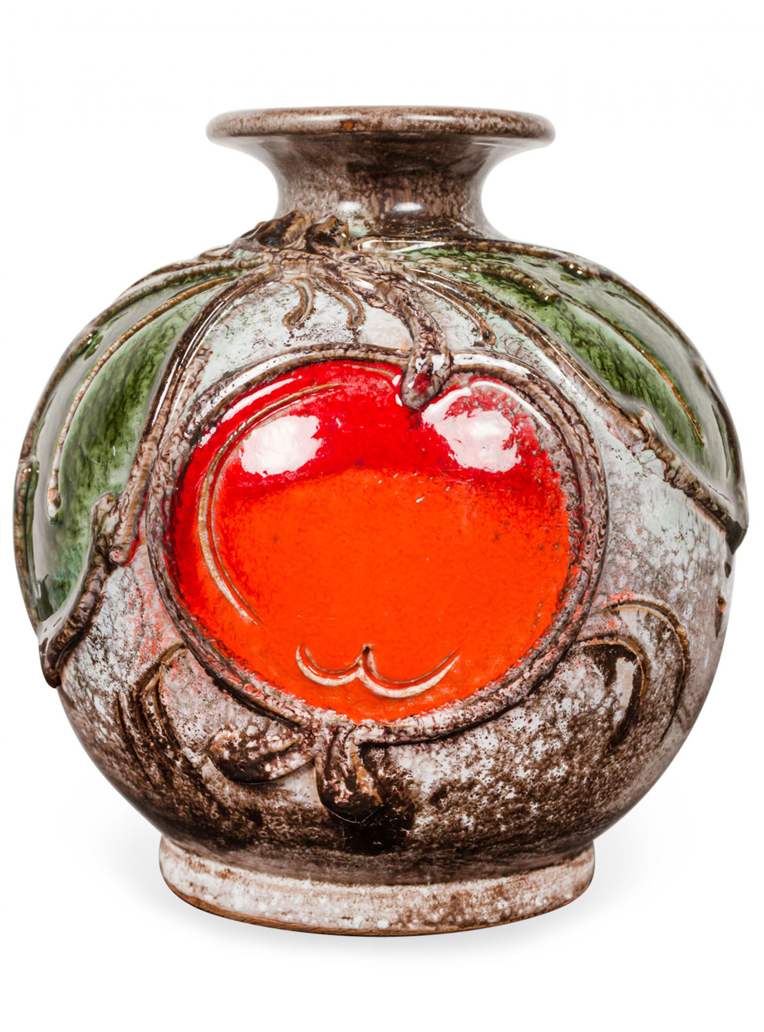German Mid-Century ceramic vase with a bold raised fruit and leaf pattern glazed in green, orange, and brown against a mottled gray glazed ground..