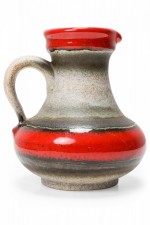 German Mid-Century Red, Black, and Gray Speckle Glazed Ceramic Pitcher with Handle