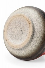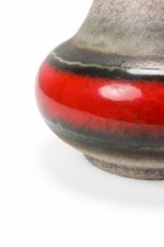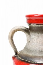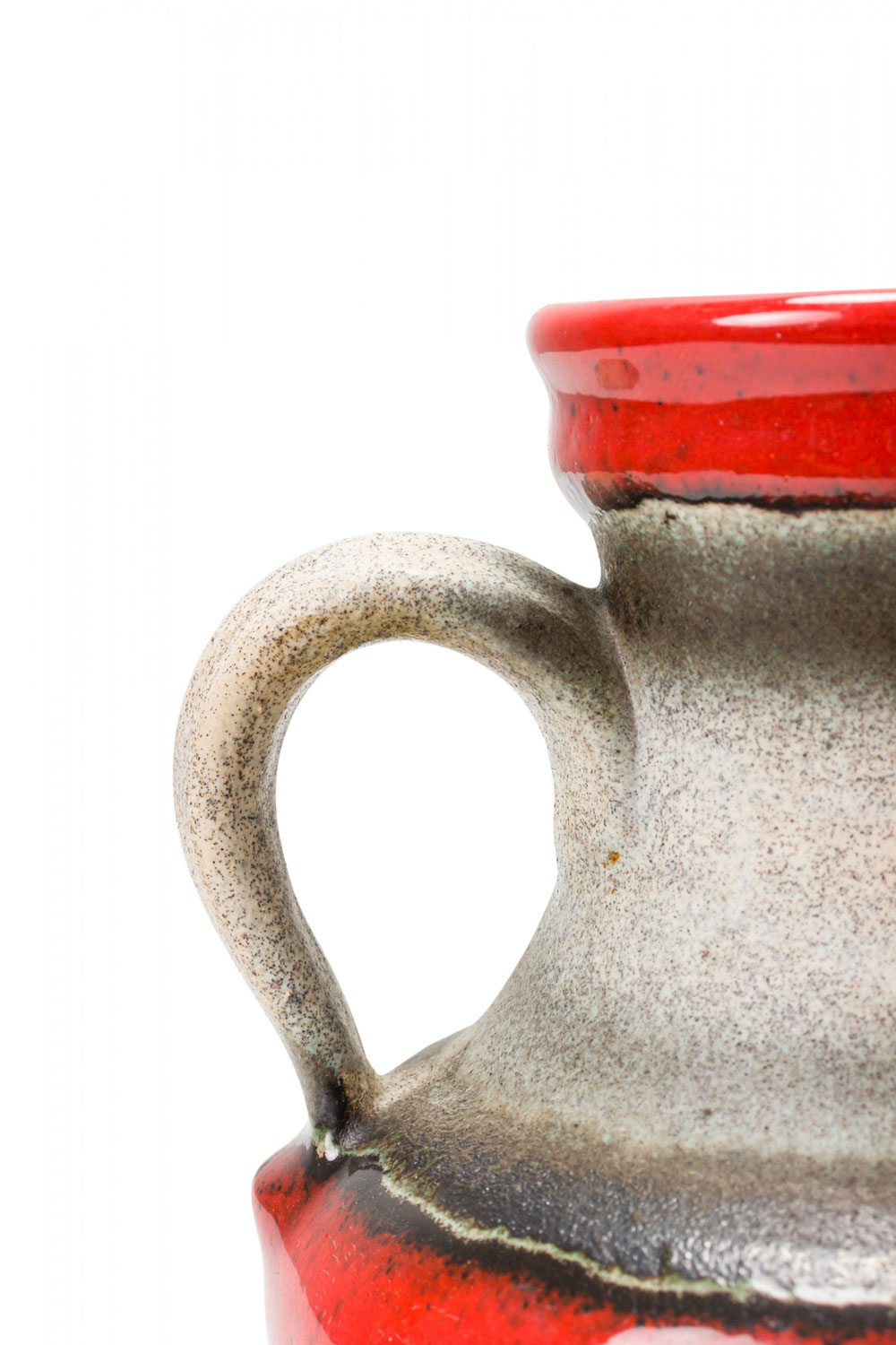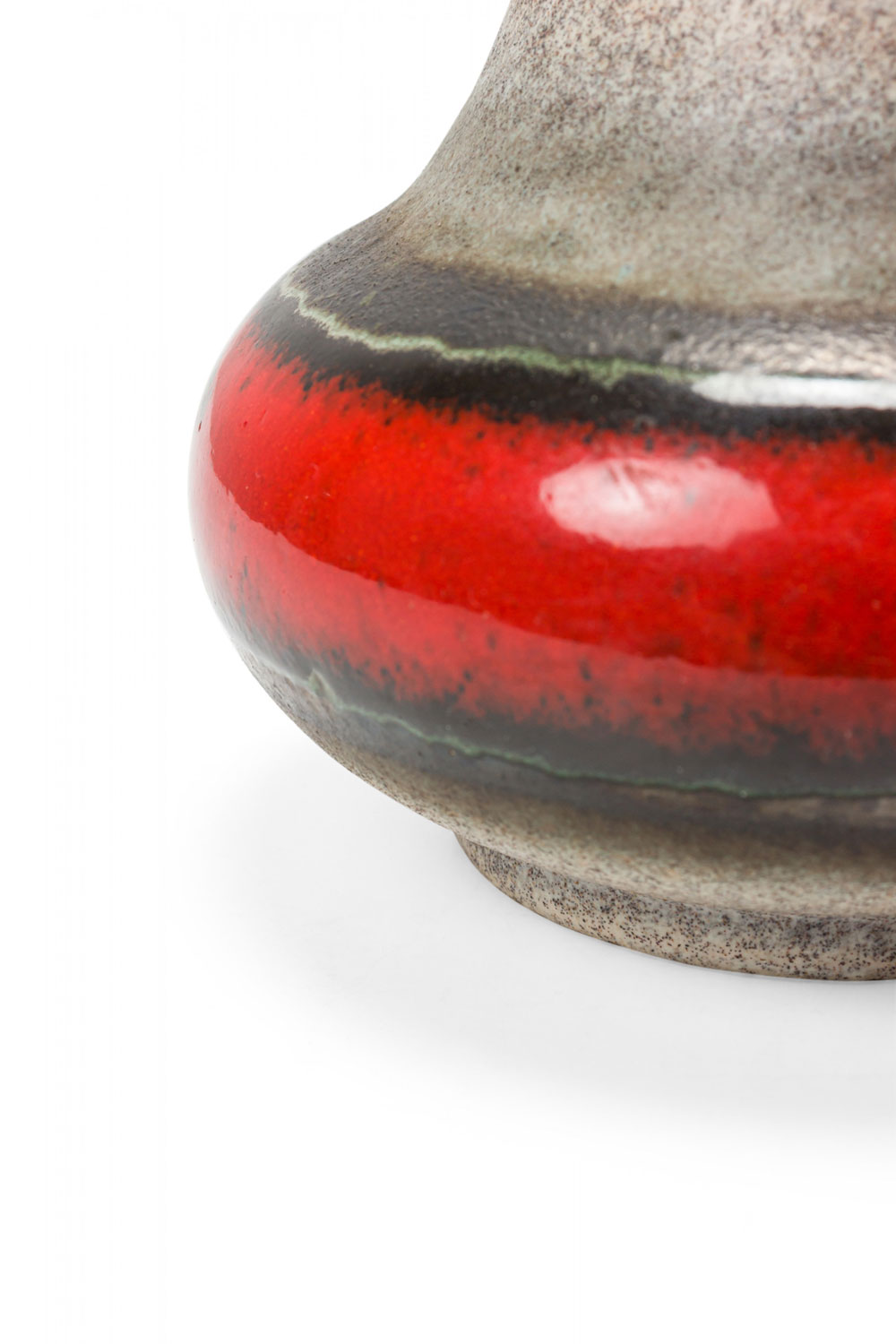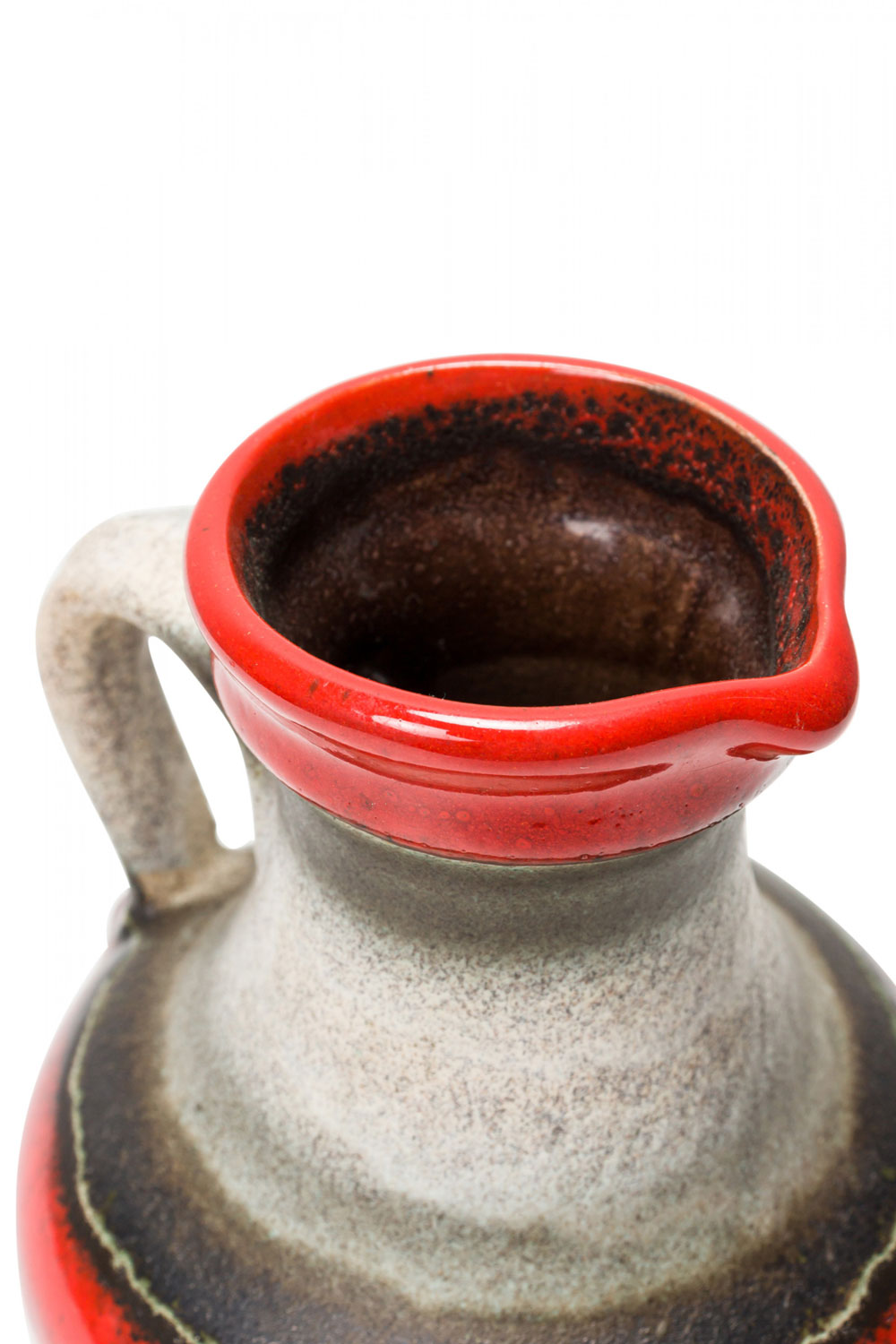 German Mid-Century ceramic handled pitcher with a wide red glazed base, a slimmer black and gray textured middle, and a flared red glazed spout. (numbered on bottom.).