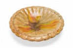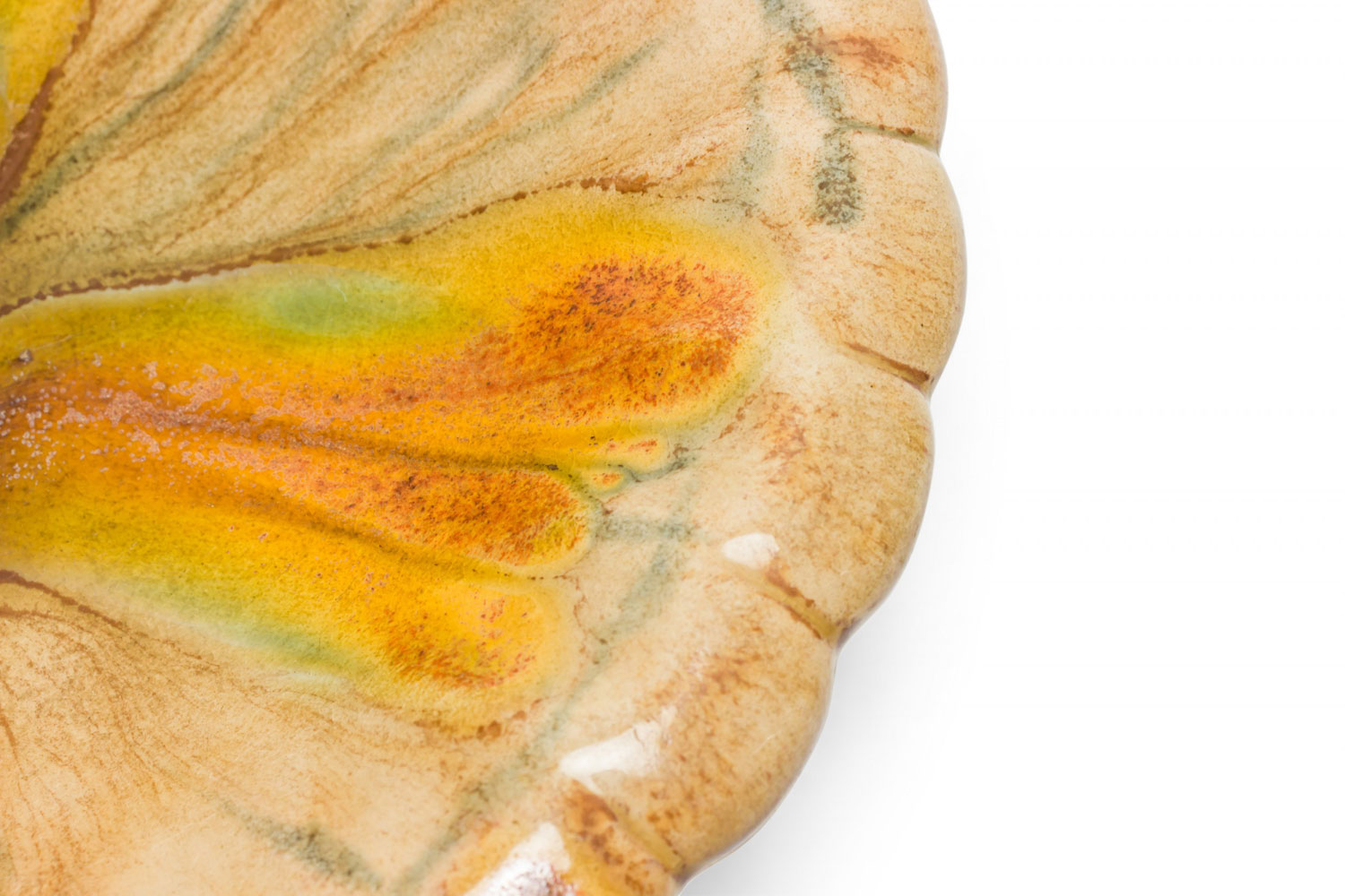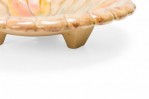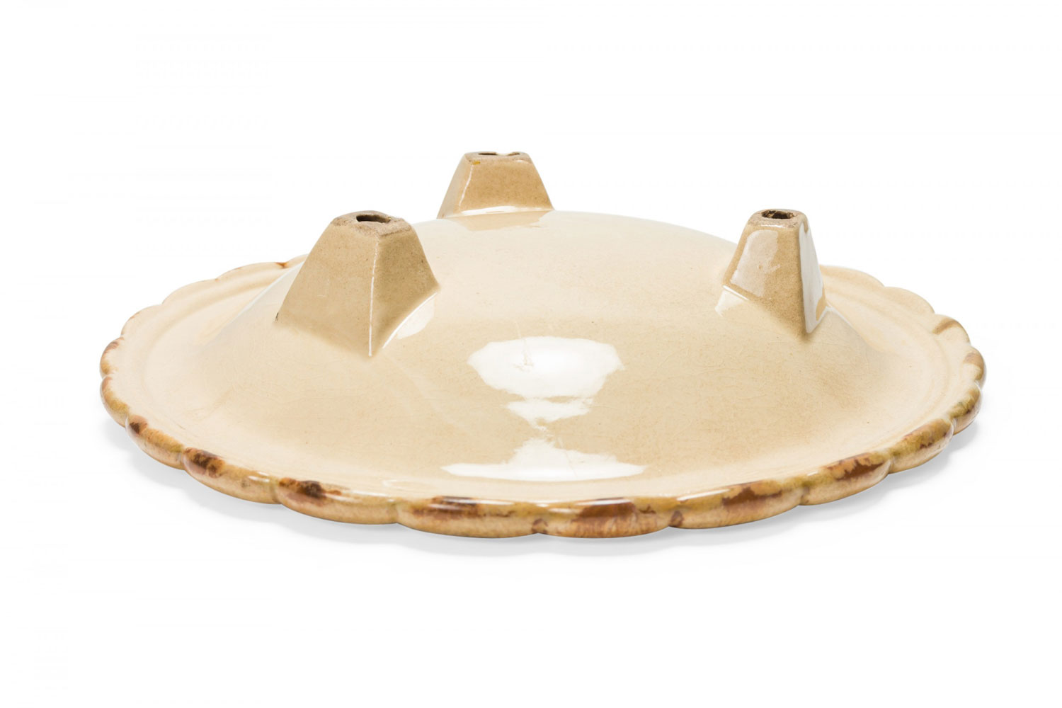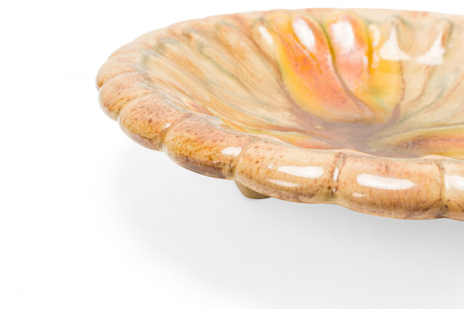 German Mid-Century Scalloped Edge Beige, Orange, and Green Glazed Ceramic Footed Dish