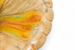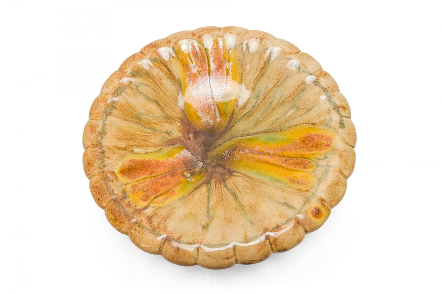 German Mid-Century ceramic circular dish with scalloped edges and a fluted interior resting on three small feet with a beige, orange, and green marbled glaze..