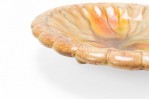 German Mid-Century ceramic circular dish with scalloped edges and a fluted interior resting on three small feet with a beige, orange, and green marbled glaze.
