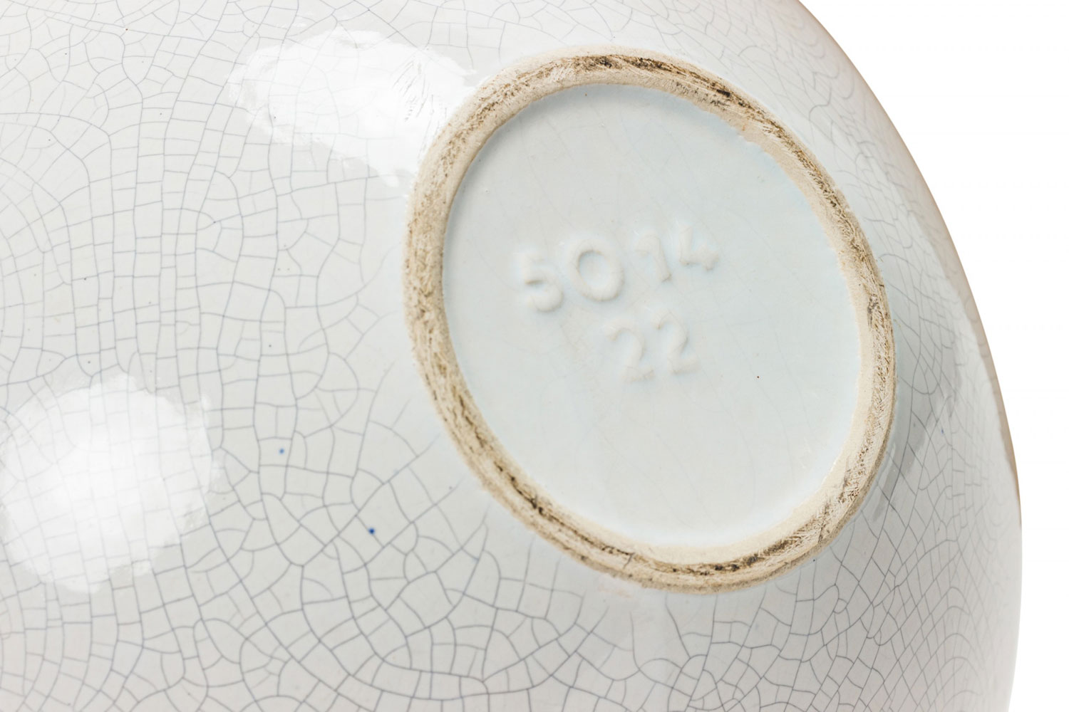 German Mid-Century ceramic bowl with tapered sides with an exterior white crackled finish. (numbered on bottom, 5014 22)