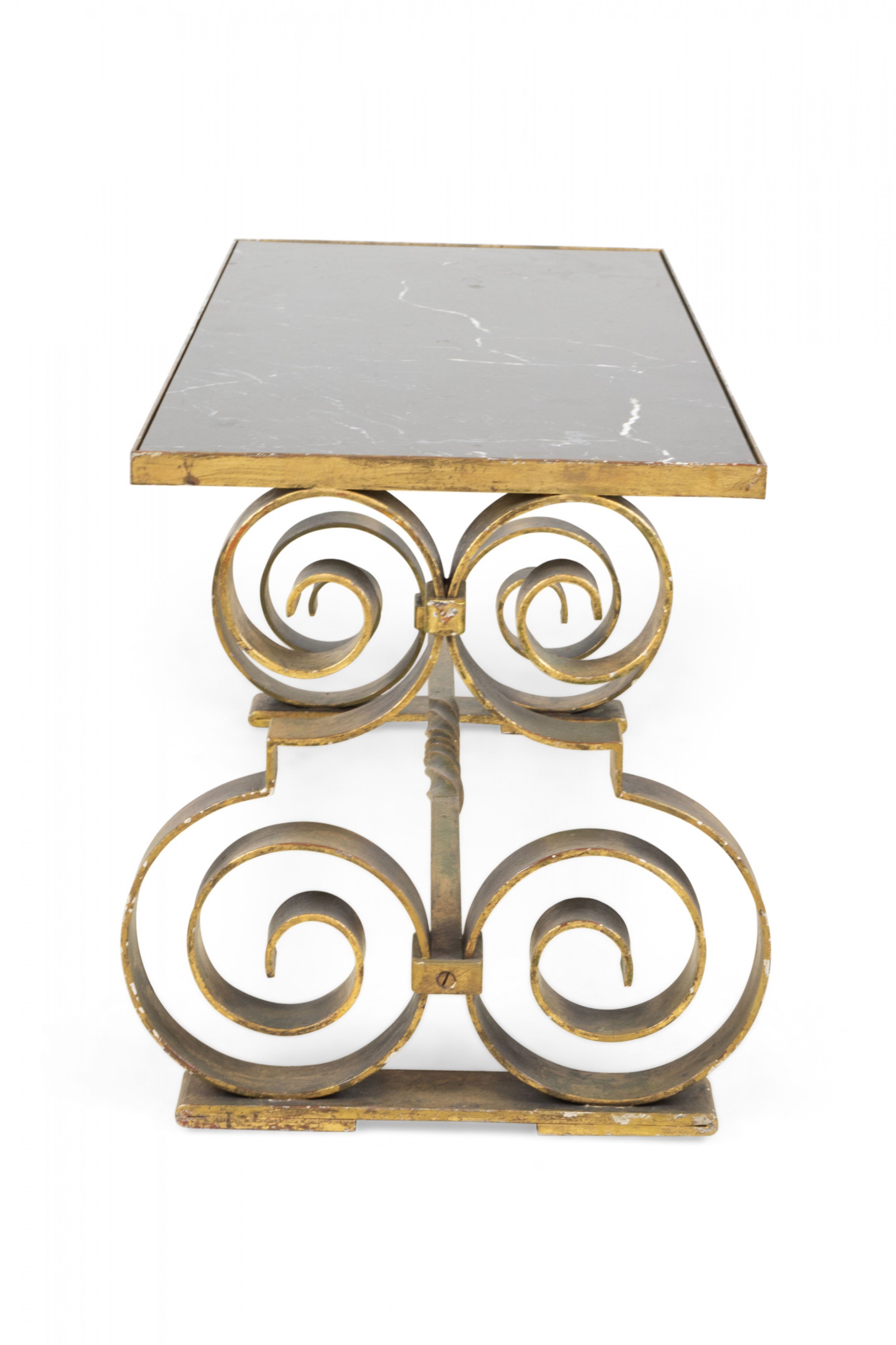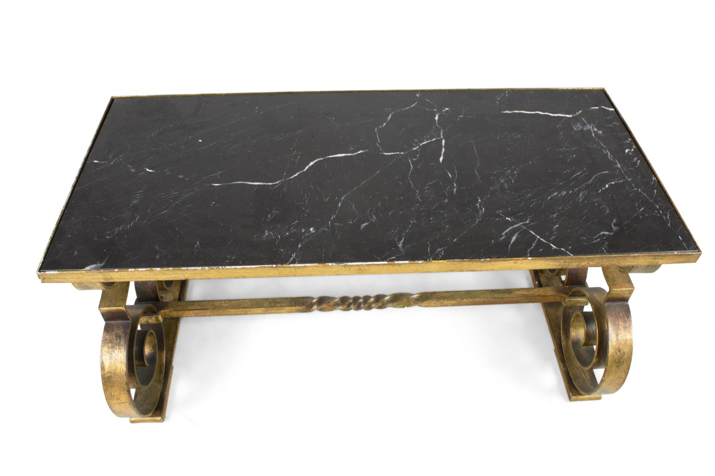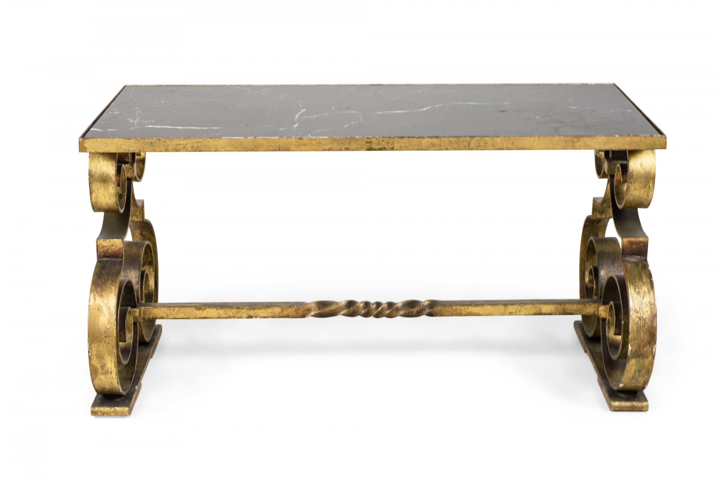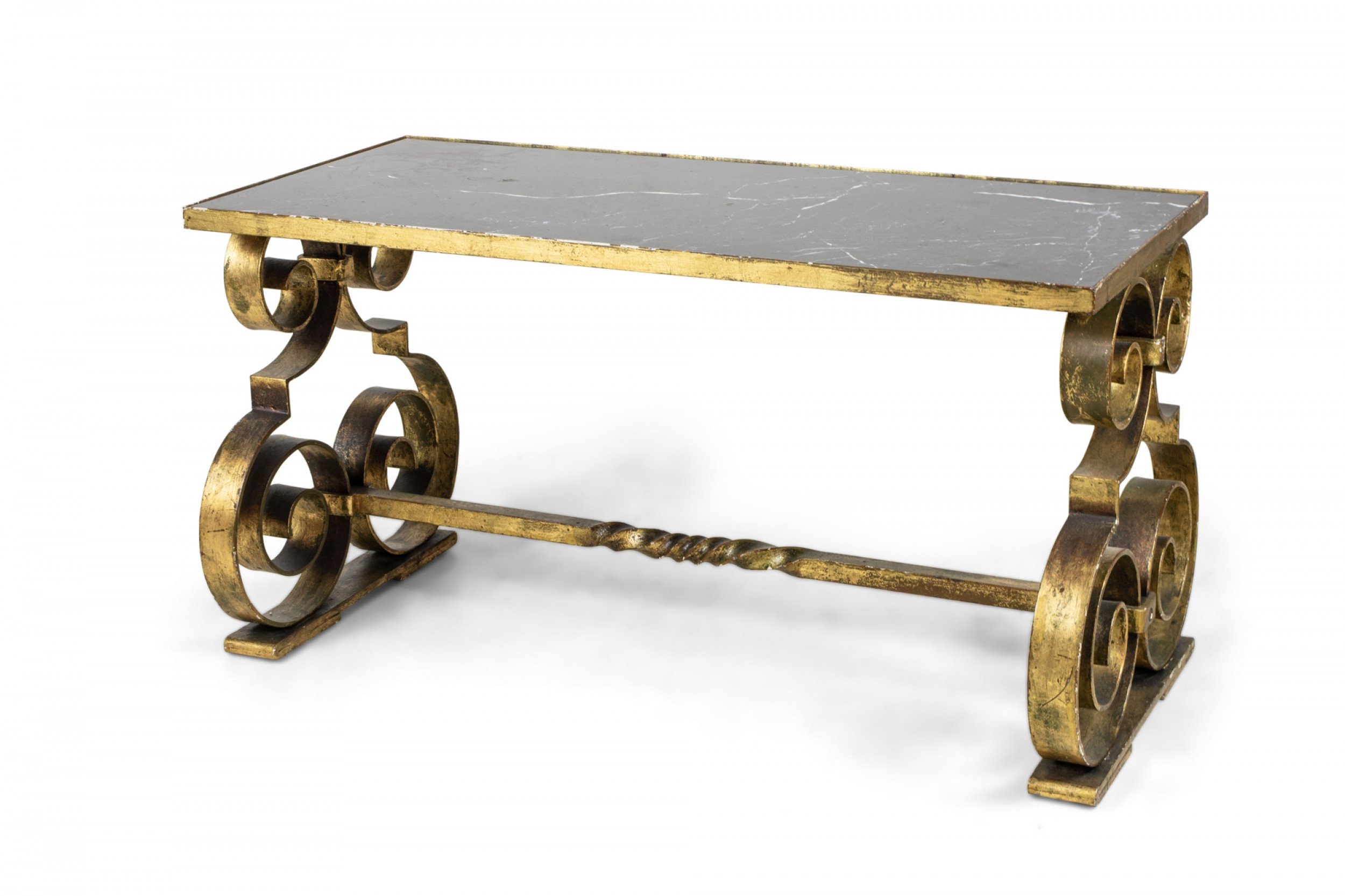French Art Deco rectangular gilt iron coffee table with double scroll shaped sides and a stretcher base, supporting an inset black marble top. (style of GILBERT POILLERAT).