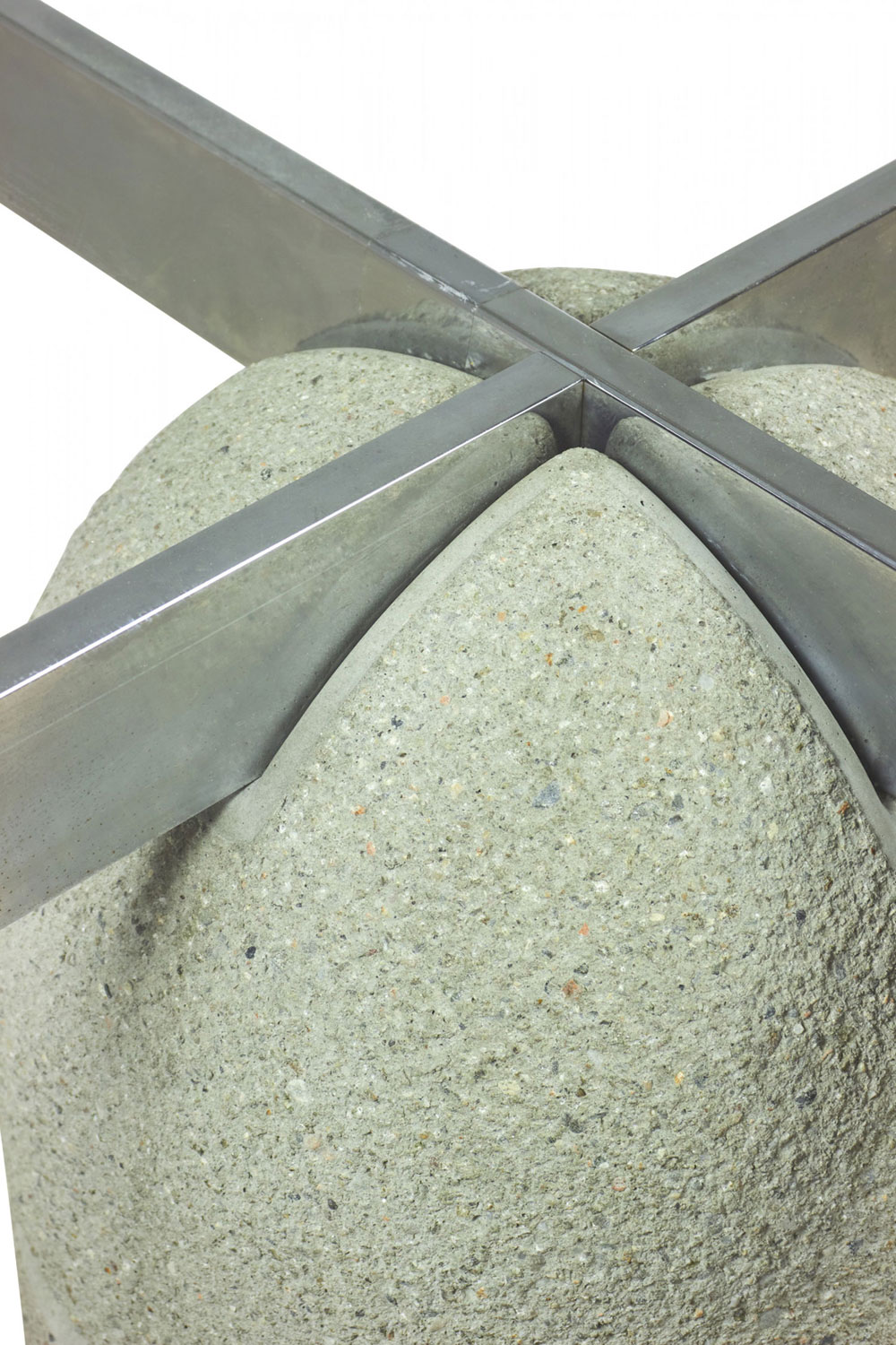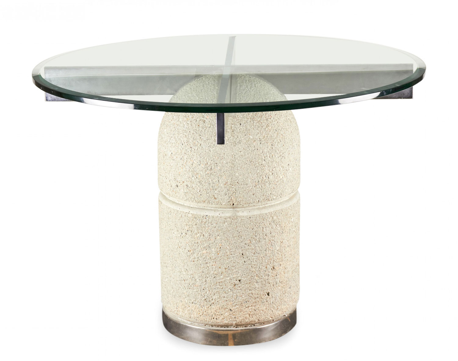 Italian Mid-Century (circa 1979) 'Paracarro' circular dining / center table with a textured concrete plinth base with an inset polished chrome support beneath a circular clear plate glass top. (GIOVANNI OFFREDI FOR SAPORITI)