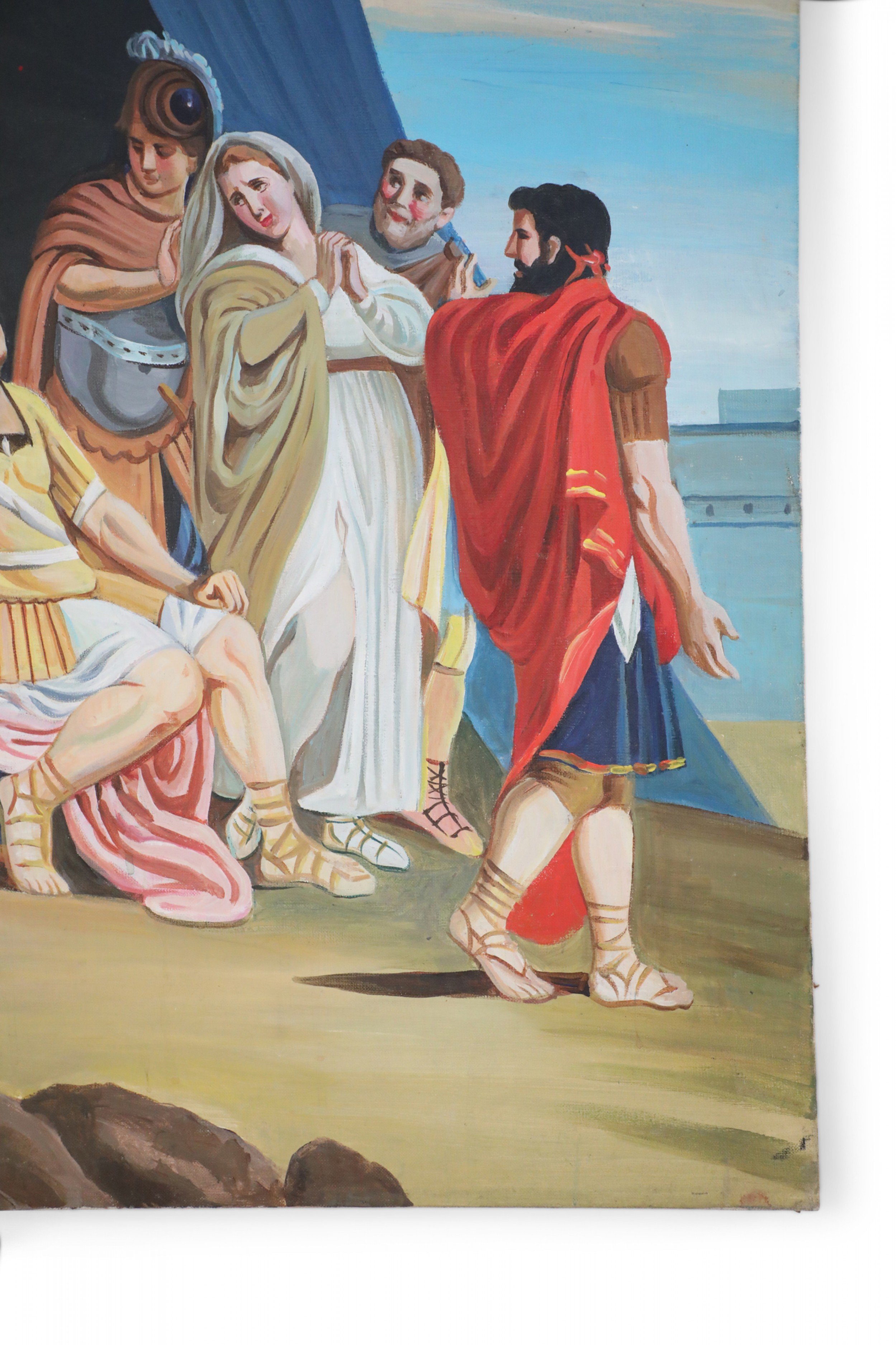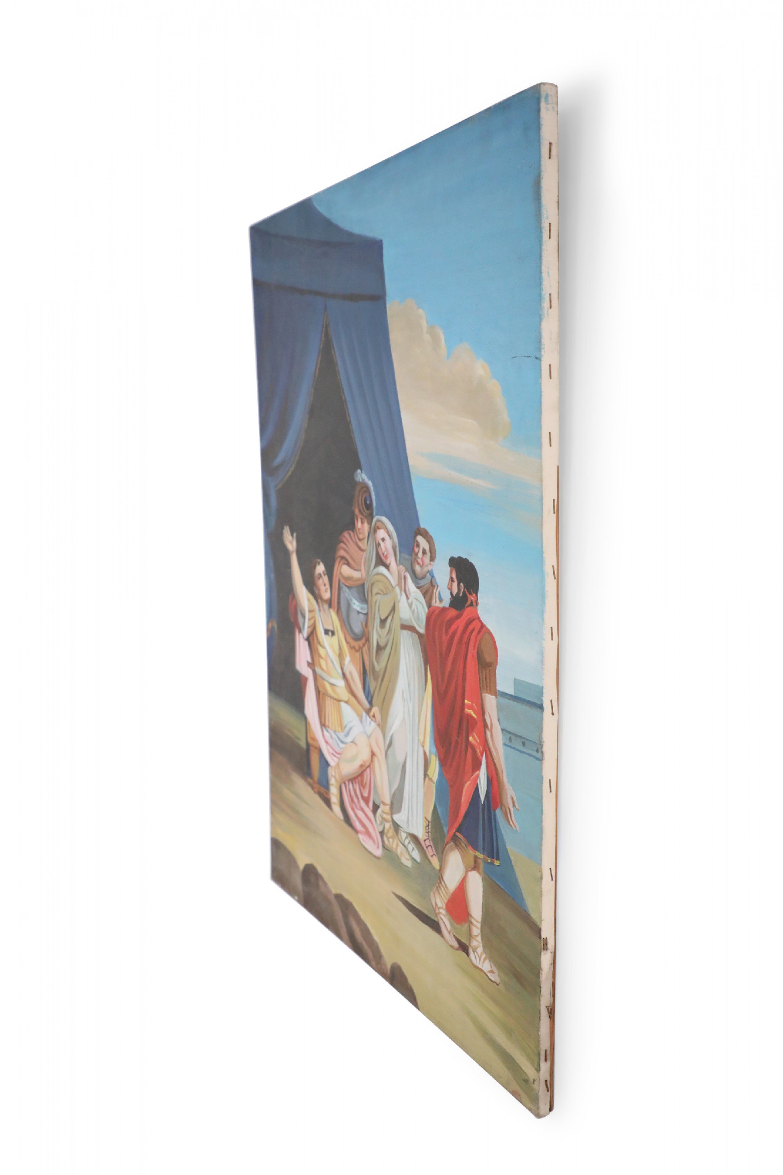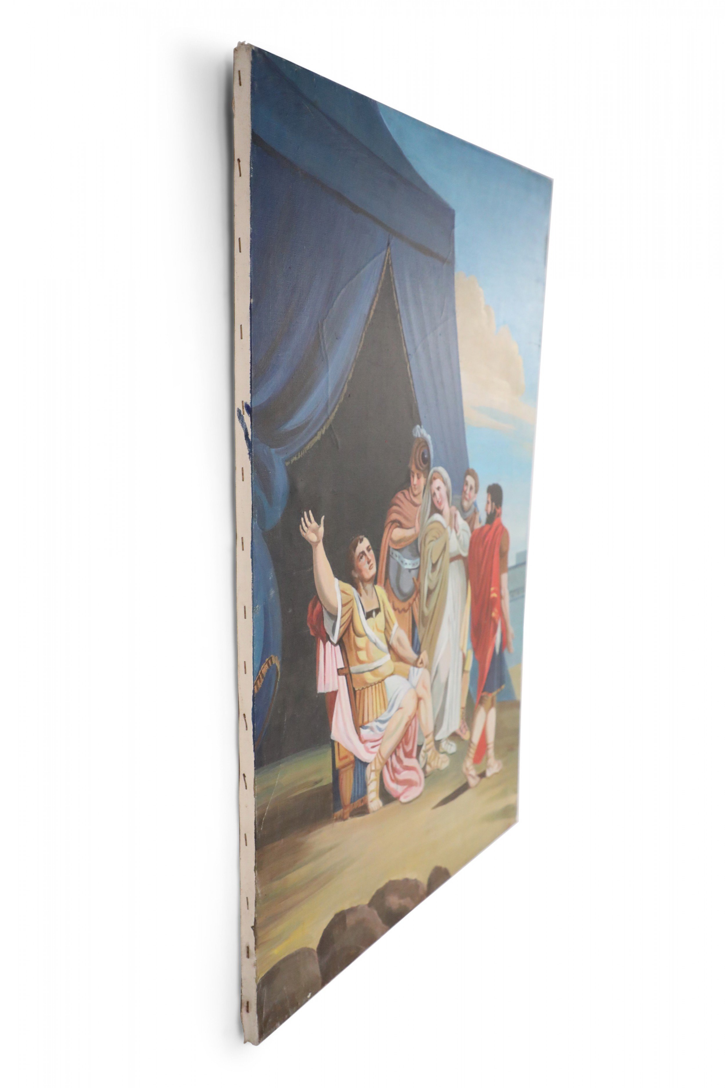 Italian Neo-classic style (20th Century) unframed canvas oil painting of a gladiator seated in front of a blue tent with gold fringed drapes, making a grand gesture while four others look on adoringly (Similar painting in slightly muted colors: NWL2287A)..