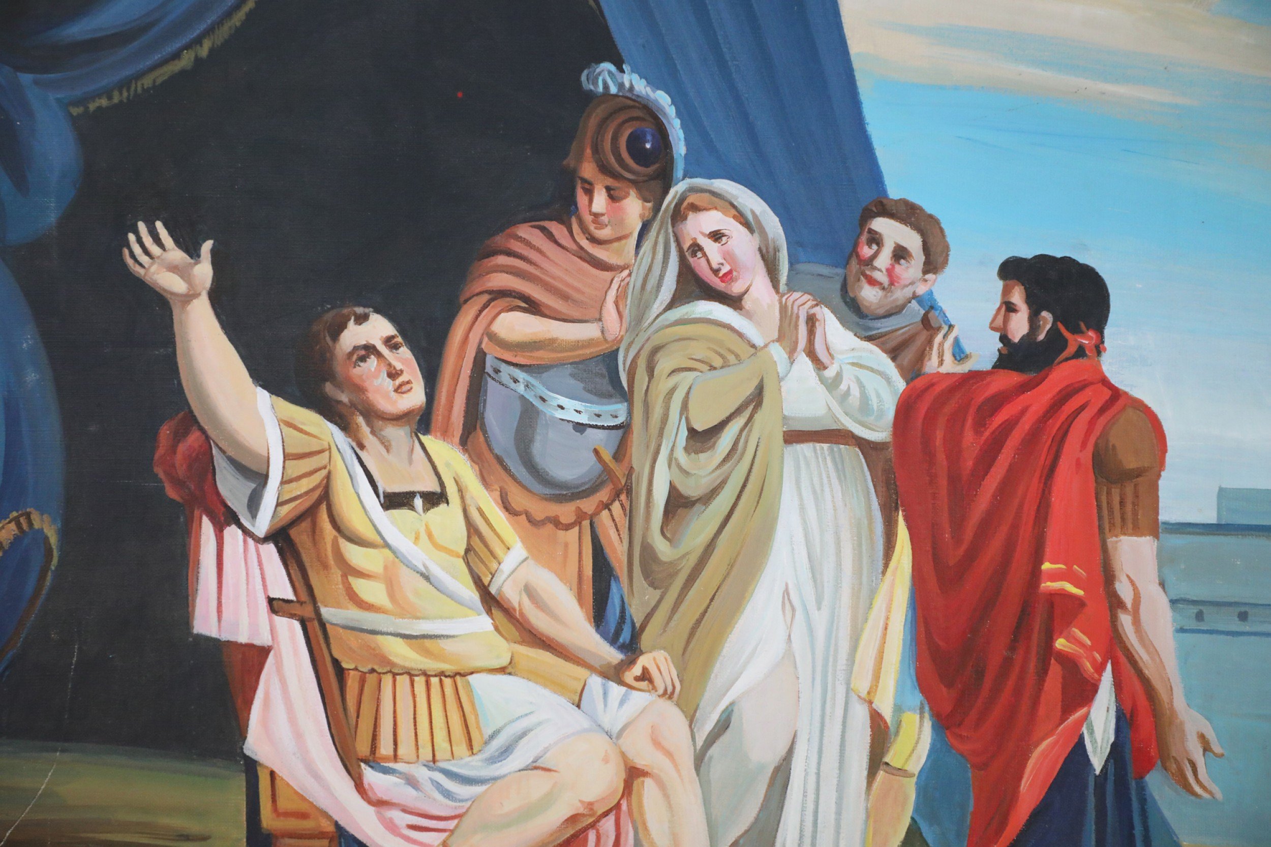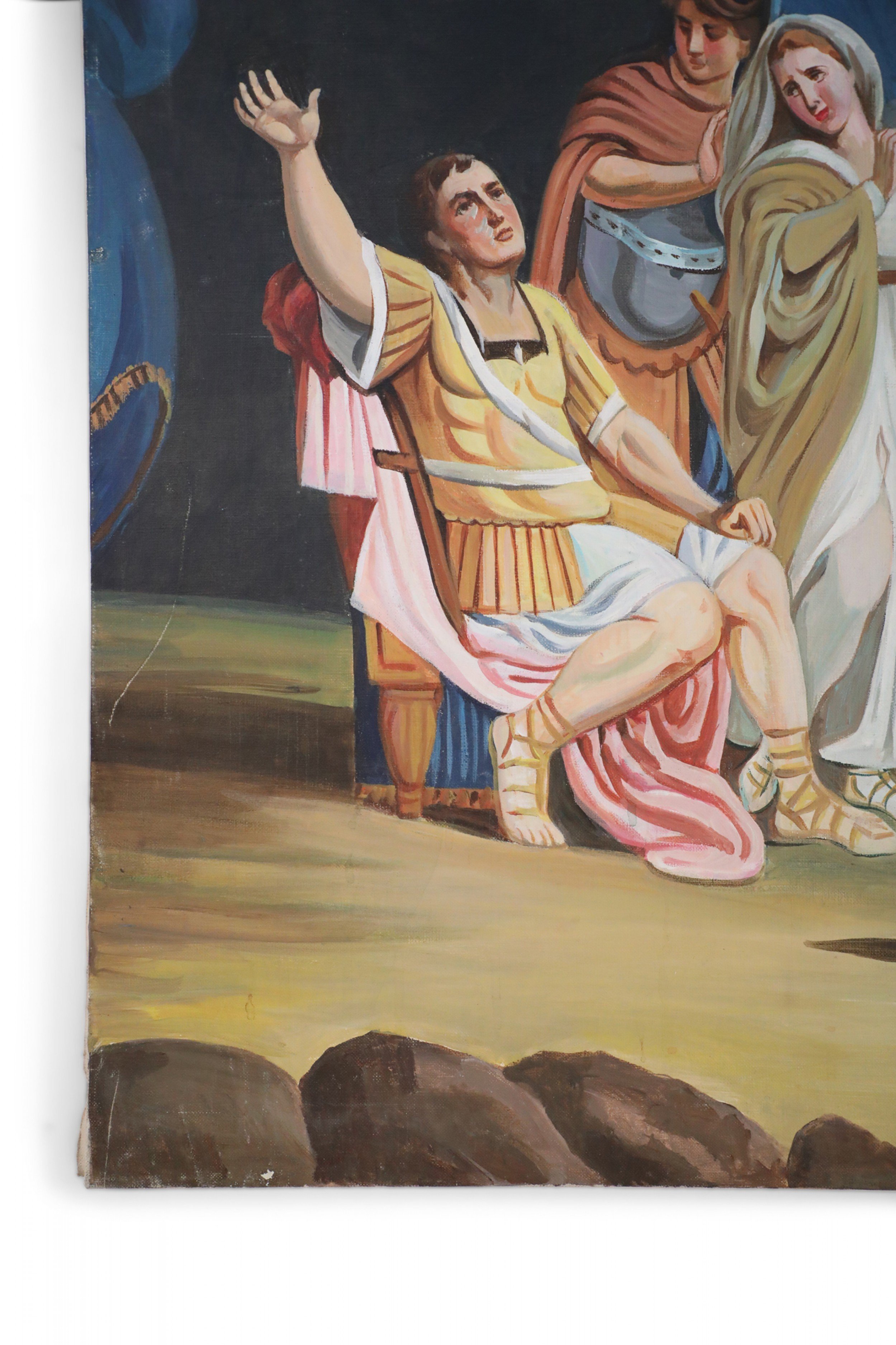 Italian Neo-classic style (20th Century) unframed canvas oil painting of a gladiator seated in front of a blue tent with gold fringed drapes, making a grand gesture while four others look on adoringly (Similar painting in slightly muted colors: NWL2287A).
