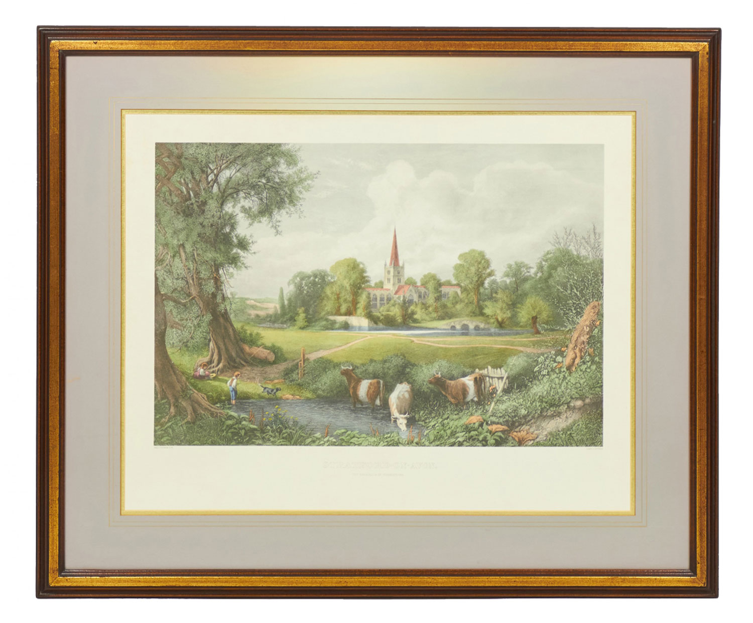 English Victorian-style print of a painting of a pastoral scene with a steeple rising above the trees in the background and grazing cattle drinking from a stream in the foreground while two children play with a dog to the side in a rectangular wooden frame and light gray mat. (similar items 062902-062921)