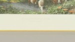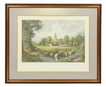 English Victorian-style print of a painting of a pastoral scene with a steeple rising above the trees in the background and grazing cattle drinking from a stream in the foreground while two children play with a dog to the side in a rectangular wooden frame and light gray mat. (similar items 062902-062921).