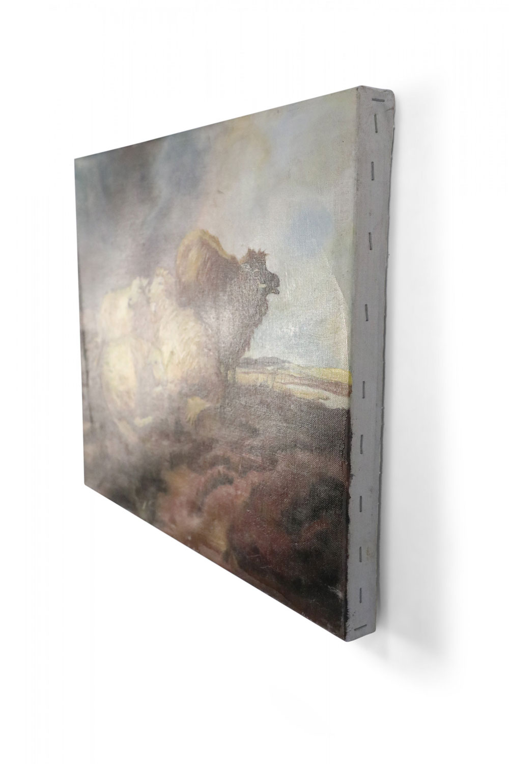 English Victorian style (20th Century) oil painting capturing a group of sheep huddled in a field of browns and greens, under a cloudy, darkening sky on rectangular, unframed canvas (Similar copies of same piece with minor variations: NWL2263A, NWL2263B)..