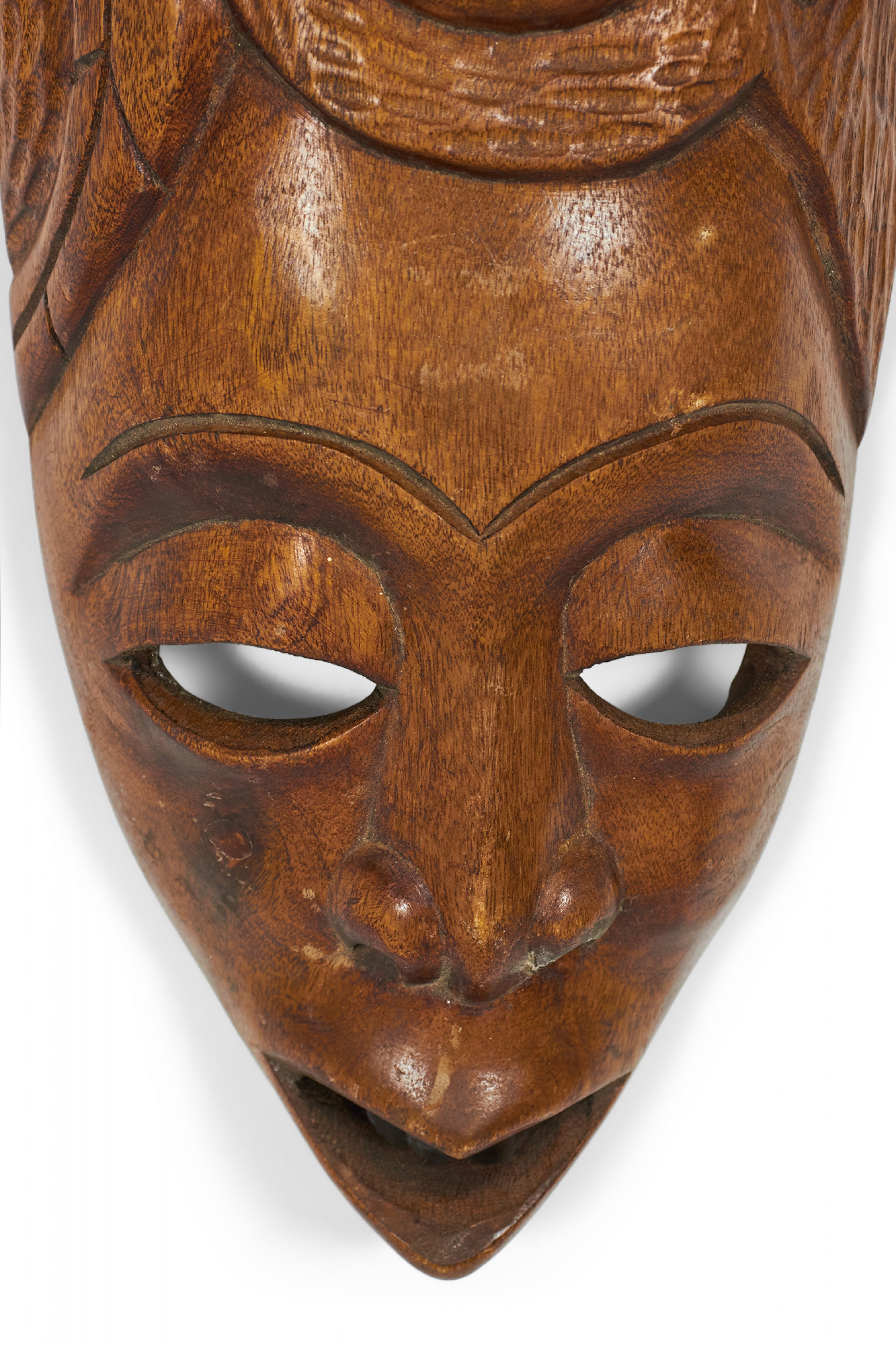 Vintage Haitian carved hardwood mask depicting a human face with open mouth wearing a headdress incorporating a coiled snake.