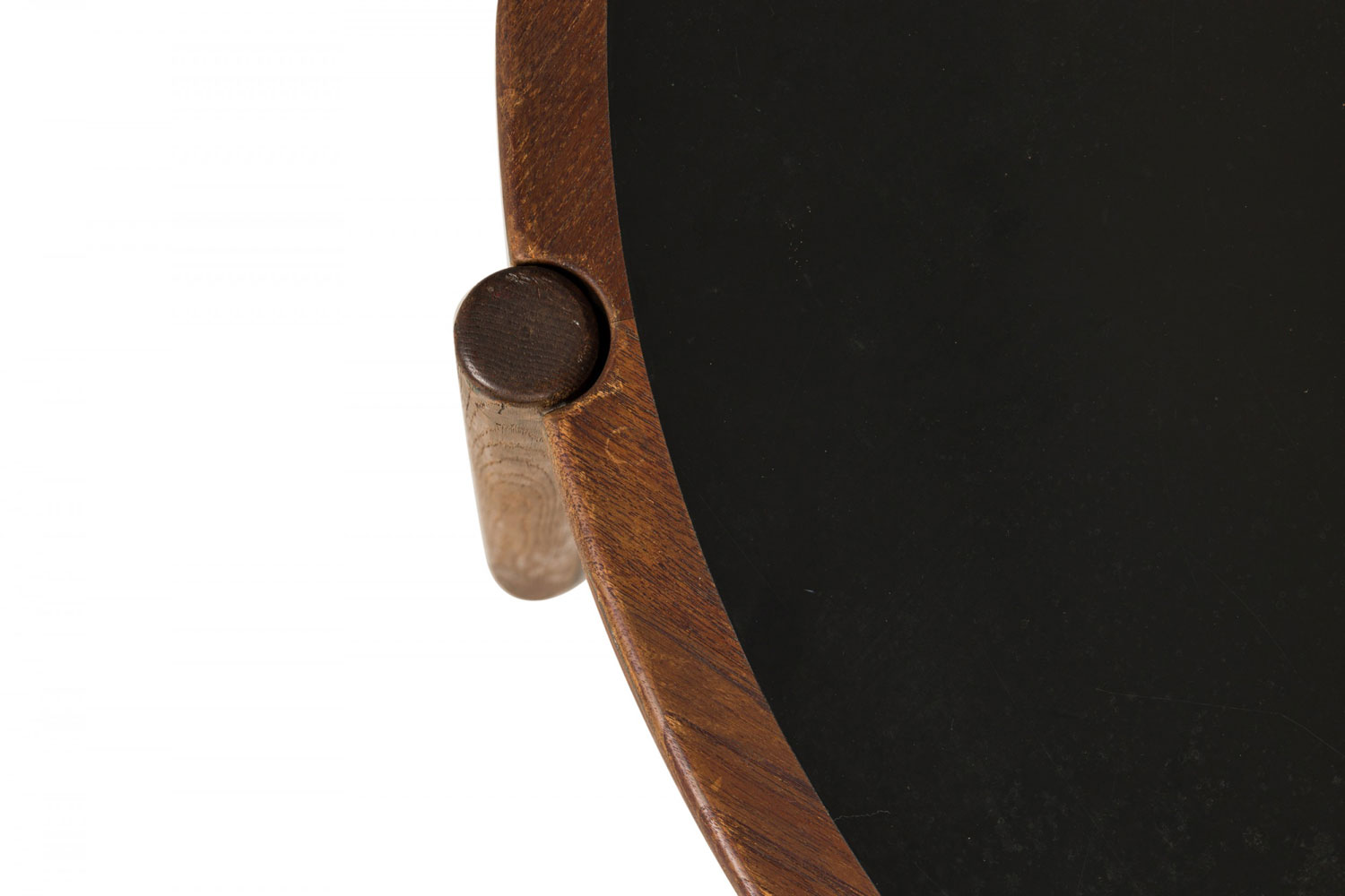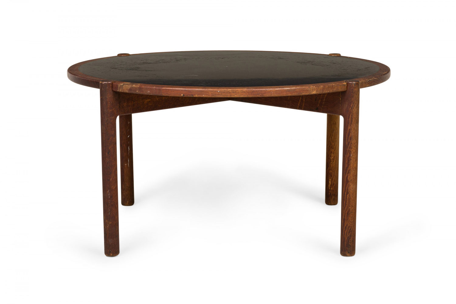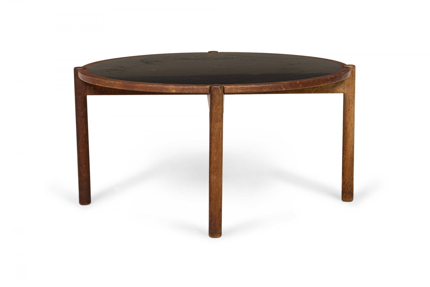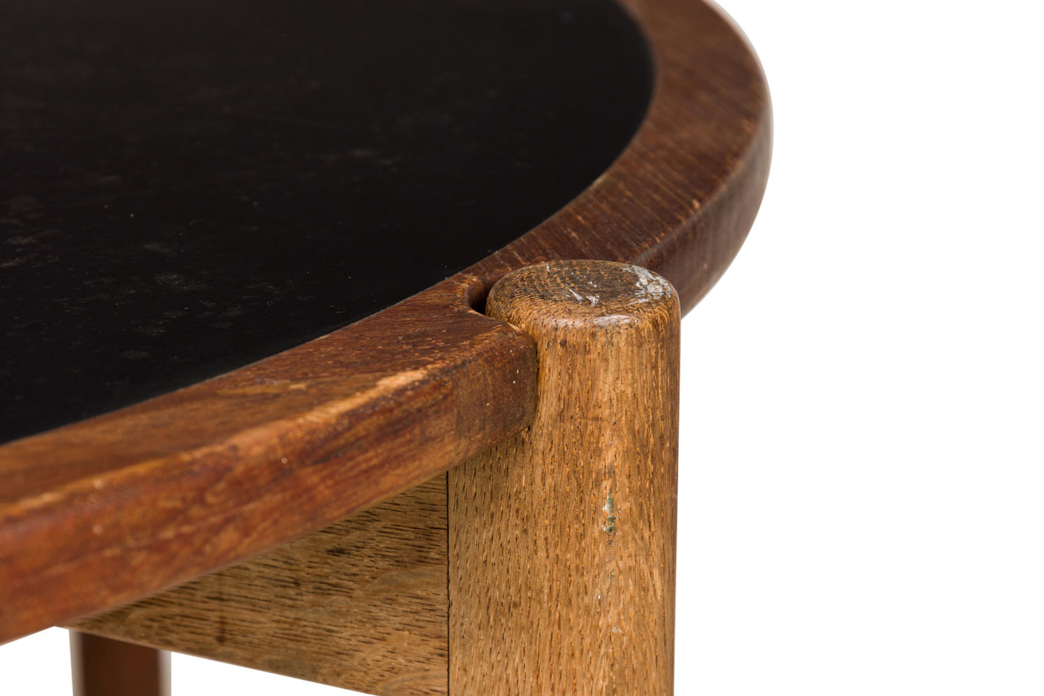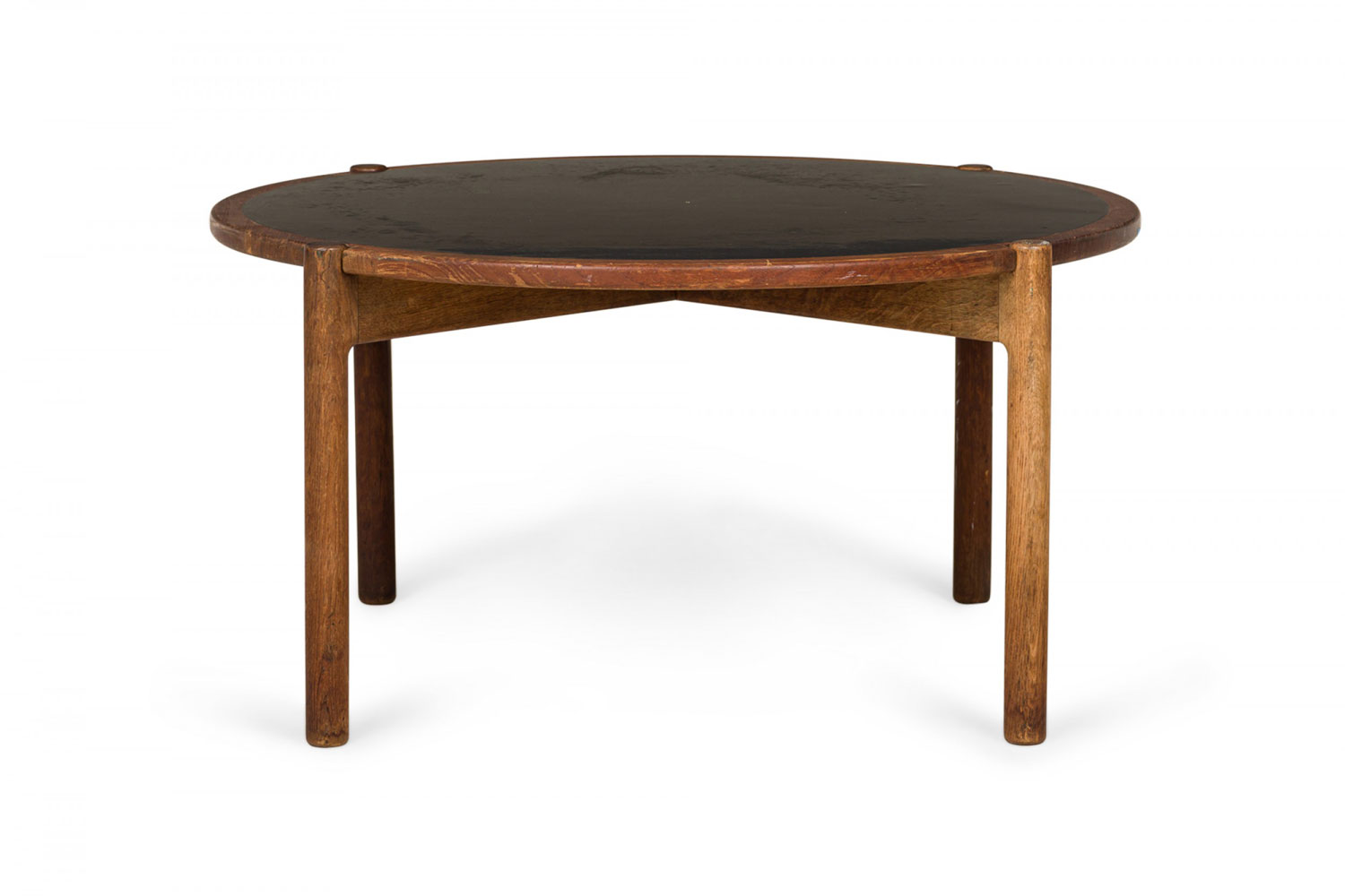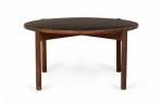 Danish Mid-Century coffee / cocktail table with a circular reversible top with a black laminate surface on one side and a solid teak surface on the reverse, resting on four round teak legs. (HANS WEGNER / JOHANNES HANSEN)