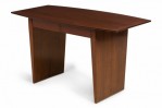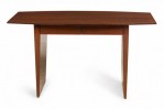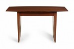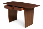 American Mid-Century polished walnut table desk with a 'boat' form top resting on a bracket-shaped walnut base. (HARVEY PROBBER).