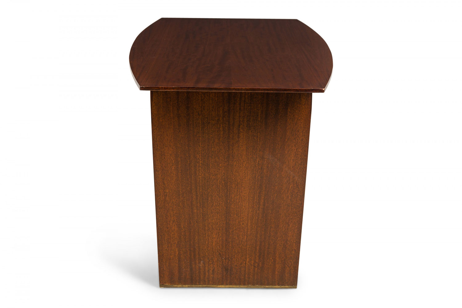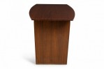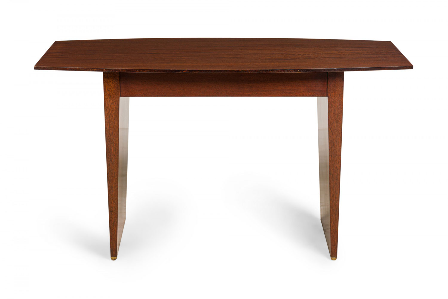 American Mid-Century polished walnut table desk with a 'boat' form top resting on a bracket-shaped walnut base. (HARVEY PROBBER)