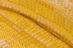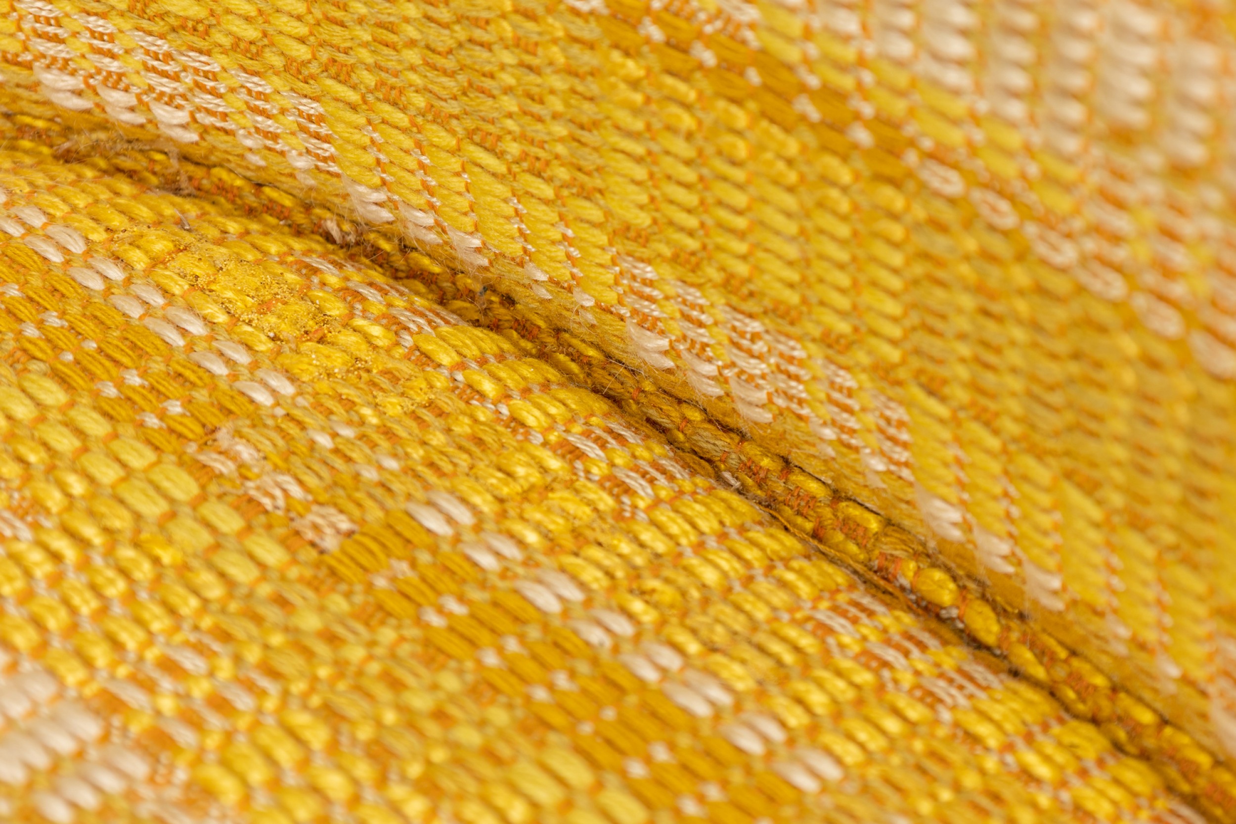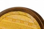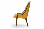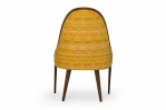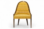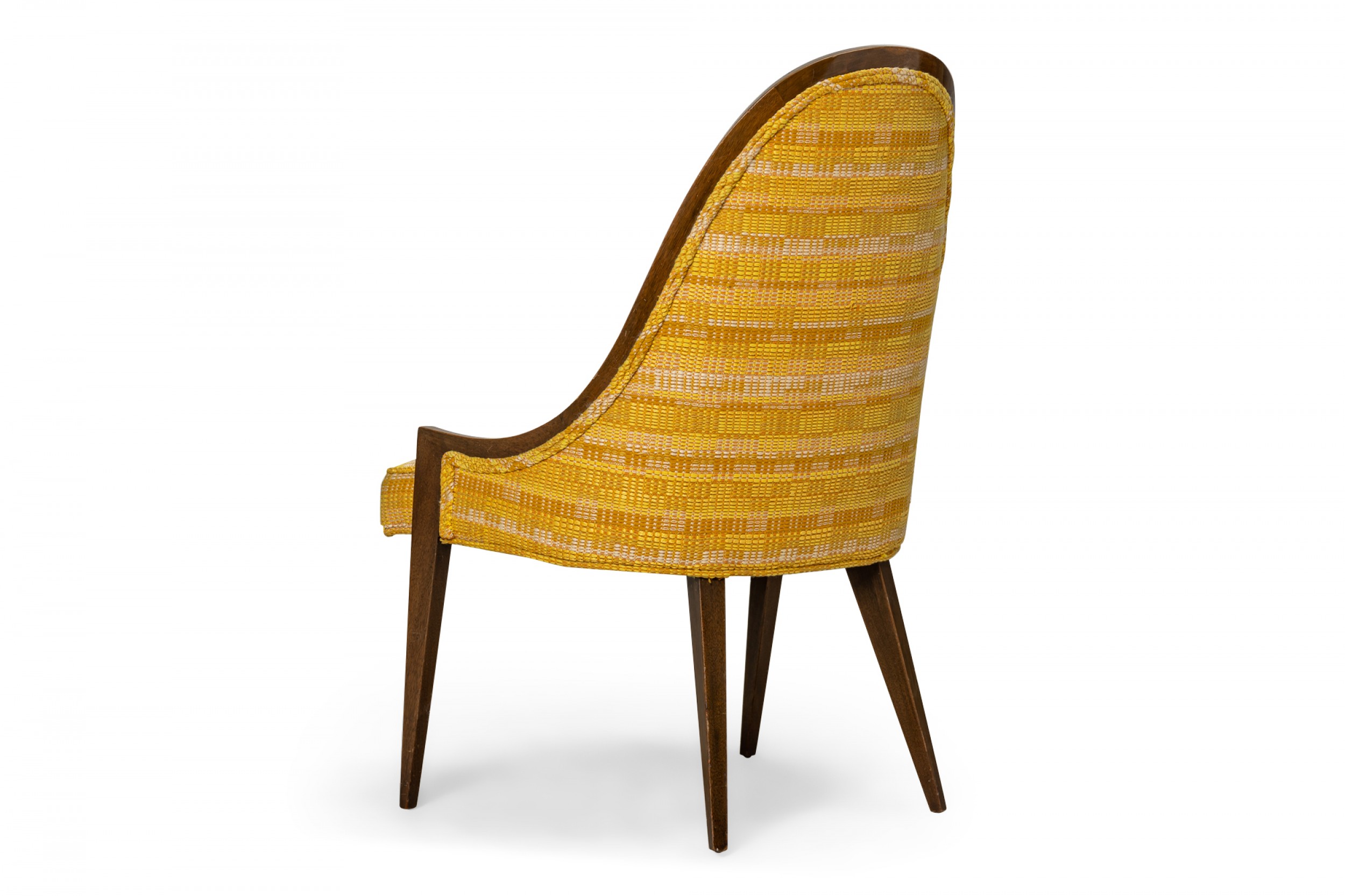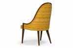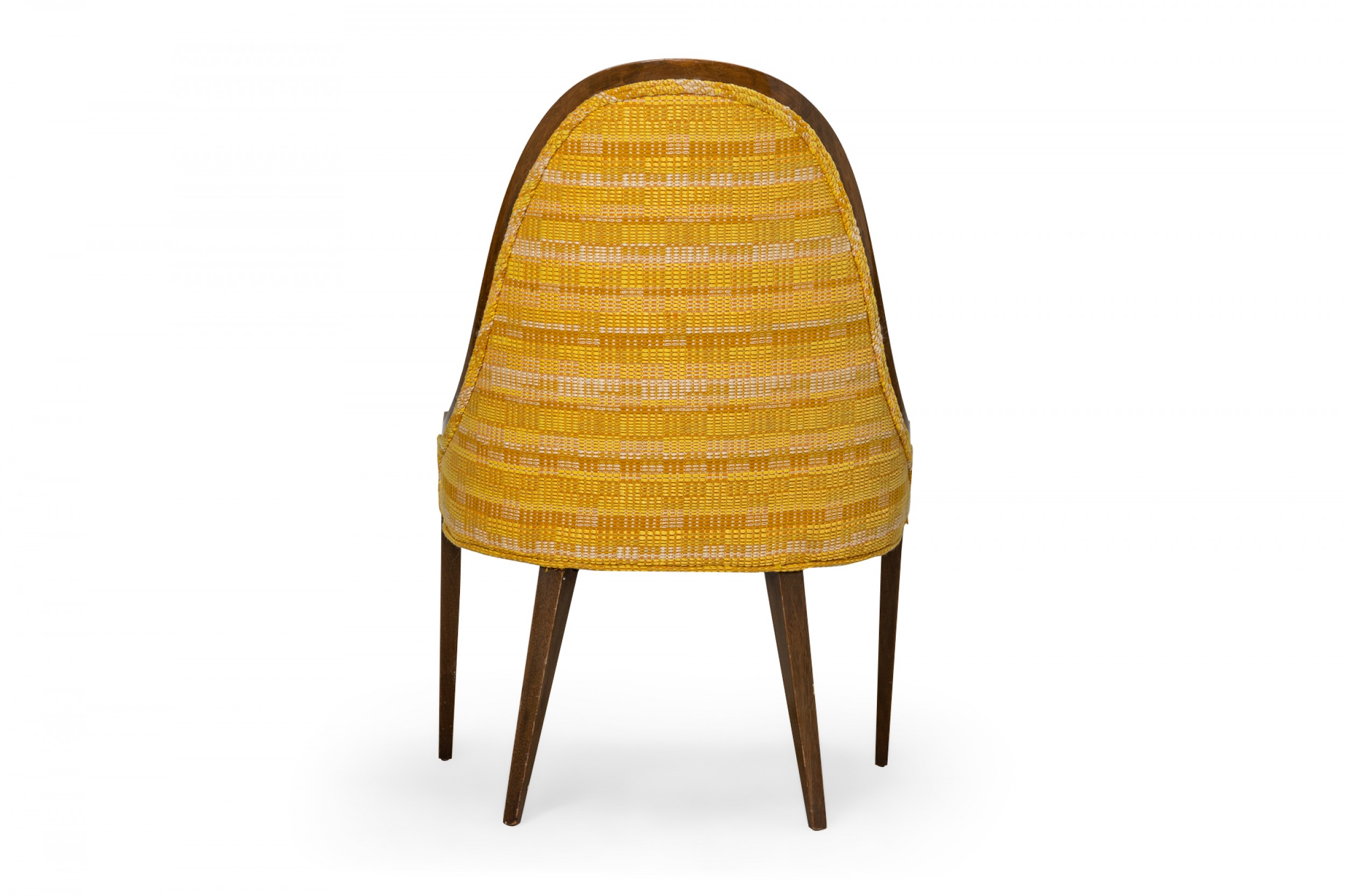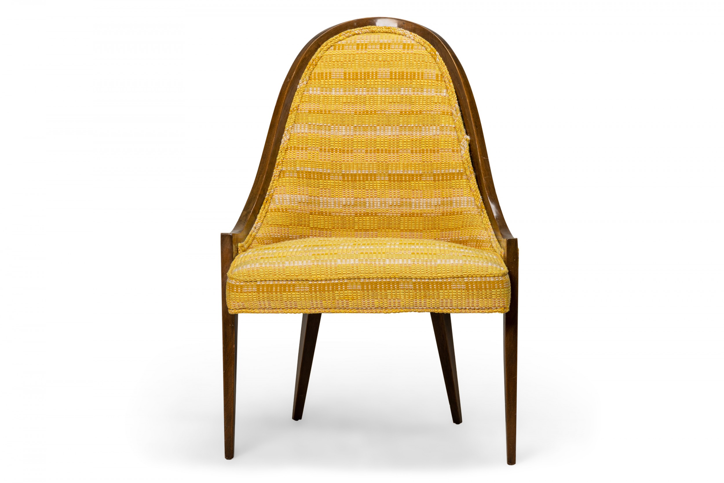 American Mid-Century 'Gondola' pull up / side chair with a curved light mahogany frame and gold woven fabric upholstered seat back and cushion, resting on four tapered mahogany dowel legs. (HARVEY PROBBER)(Similar pieces: DUF0423-DUF0426).