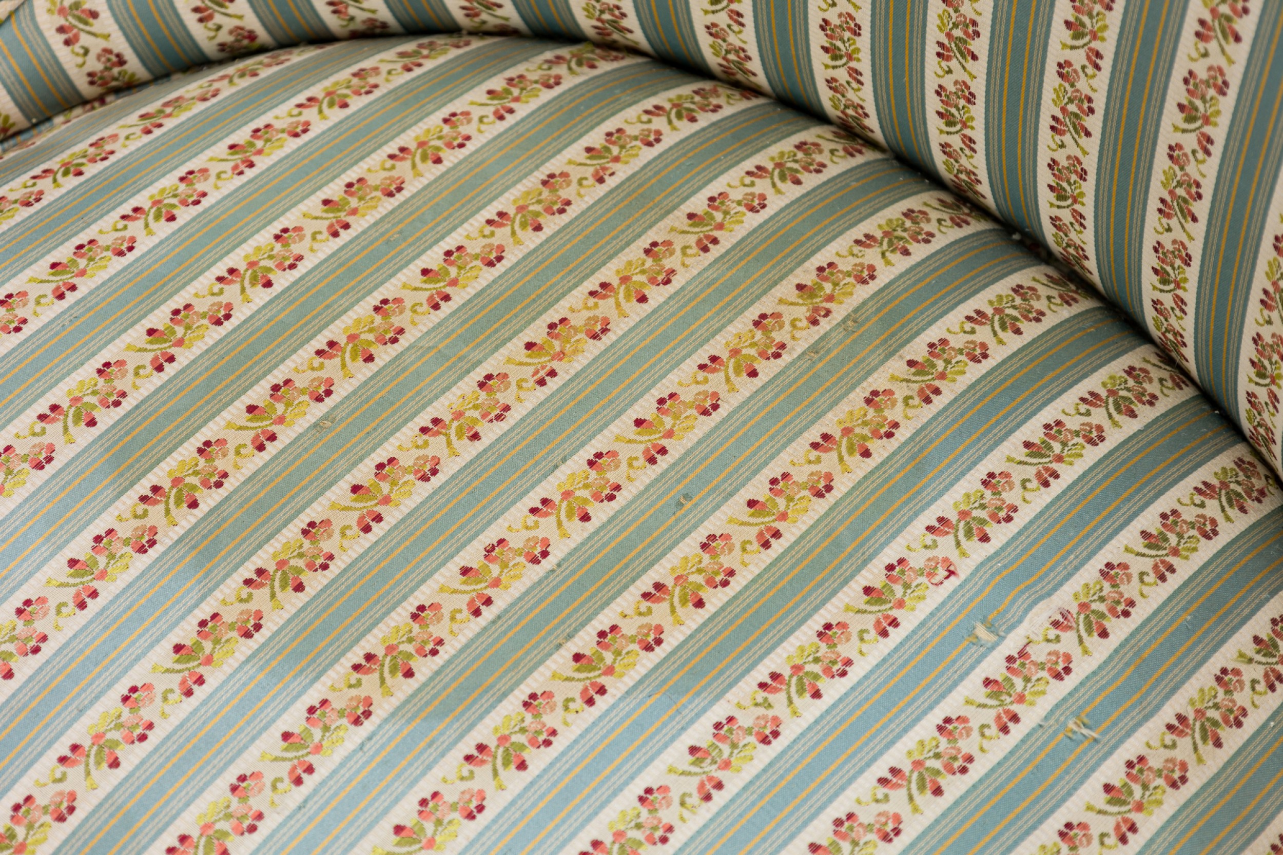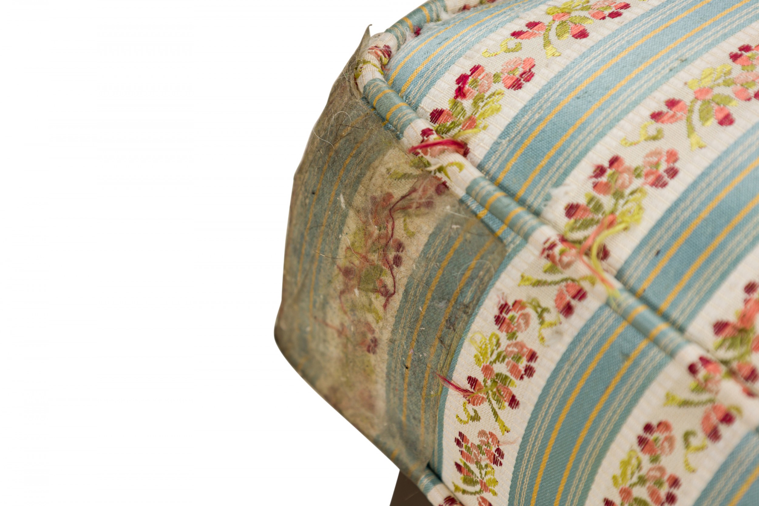 Style: Mid-Century Materials & Techniques: Fabric, mahogany, upholstered, wood Category: Seating Good; Wear consistent with age and use