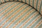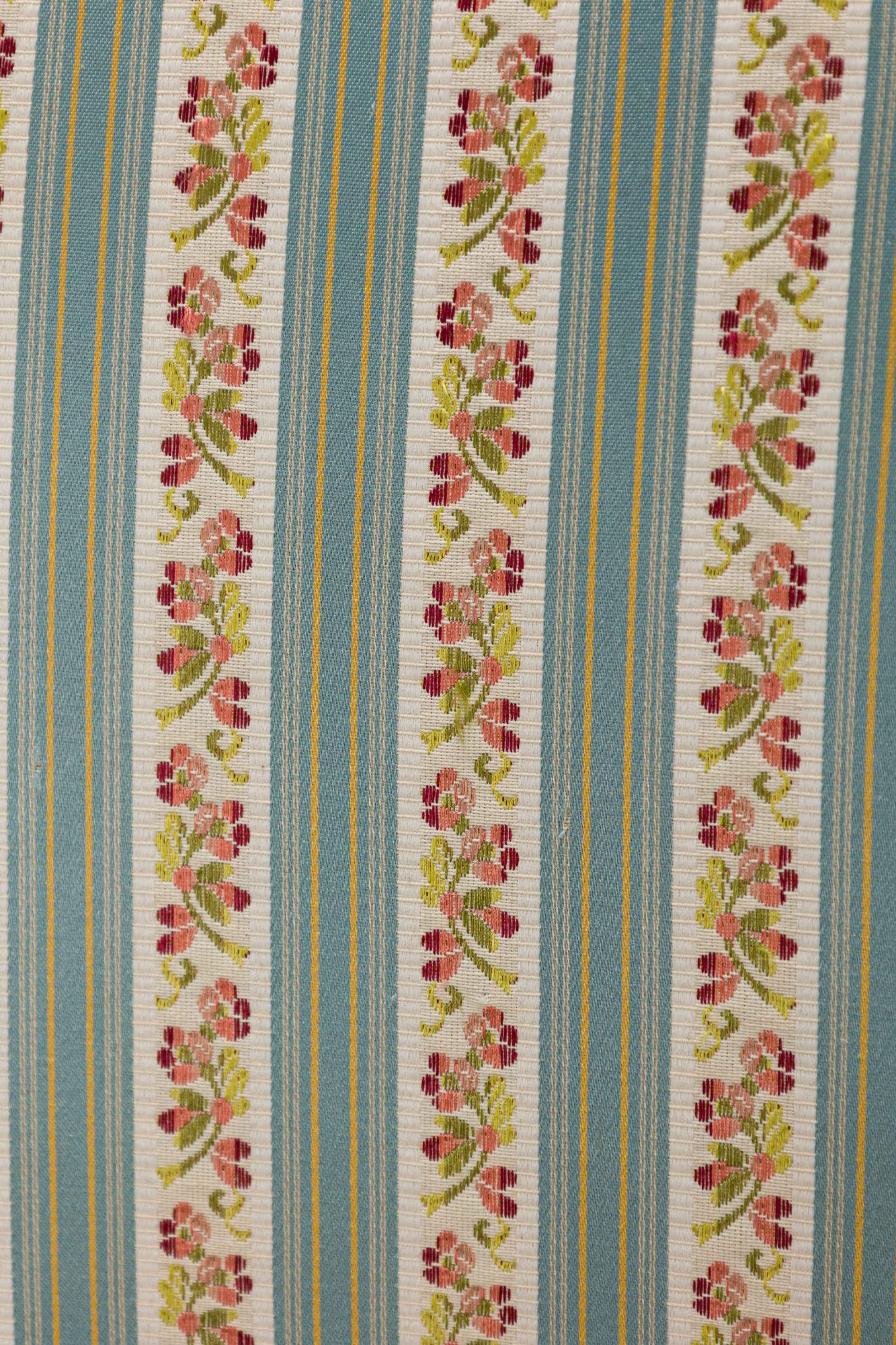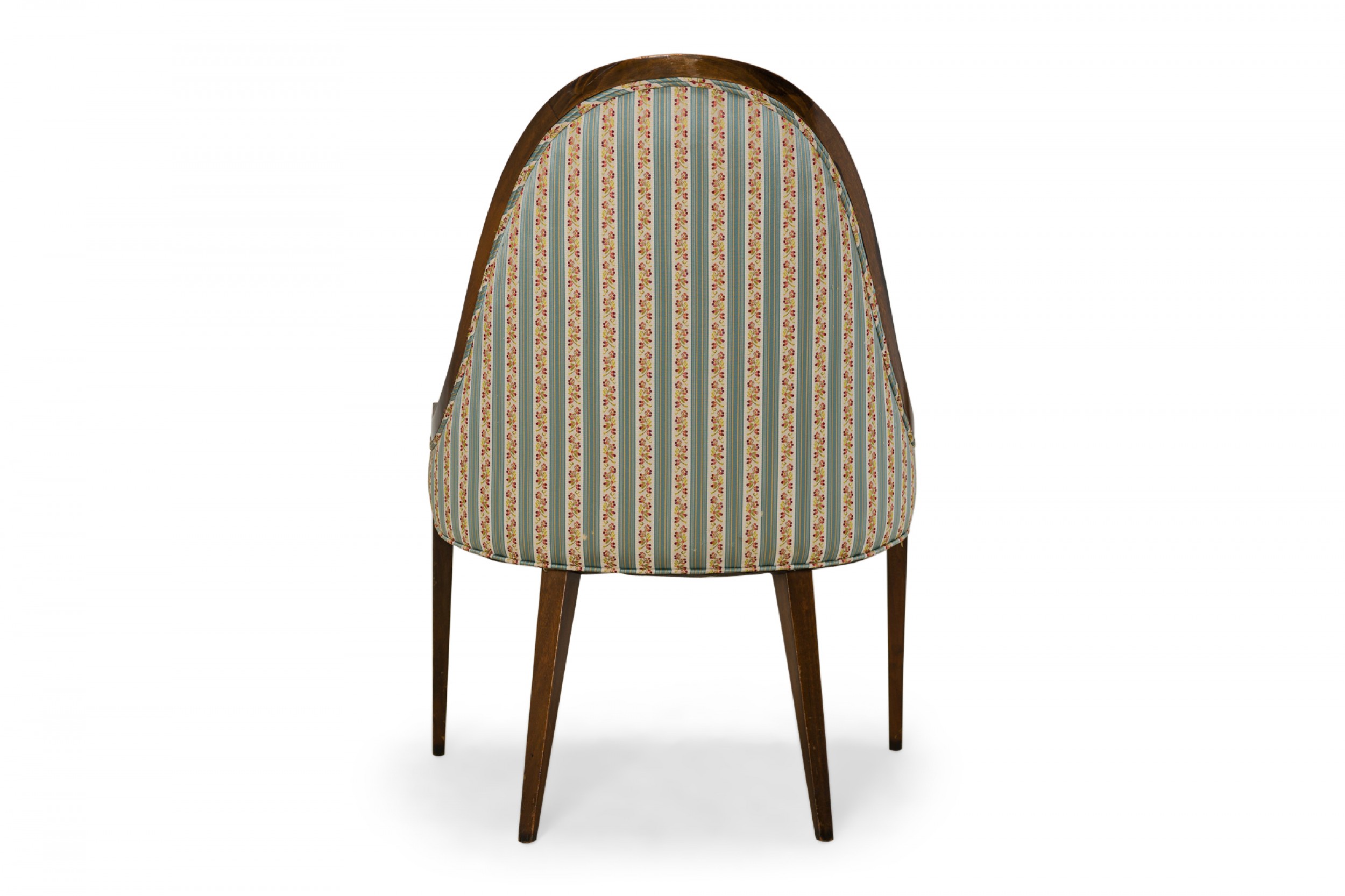 American Mid-Century 'Gondola' pull up / side chair with a curved mahogany frame and blue and beige and pink striped fabric upholstered seat backs and cushions, resting on four tapered mahogany dowel legs. (HARVEY PROBBER)(Similar pieces: DUF0423-DUF0425).