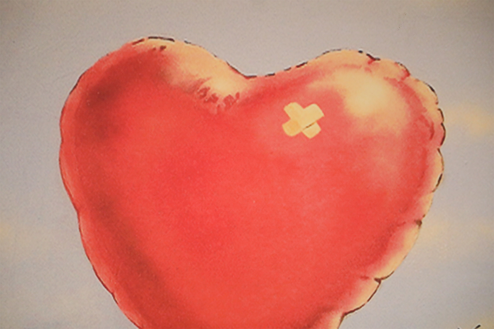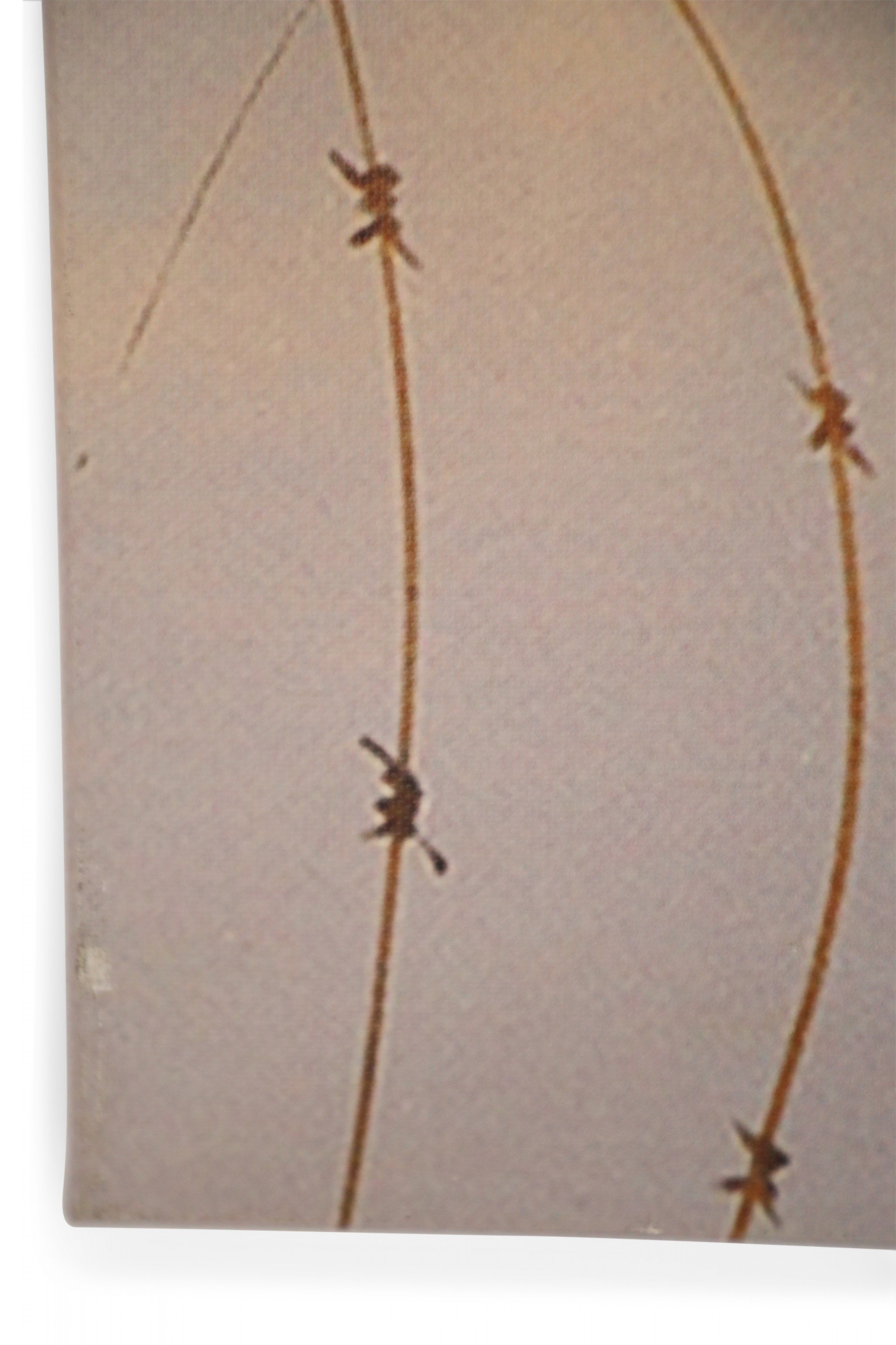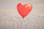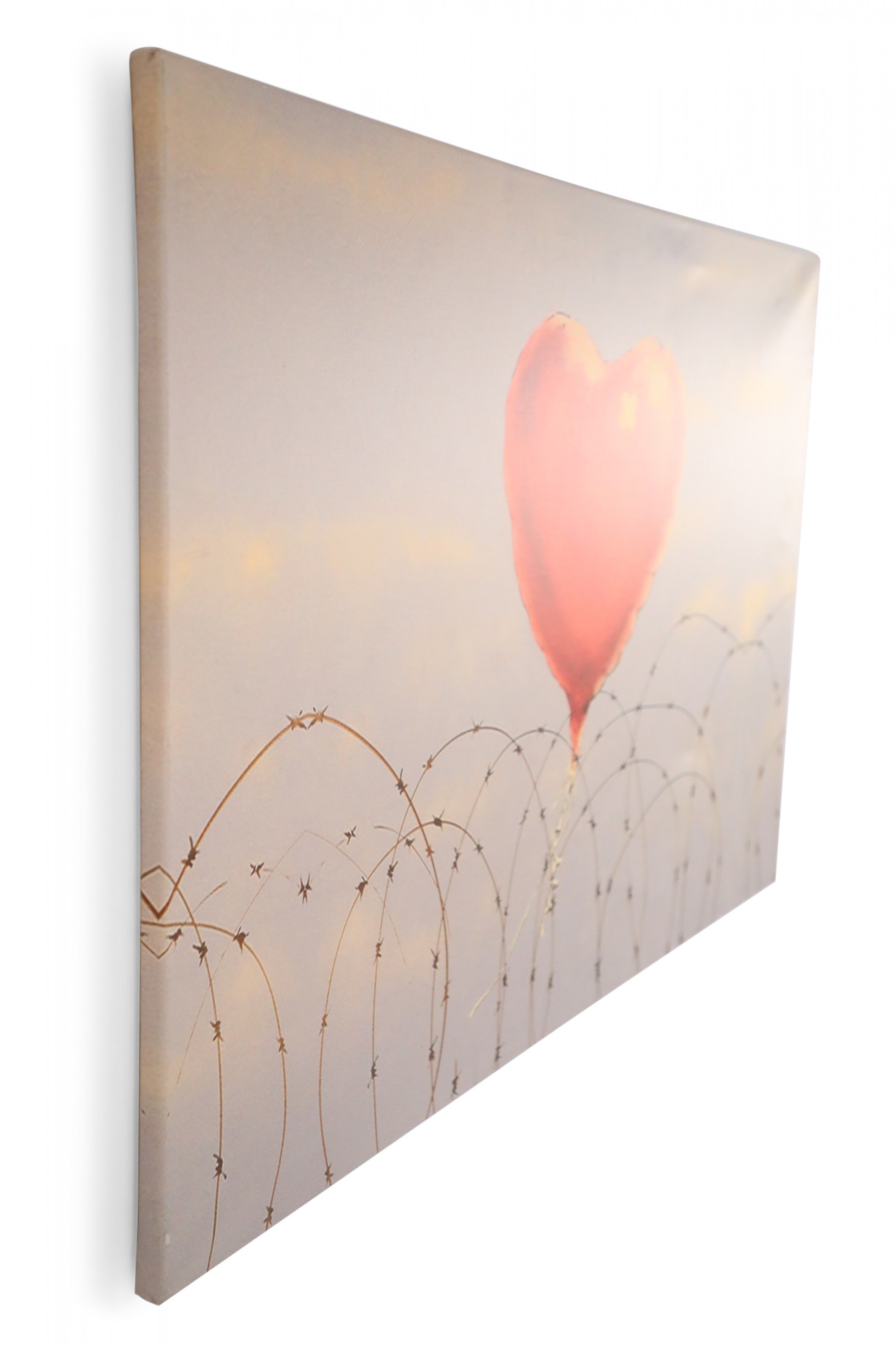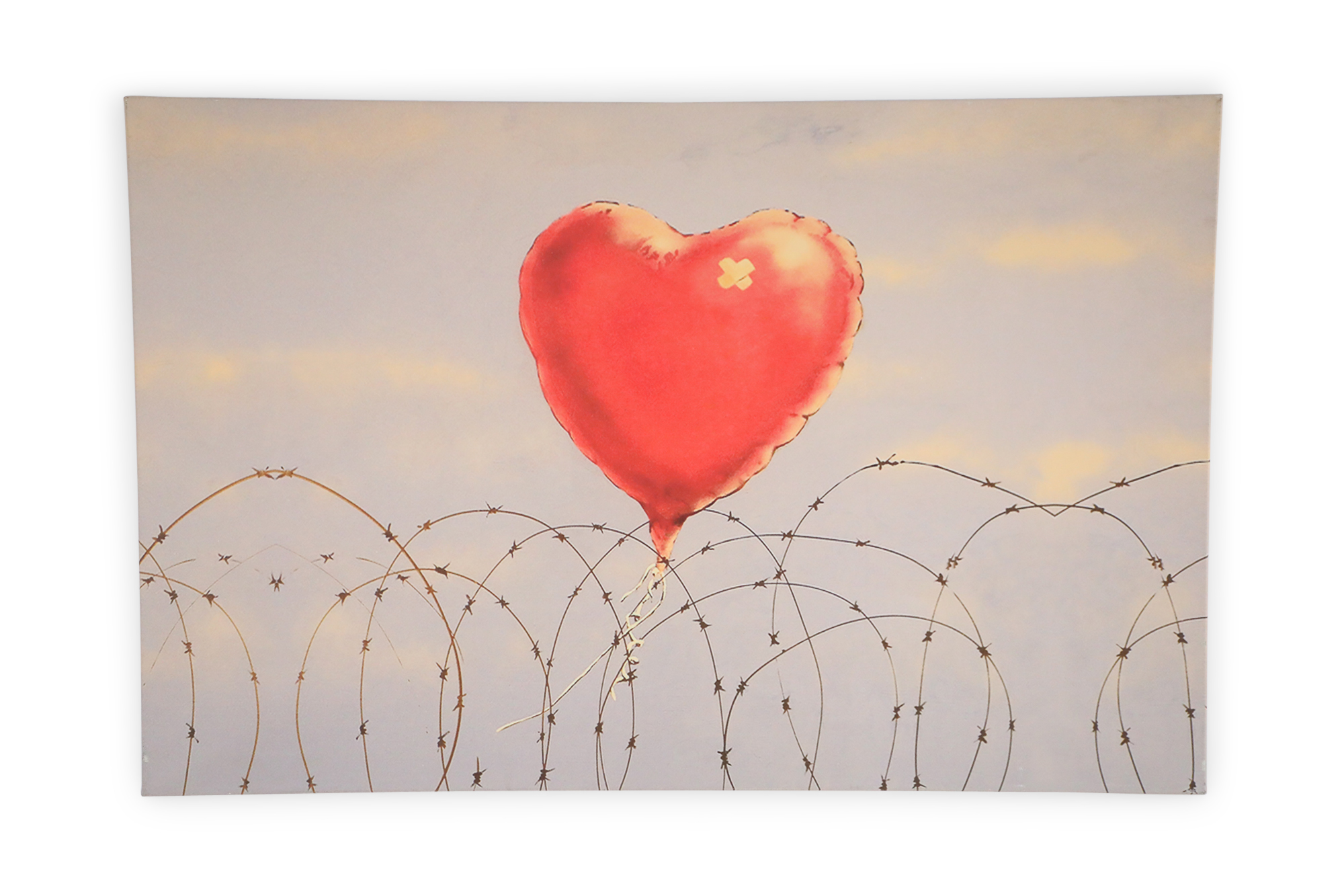 Contemporary (20th Century) rectangular giclee print on canvas depicting a heart, mylar balloon with bandaids forming an "x"" in its upper right corner, caught on a tangle of barbed wire against a subdued sky..