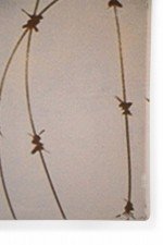 Contemporary (20th Century) rectangular giclee print on canvas depicting a heart, mylar balloon with bandaids forming an "x"" in its upper right corner, caught on a tangle of barbed wire against a subdued sky.