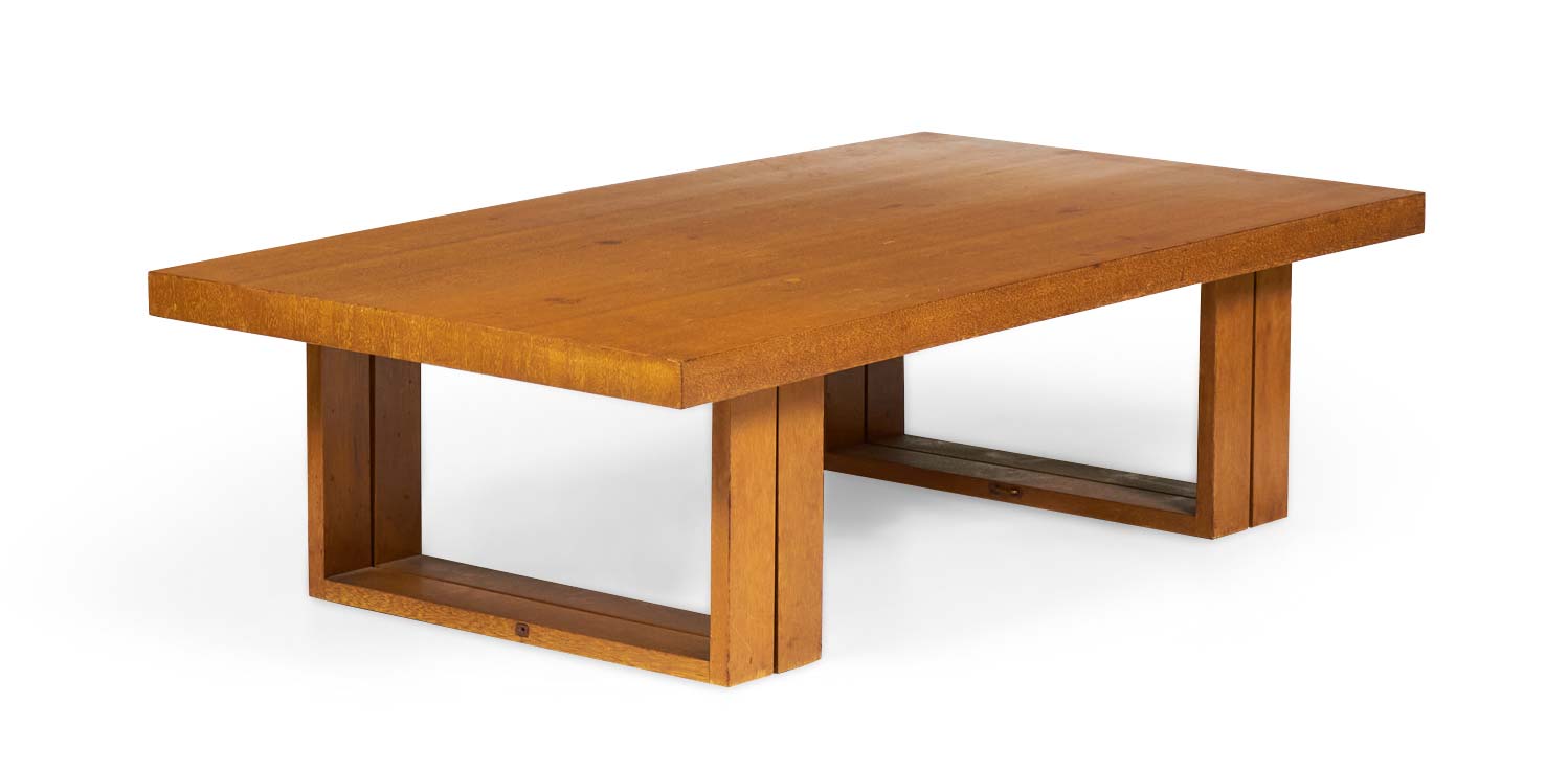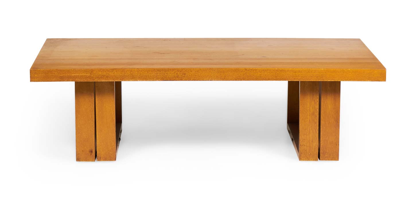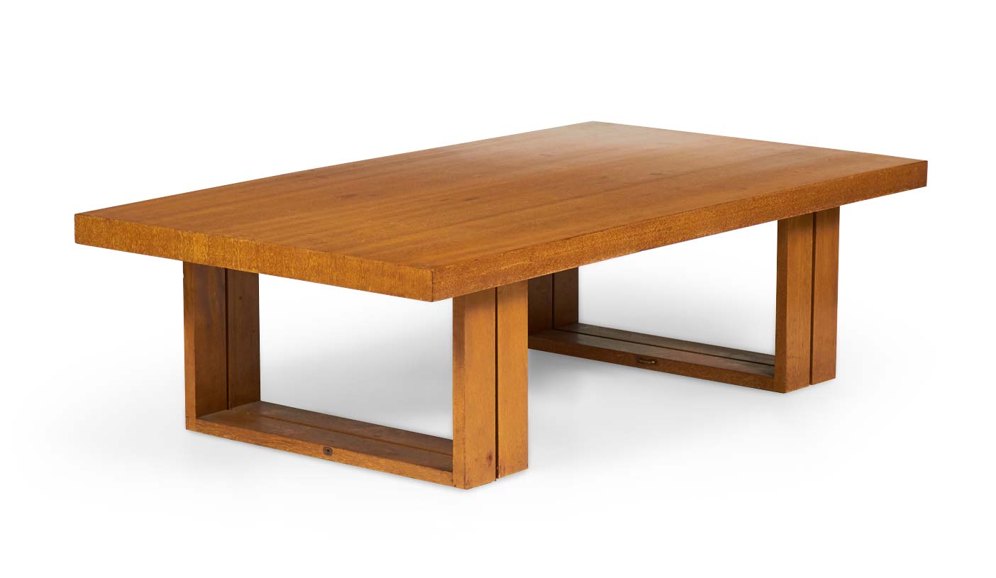 American Mid-Century (1950s) rectangular mahogany "Camel" coffee table with two double bracket-shaped legs. (VKG, HENDRIK VAN KEPPEL AND TAYLOR GREEN FOR BROWN SALTMAN)..