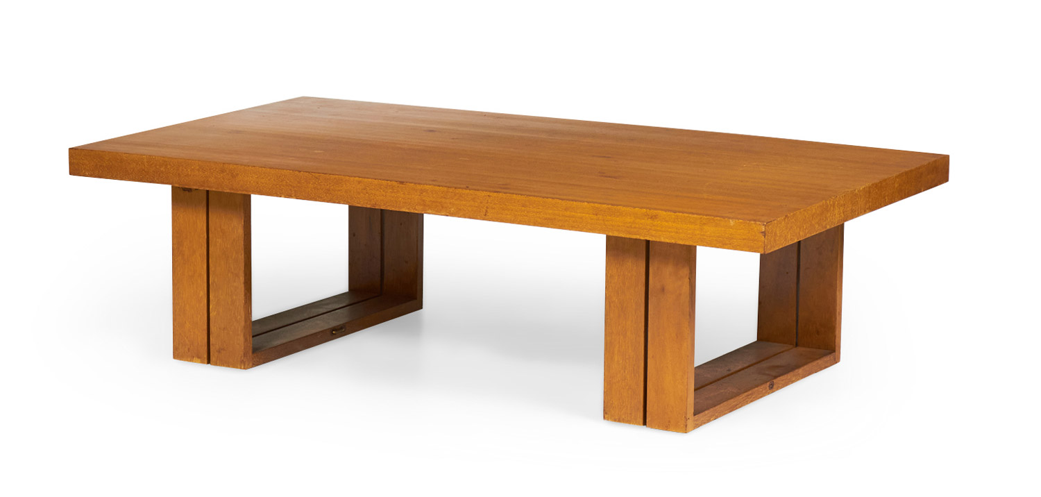 American Mid-Century (1950s) rectangular mahogany "Camel" coffee table with two double bracket-shaped legs. (VKG, HENDRIK VAN KEPPEL AND TAYLOR GREEN FOR BROWN SALTMAN).