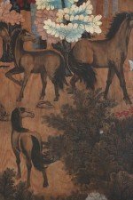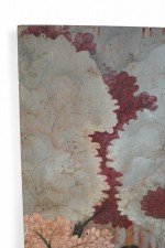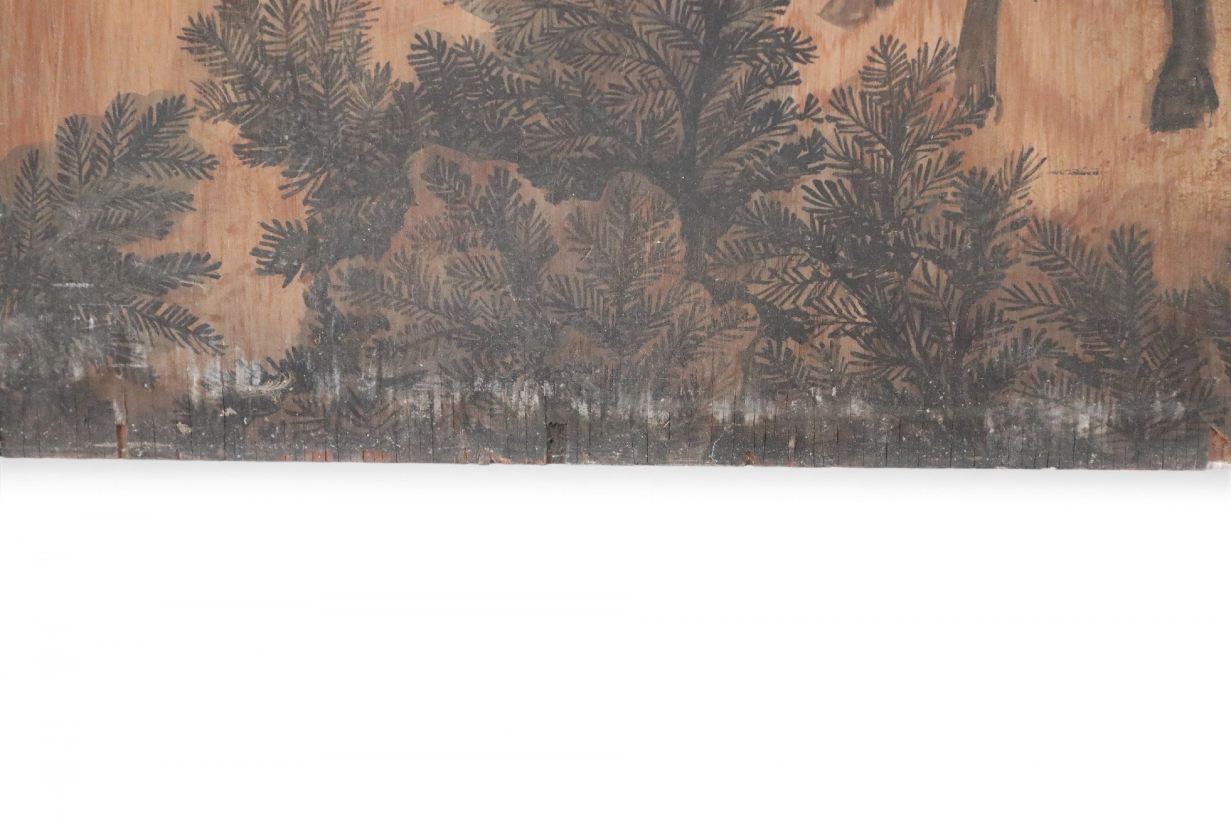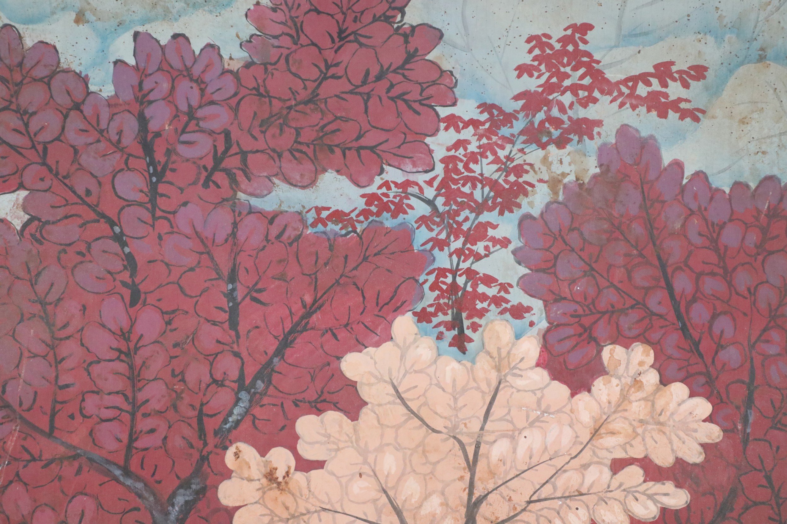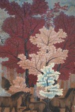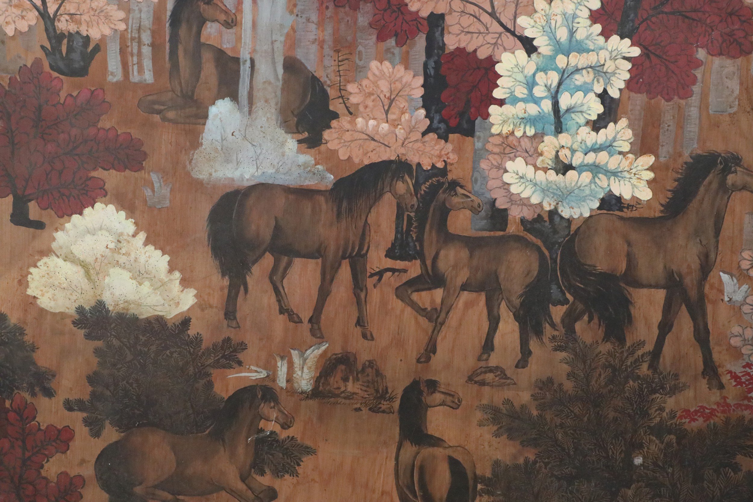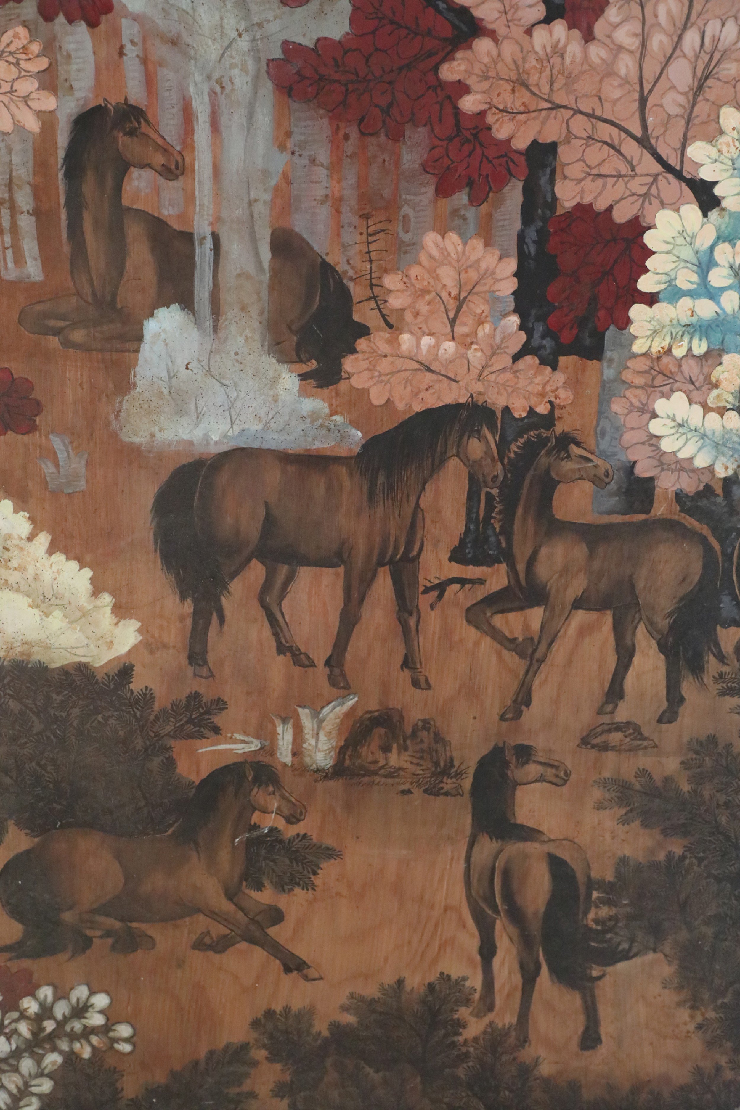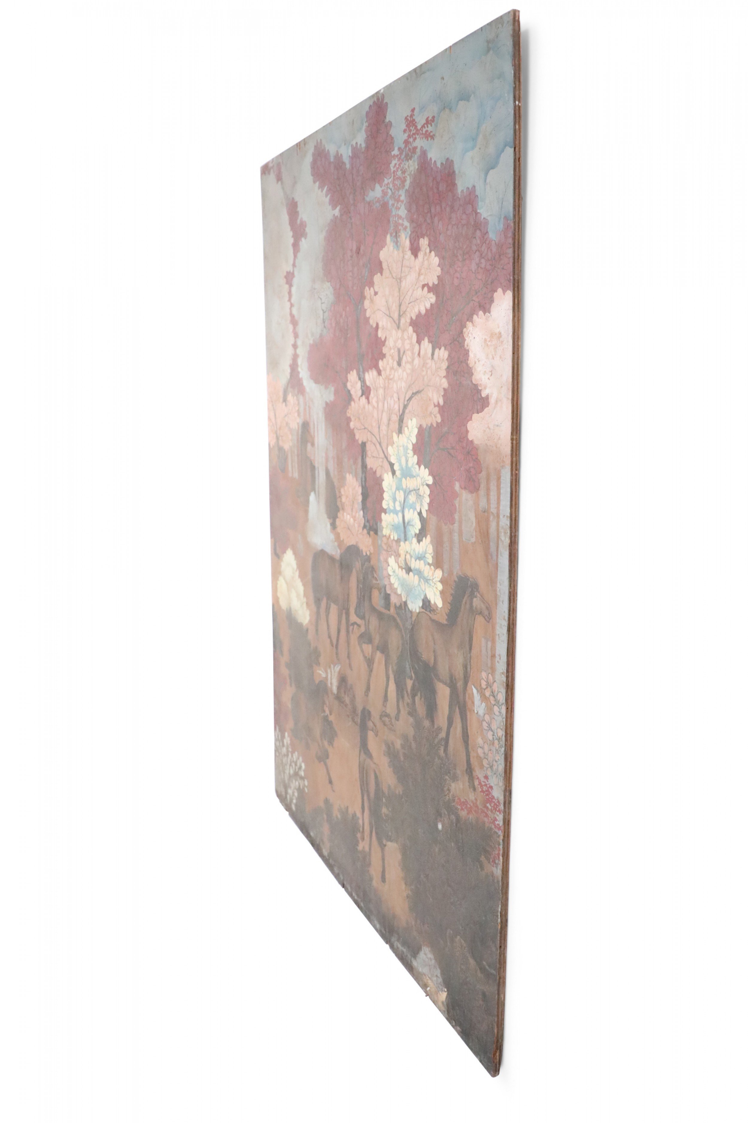 Vintage (20th Century) painting on wood depicting a group of horses gathered in a forest of red, peach, white and light blue trees, and a forest floor captured by allowing woodgrain to show in unpainted areas.