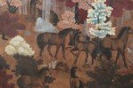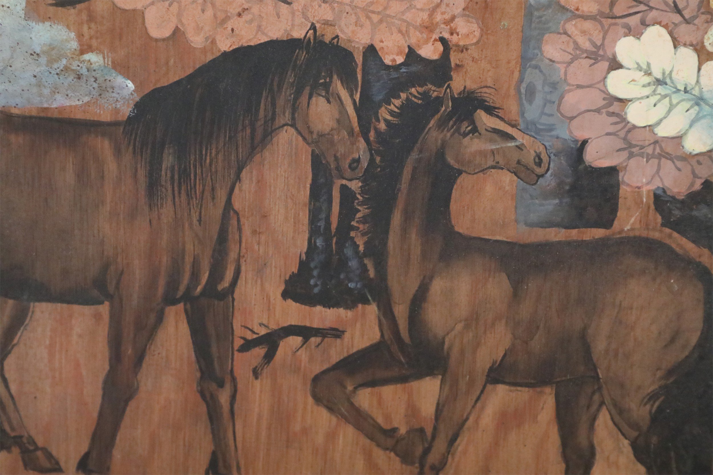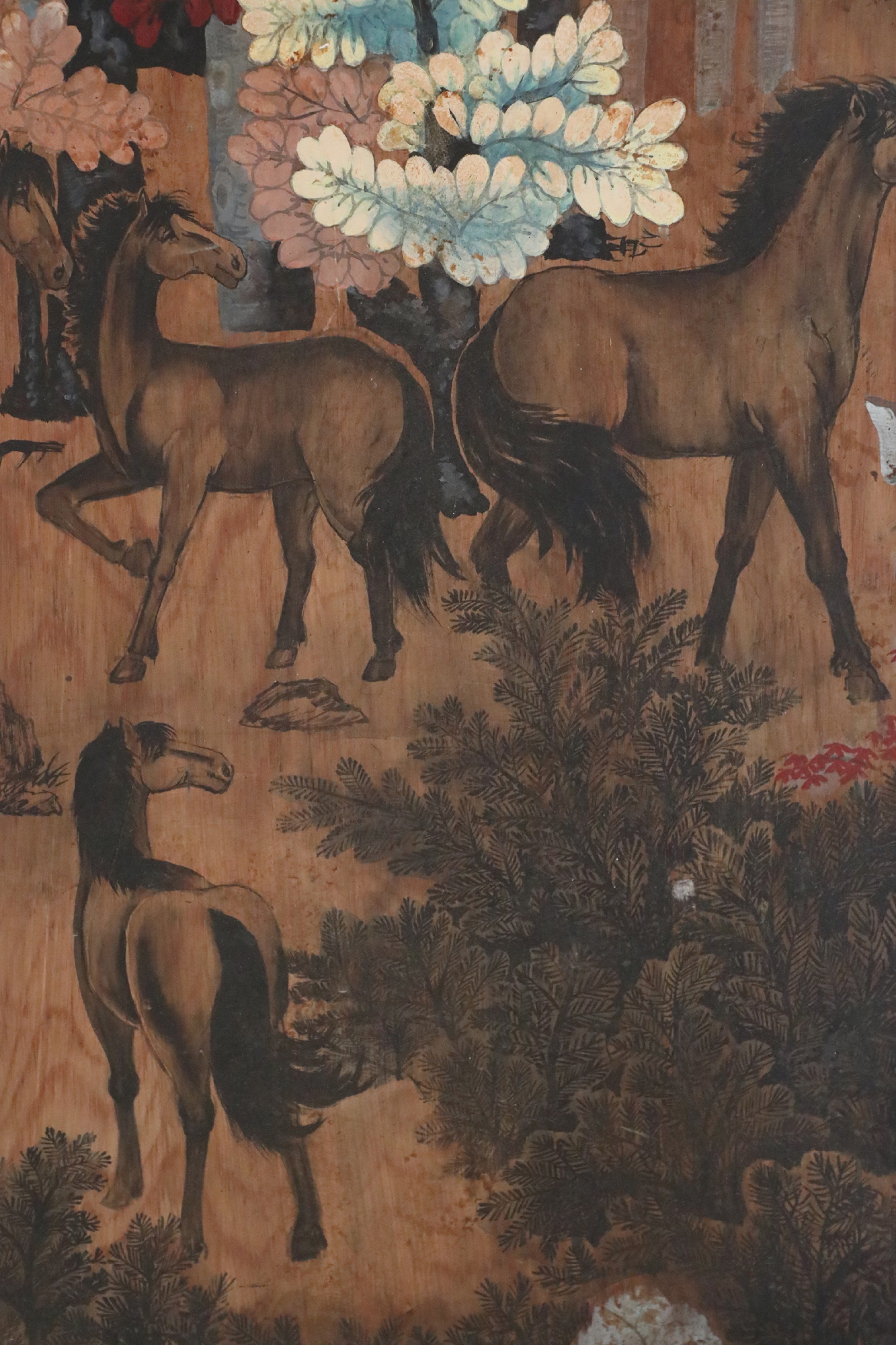 Vintage (20th Century) painting on wood depicting a group of horses gathered in a forest of red, peach, white and light blue trees, and a forest floor captured by allowing woodgrain to show in unpainted areas..