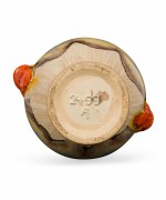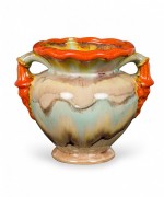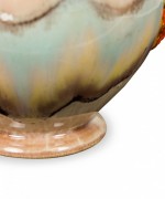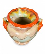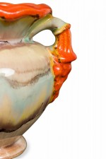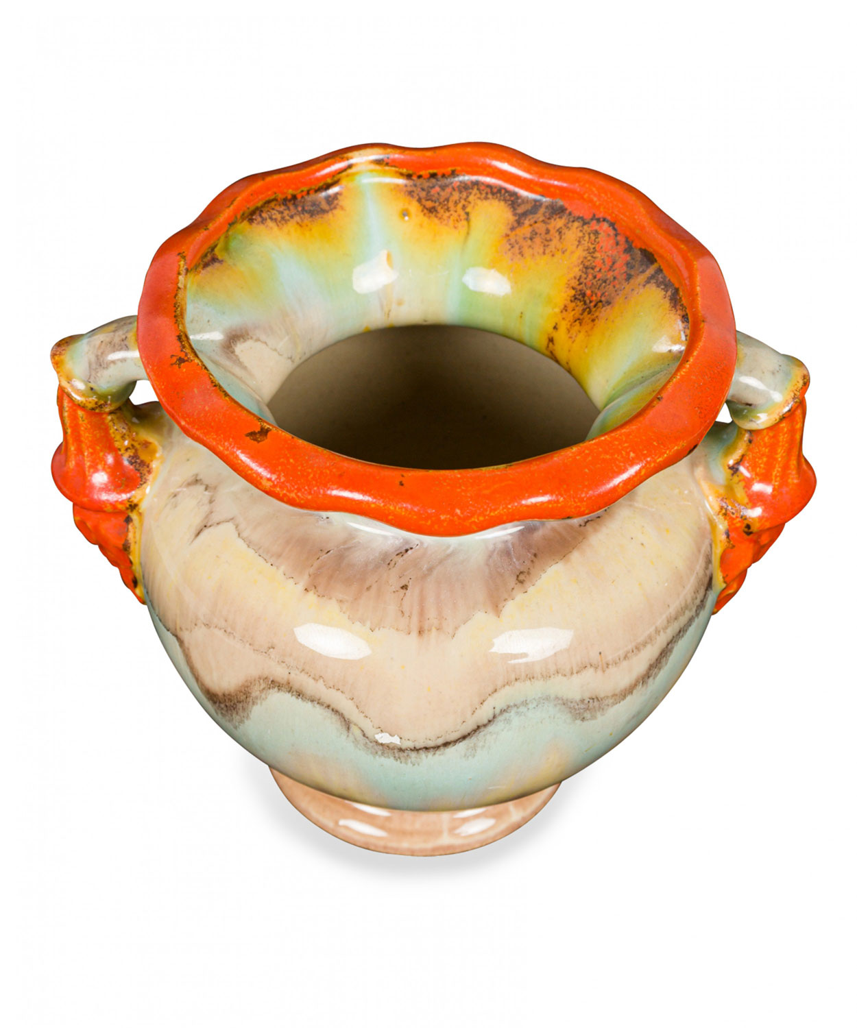 West German Mid-Century two-handled ceramic urn with an orange gently scalloped top rim and a celadon, beige, and black glazed tapered bod (numbered on bottom 2499 A, label on side, ILKRA EDEL KERAMIK)