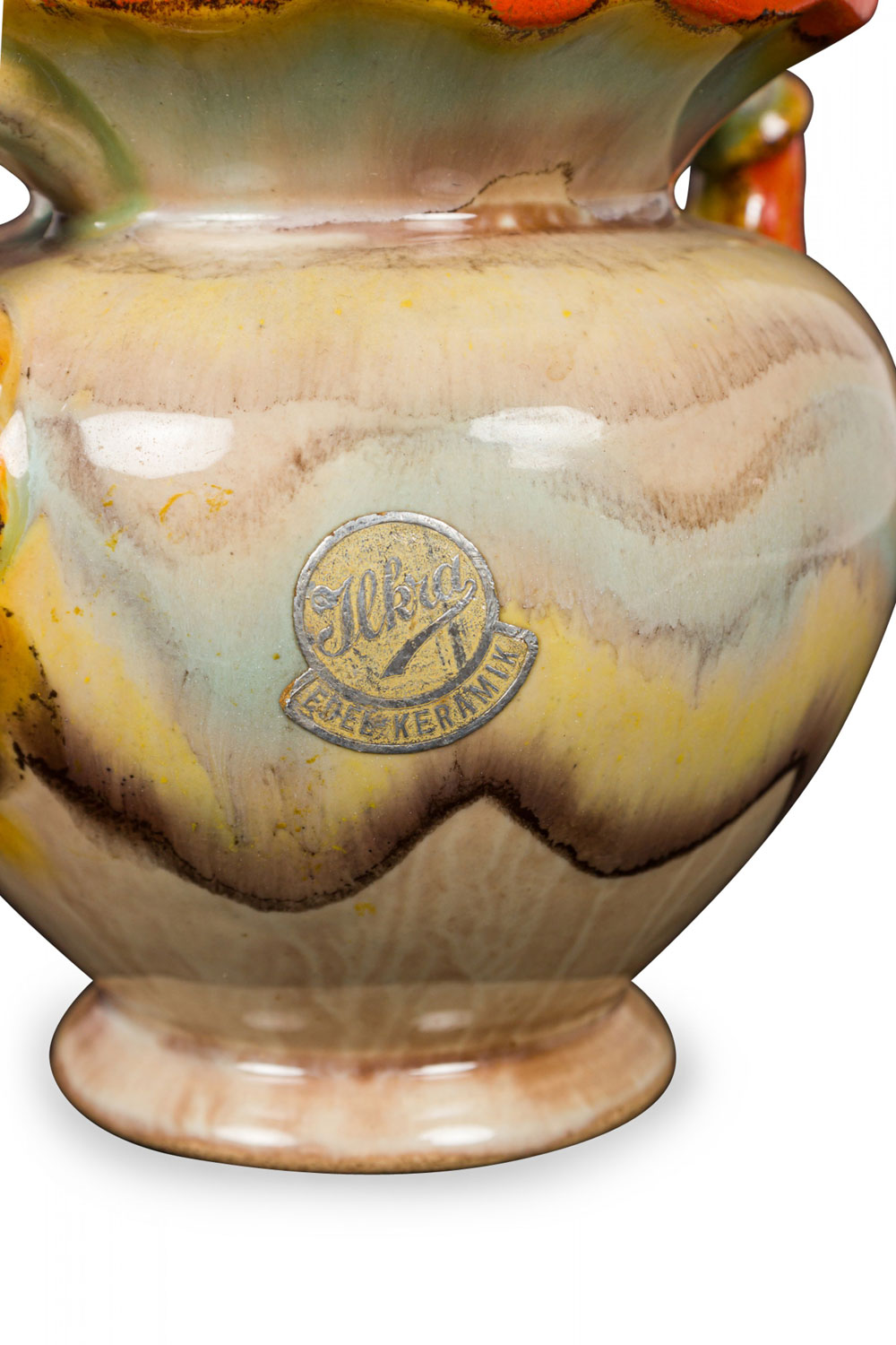West German Mid-Century two-handled ceramic urn with an orange gently scalloped top rim and a celadon, beige, and black glazed tapered bod (numbered on bottom 2499 A, label on side, ILKRA EDEL KERAMIK).