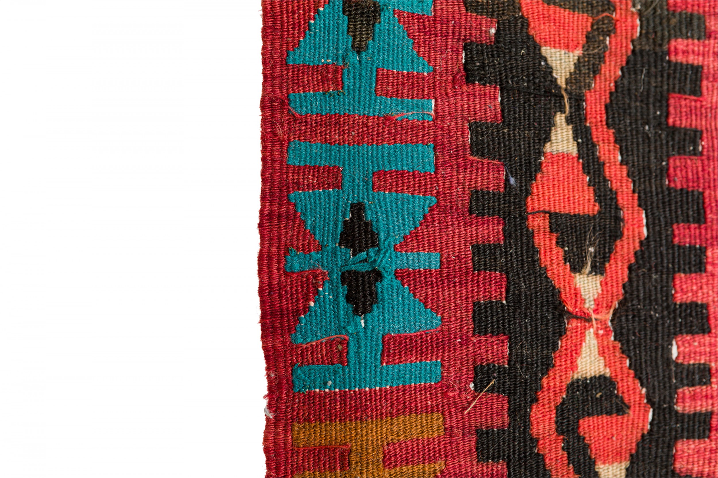 Indigenous American (possibly Navajo) woven rectangular floor runner rug with a geometric pattern in shades of red, pink, brown, blue, white, and gray with white fringe on the two shorter ends.