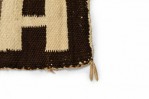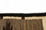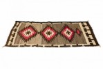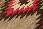 Indigenous American (possibly Navajo) woven rectangular rug with a geometric diamond pattern in pink, beige, and brown, against a mottled beige and brown background with a bold brown and beige geometric border.