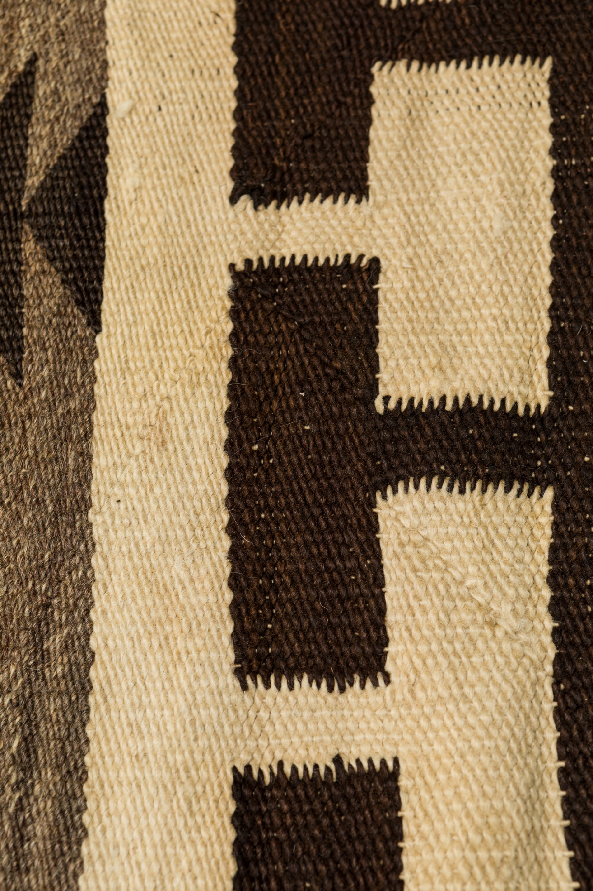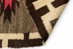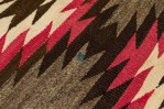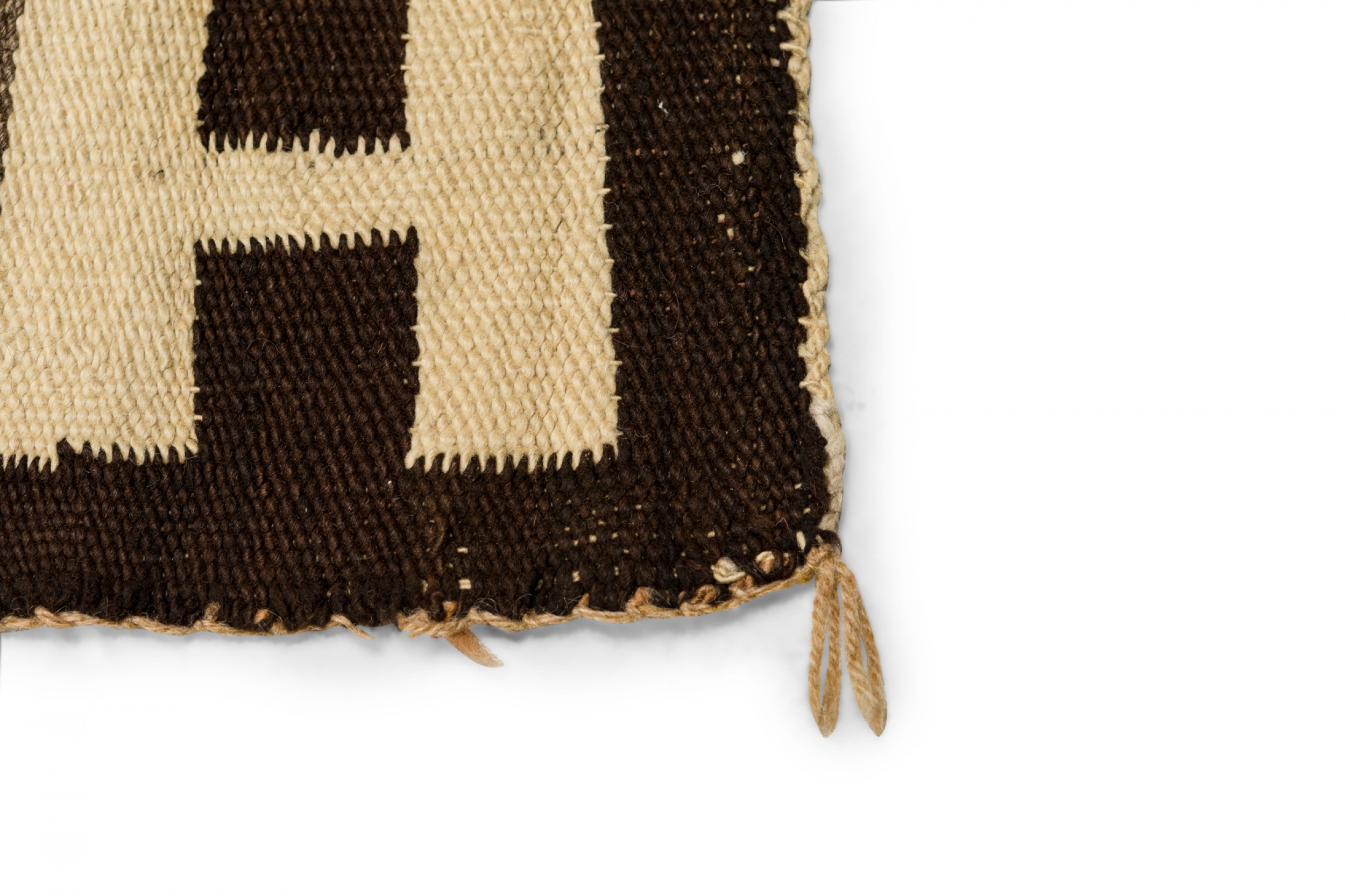 Indigenous American (possibly Navajo) woven rectangular rug with a geometric diamond pattern in pink, beige, and brown, against a mottled beige and brown background with a bold brown and beige geometric border..
