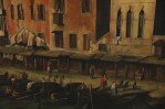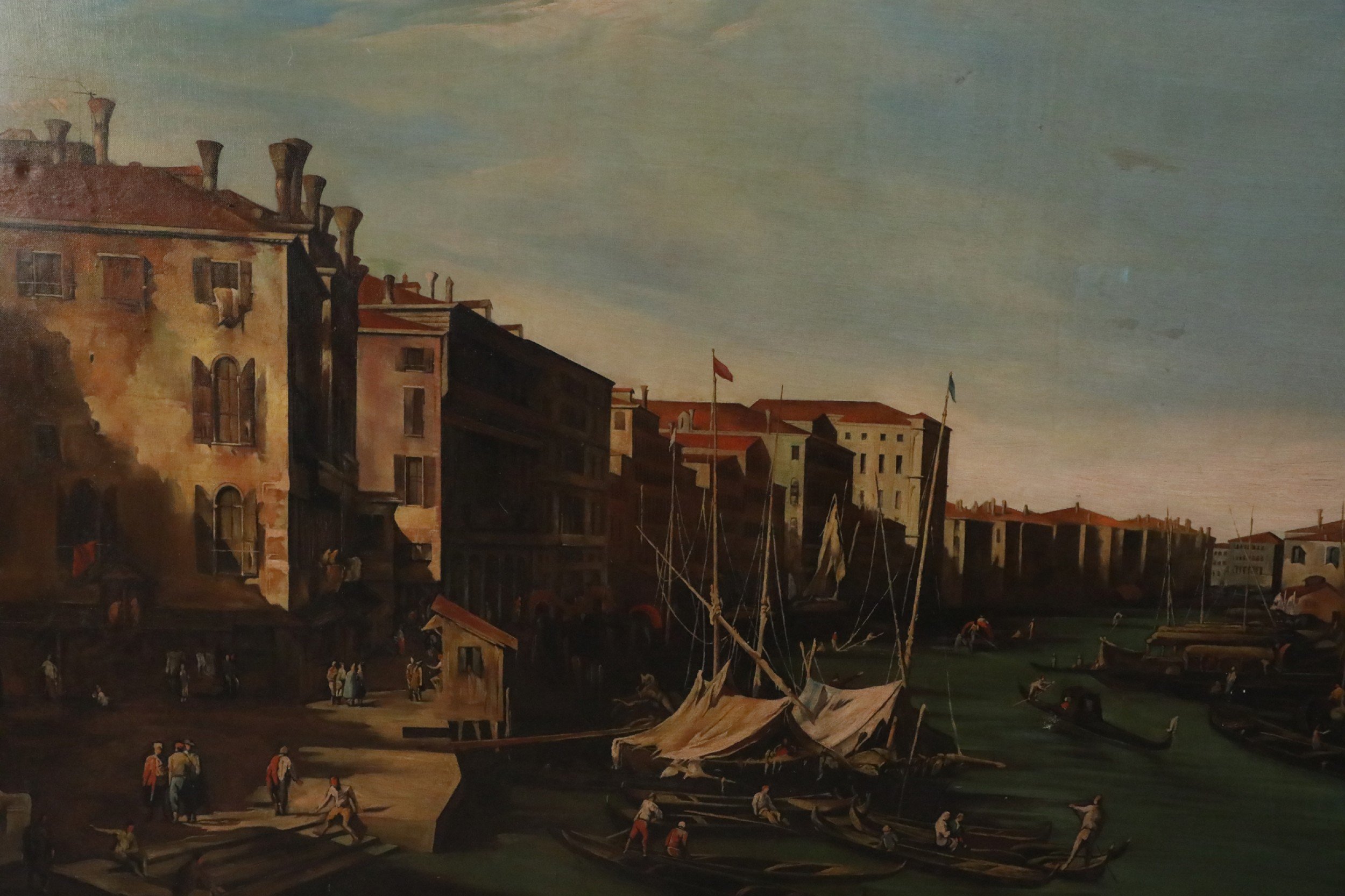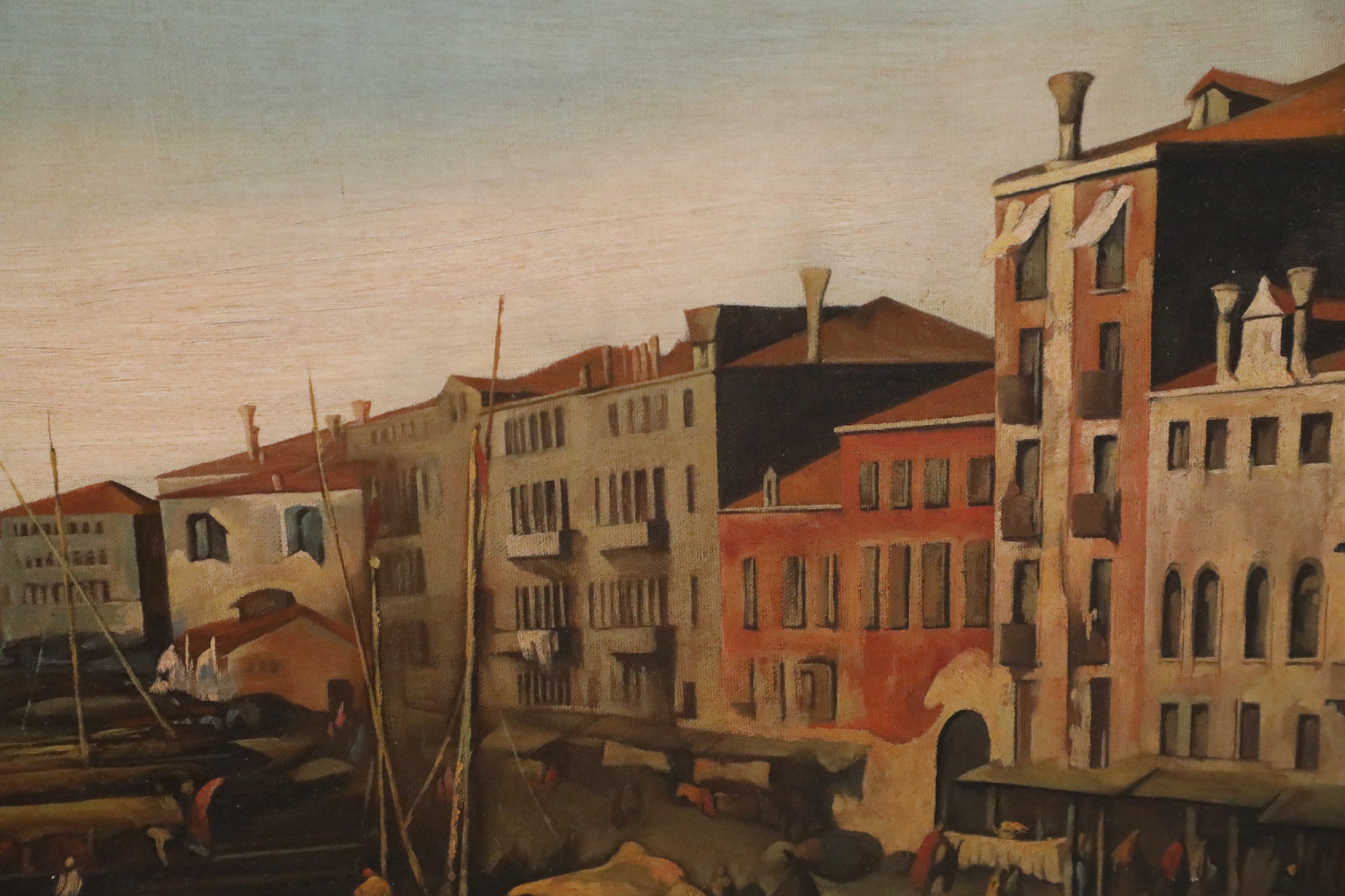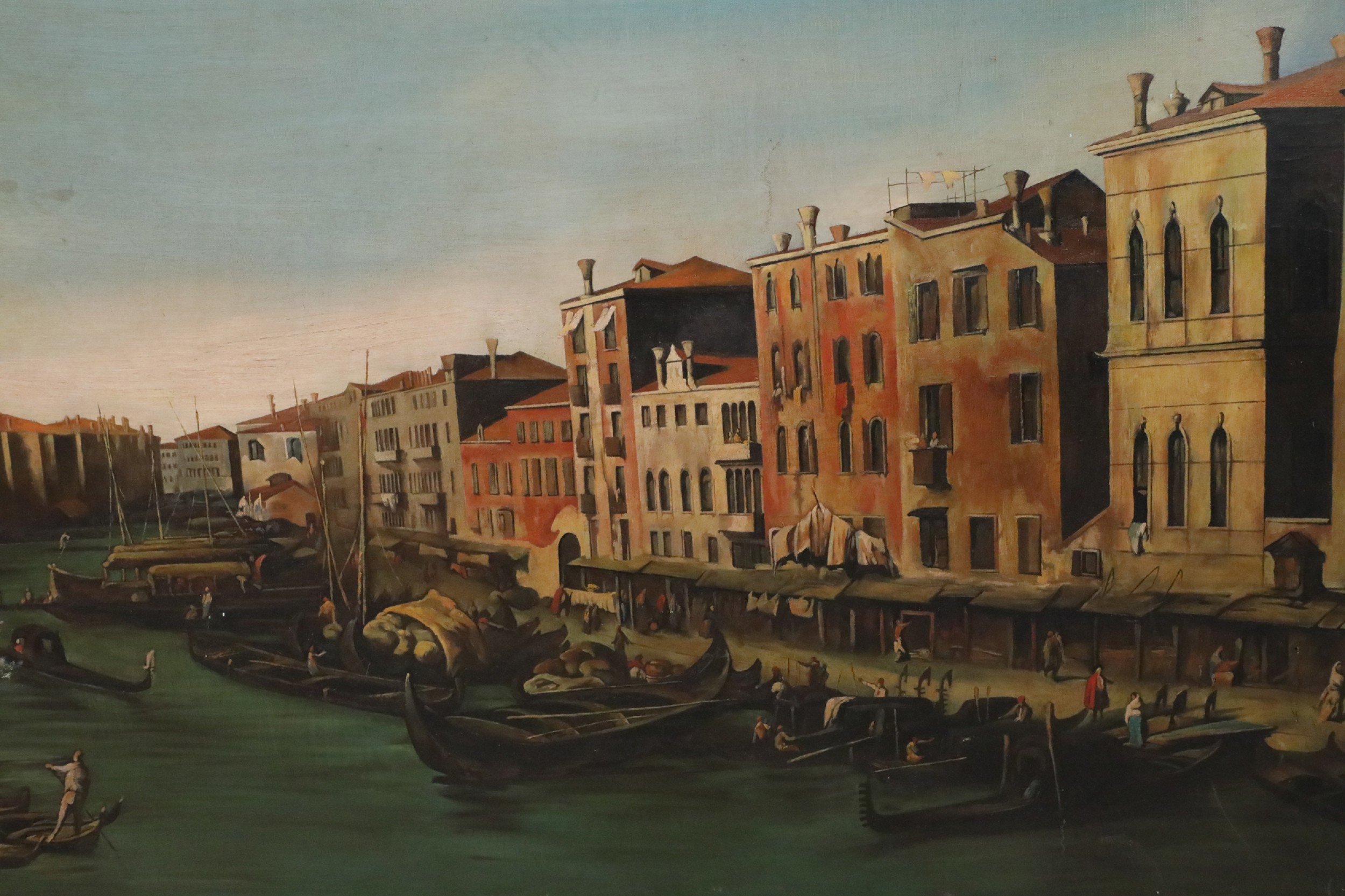 Italian Venetian-style (20th Century) painting of a central canal flowing through an Italian village that is swathed in golden light and busy with figures moving throughout, under a light blue sky. Painted on unframed, rectangular canvas..