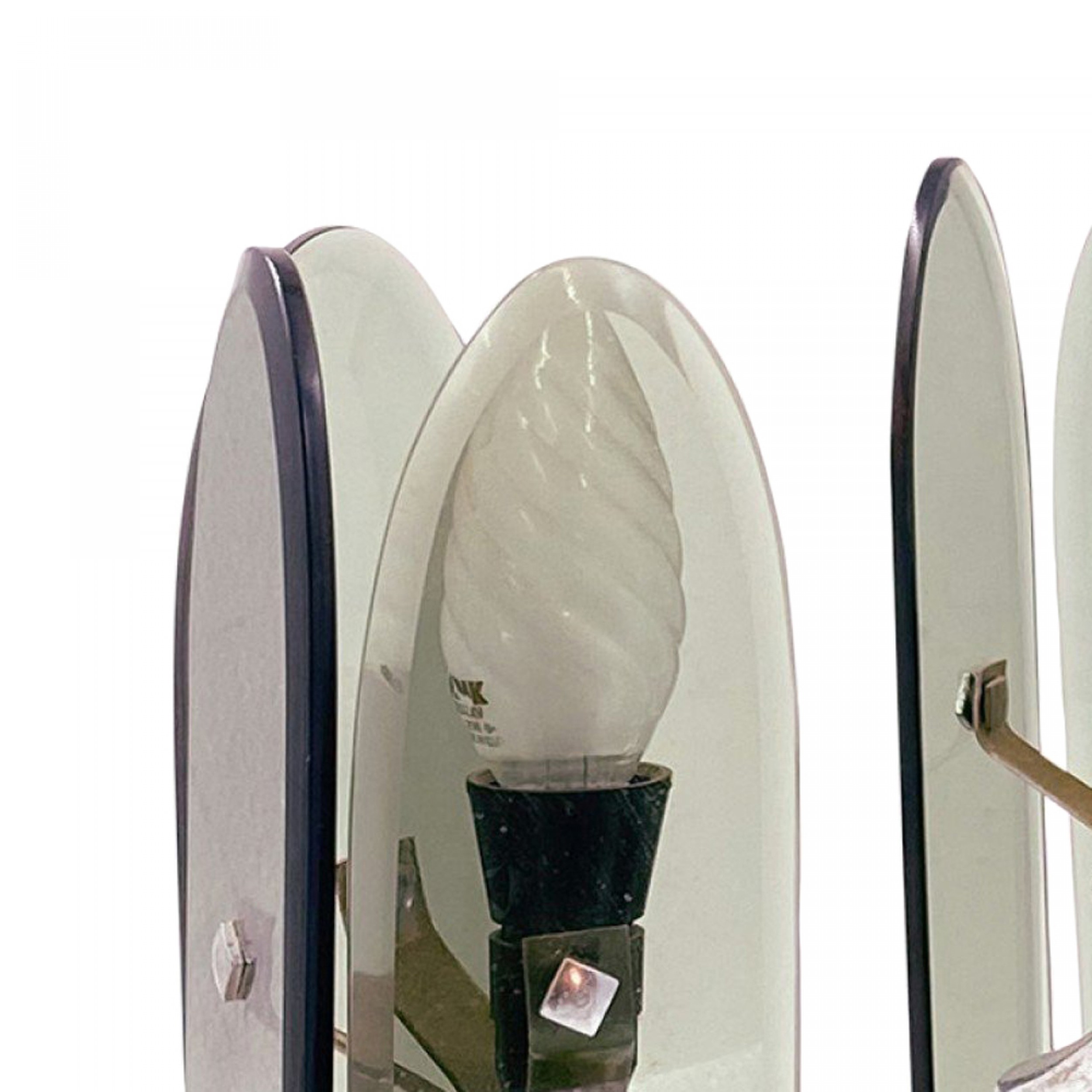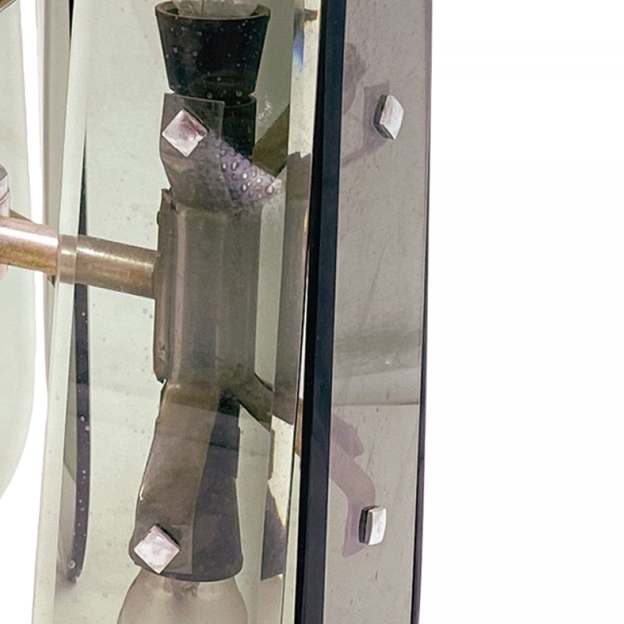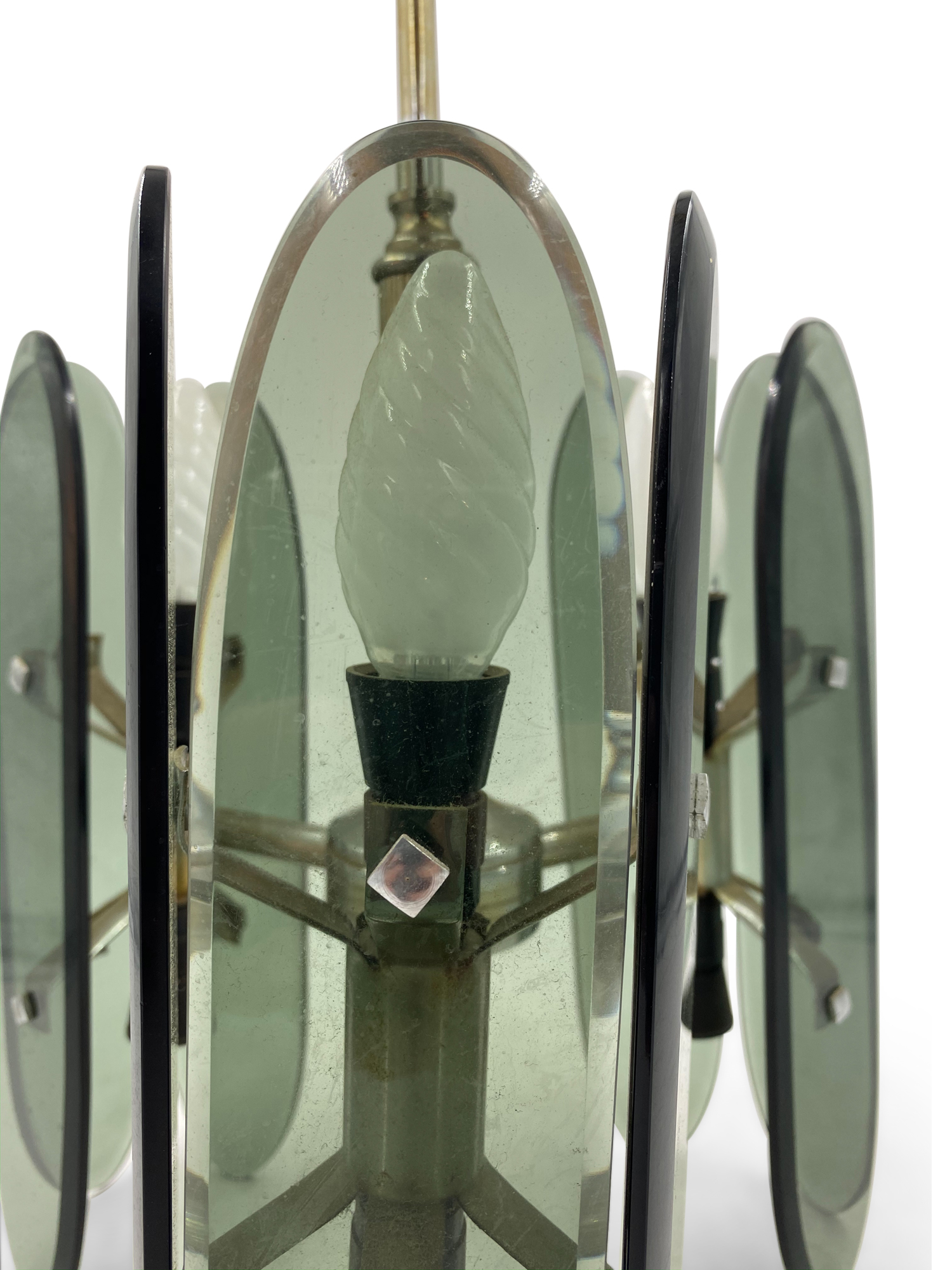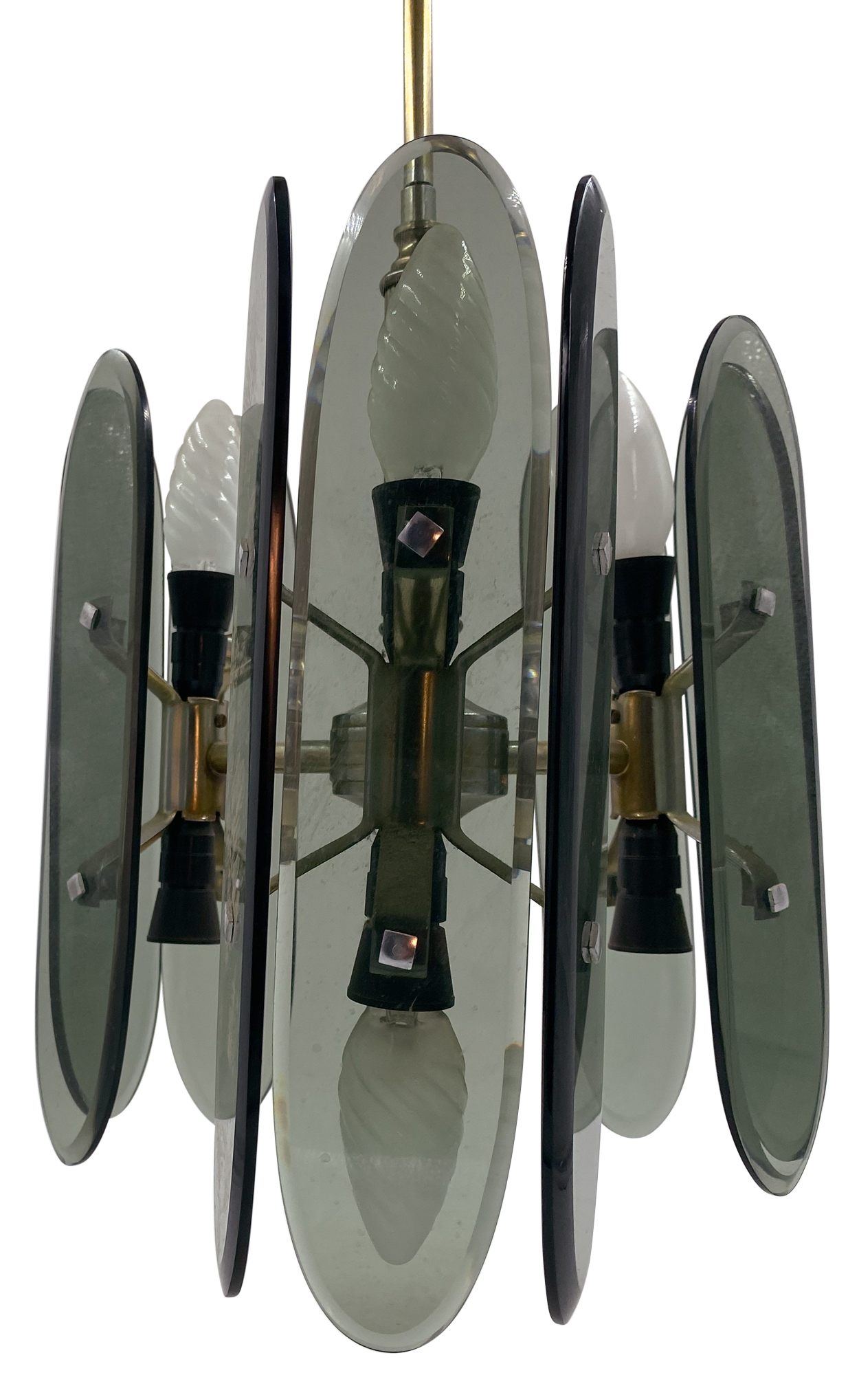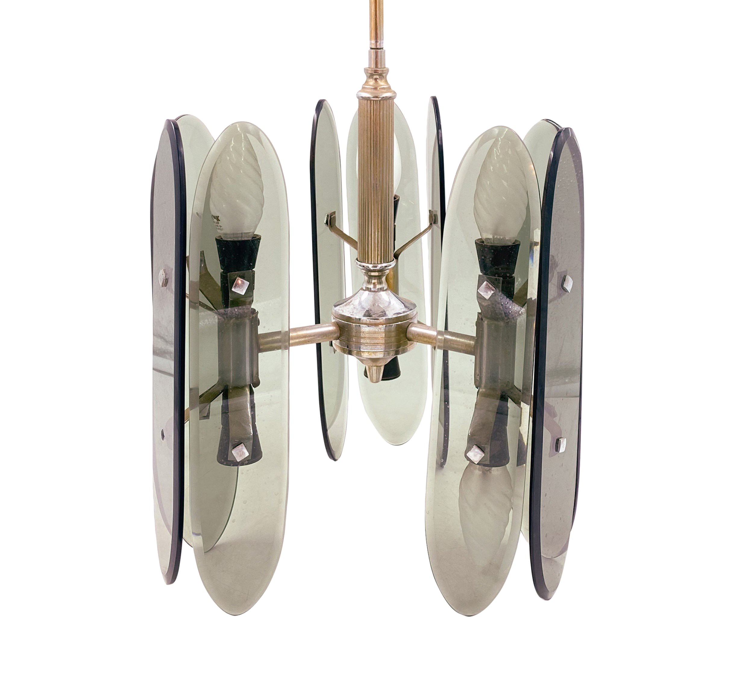 Italian Mid-Century Fontana Arte-style 6-light chandelier with smoked glass shades and metal drop-rod.