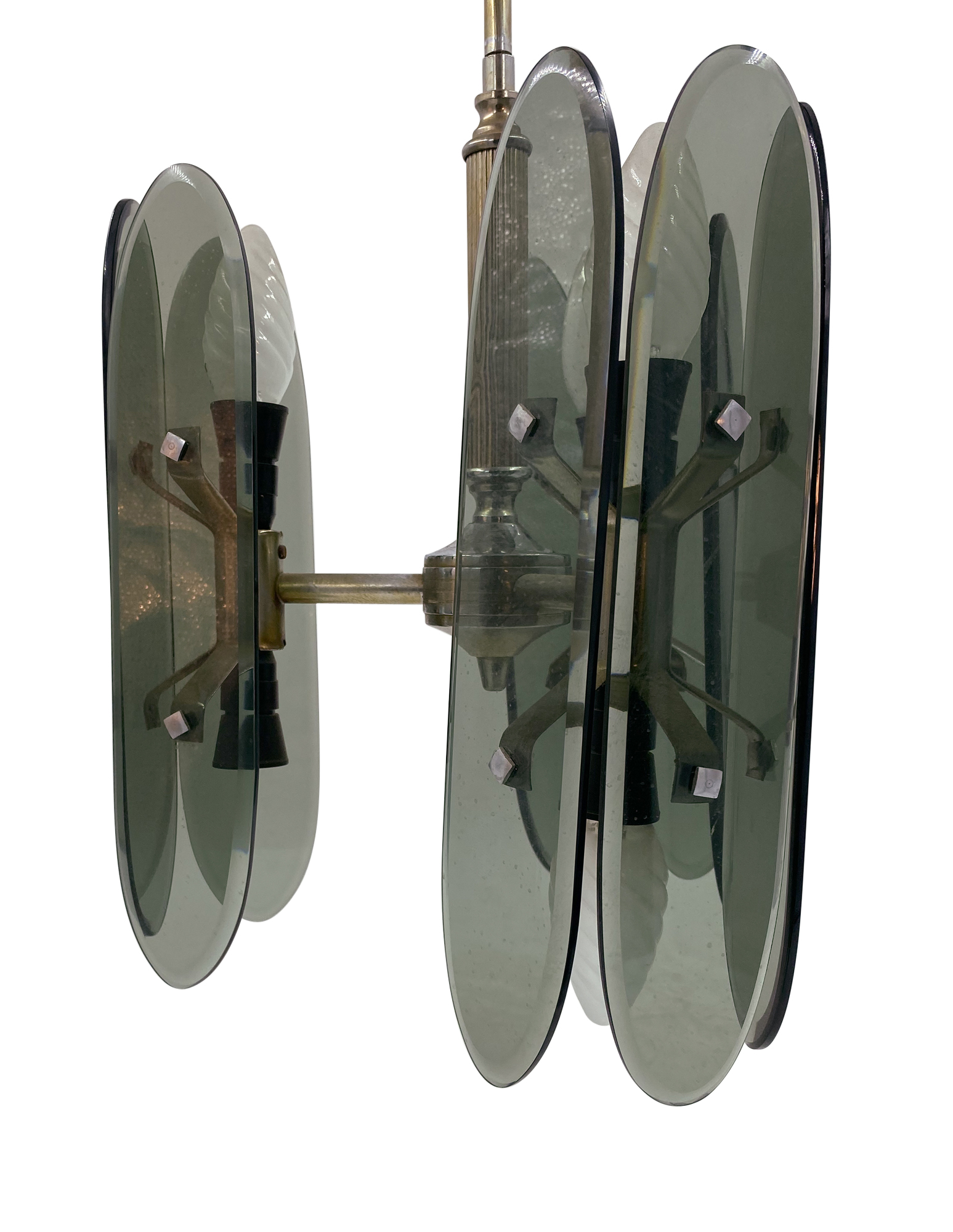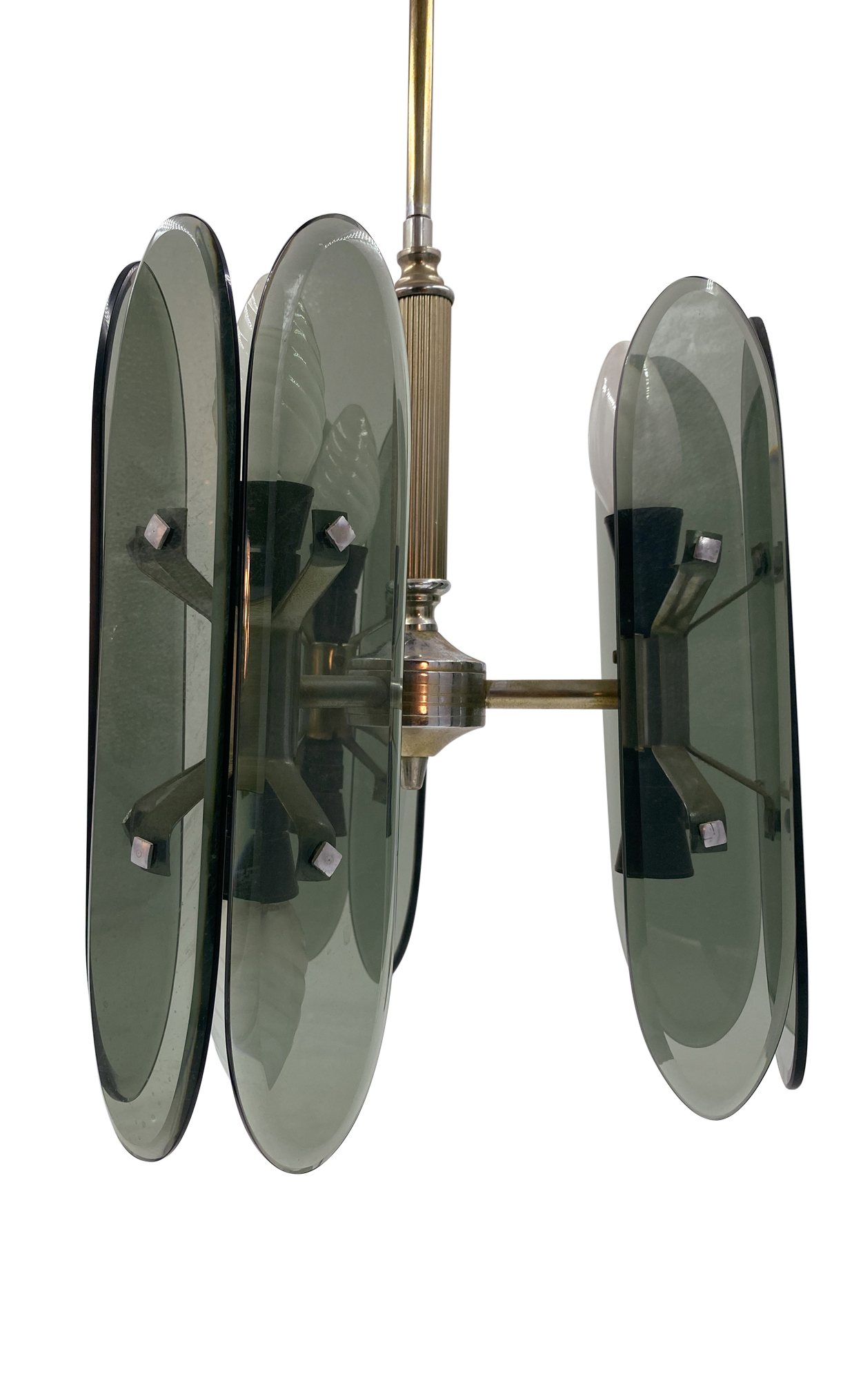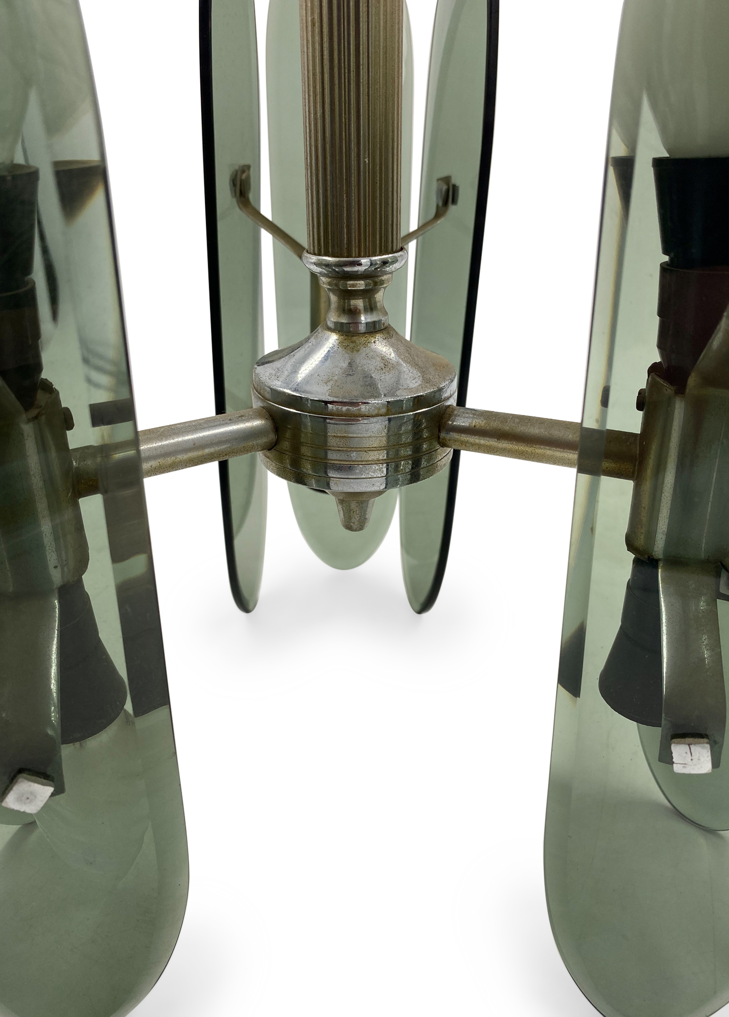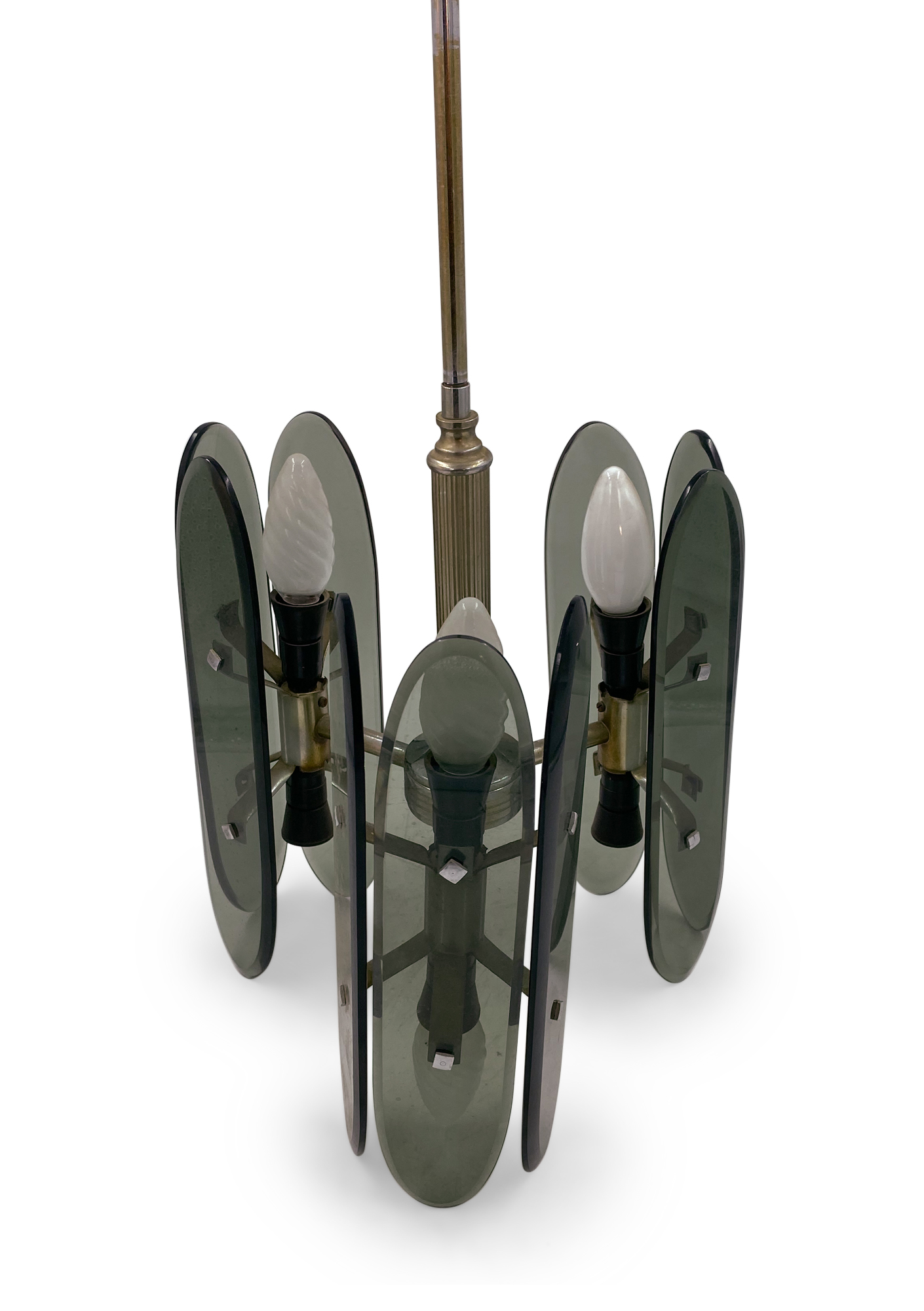 Italian Mid-Century Fontana Arte-style 6-light chandelier with smoked glass shades and metal drop-rod..