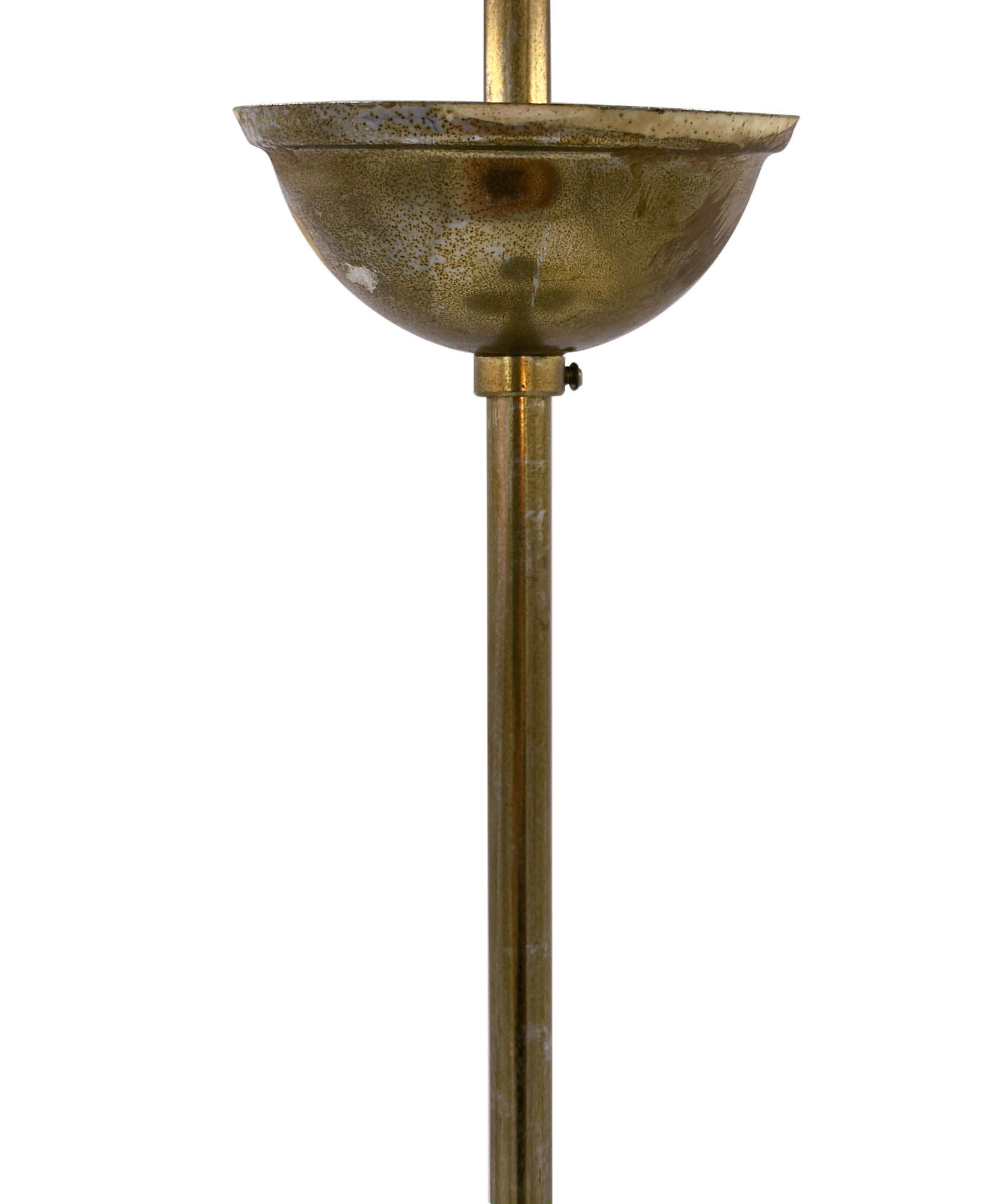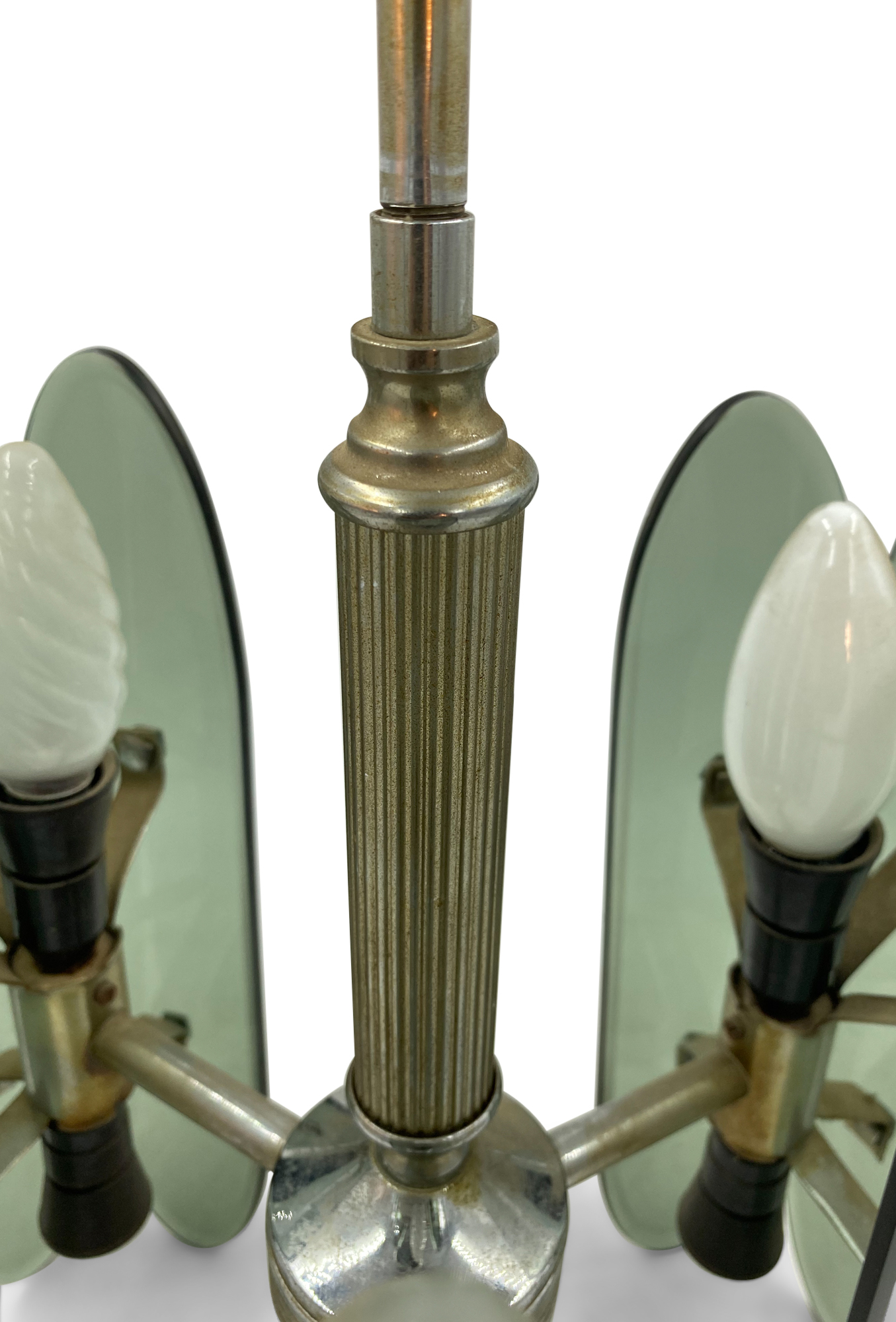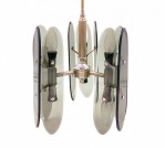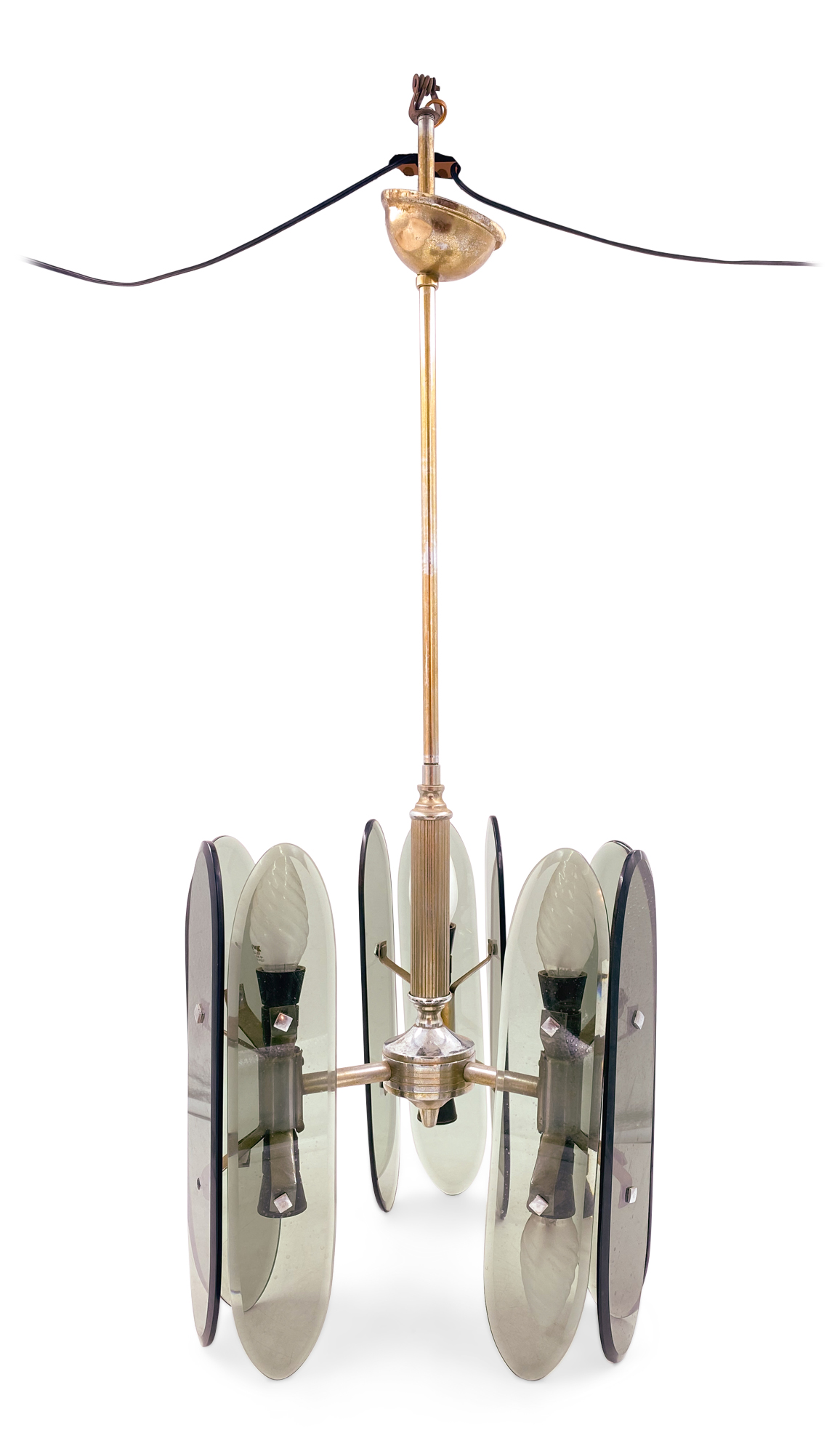 Italian Mid-Century Fontana Arte-style 6-light chandelier with smoked glass shades and metal drop-rod..