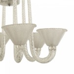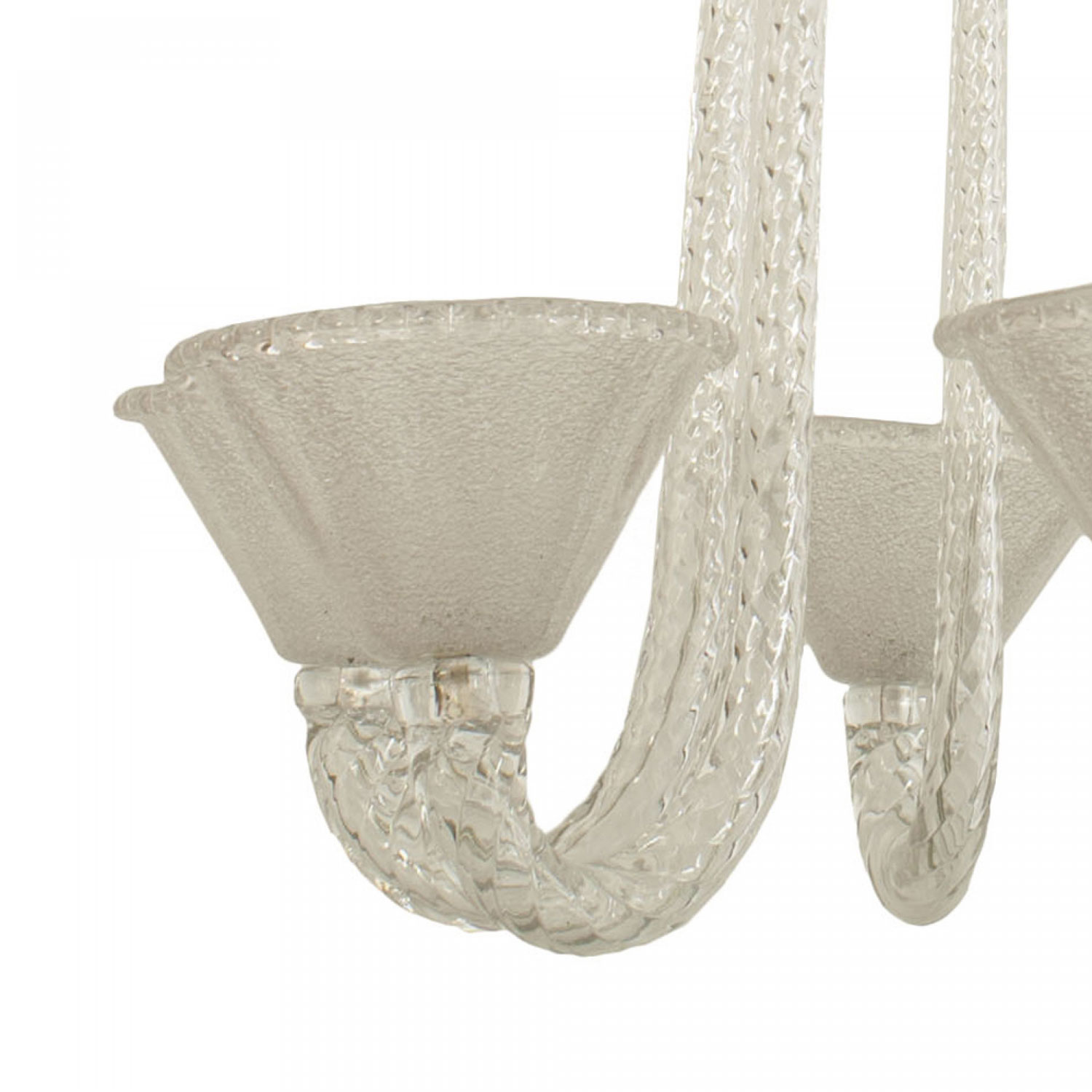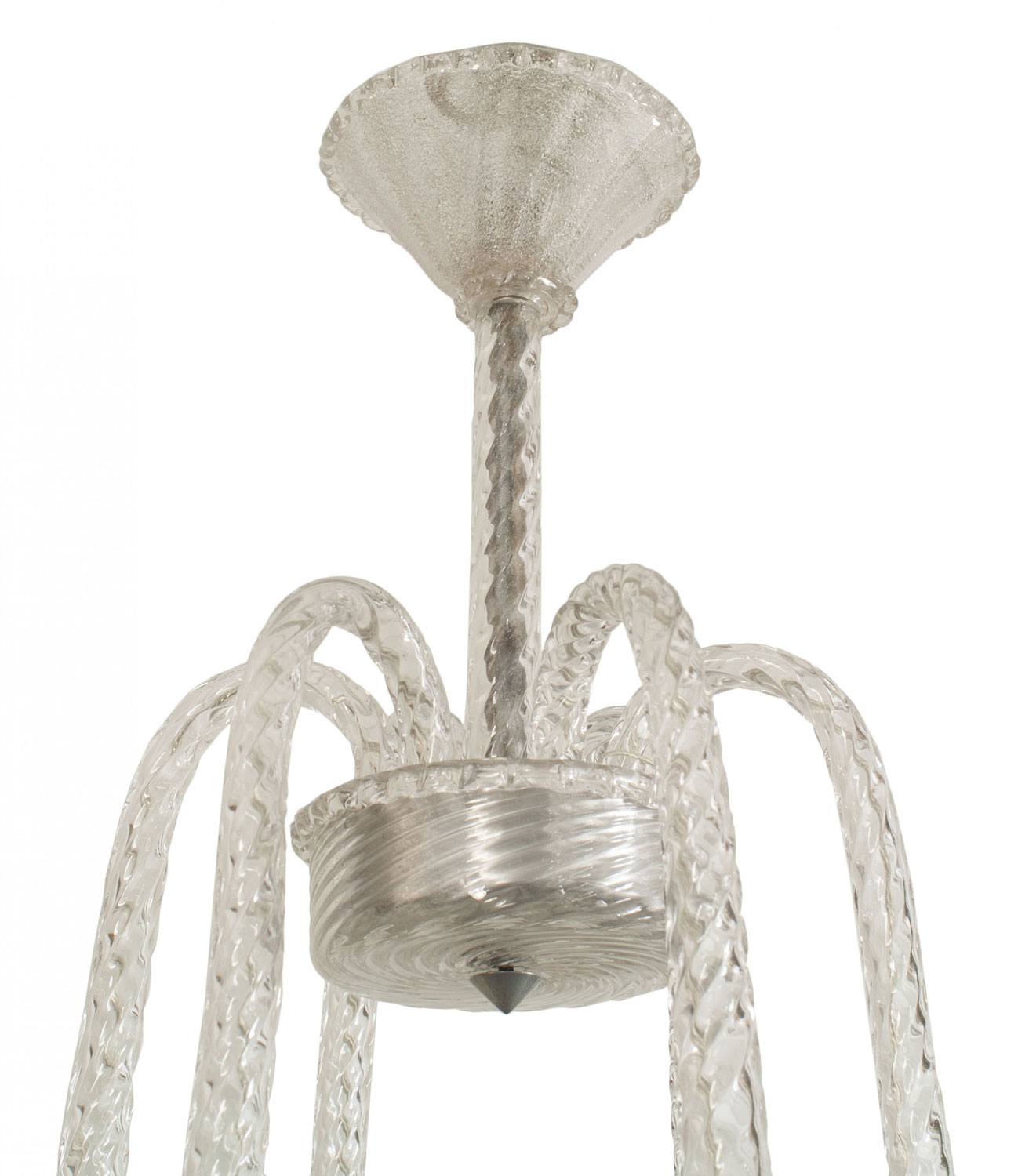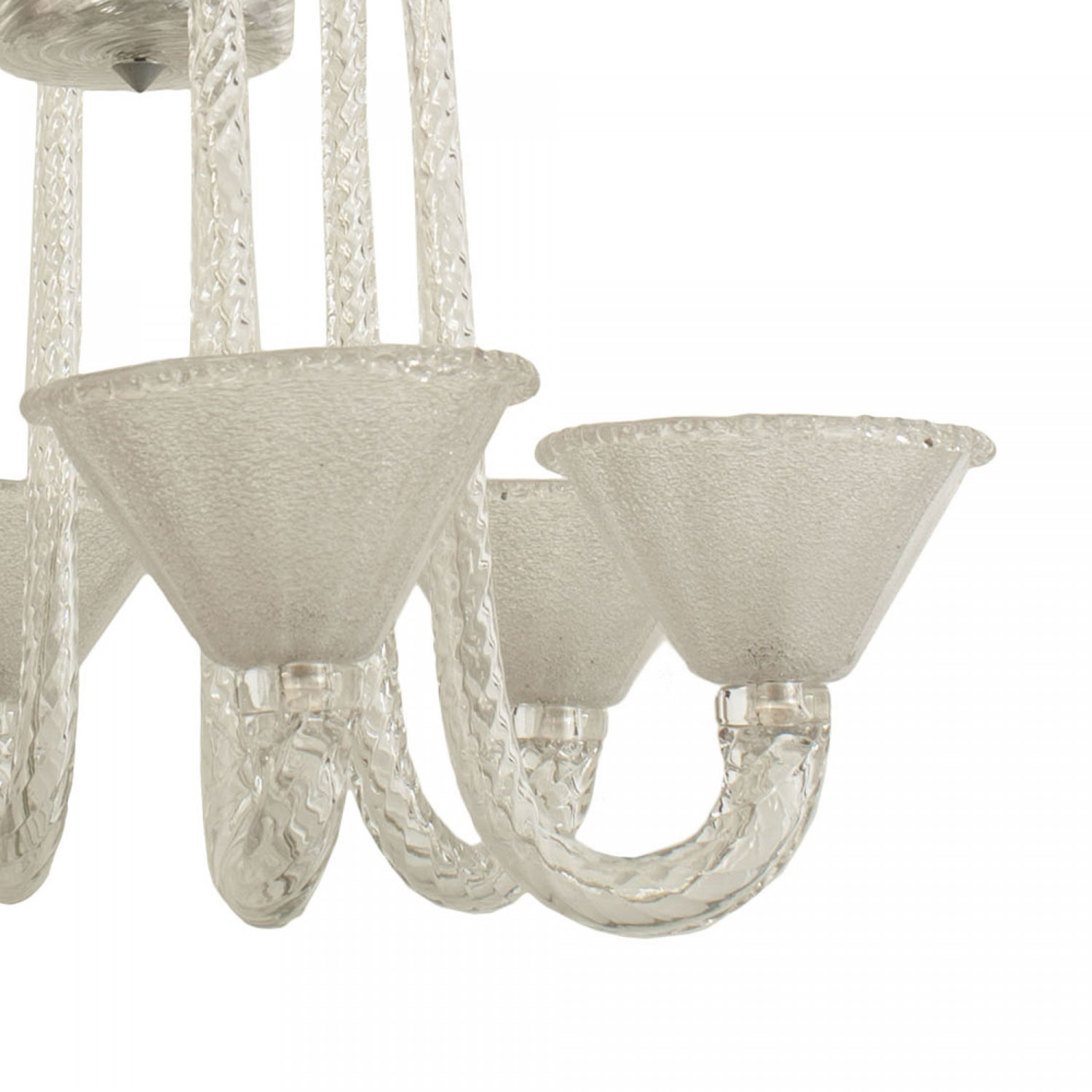 Italian Mid-Century (1940s) chandelier with 6 clear scroll form swirl arms supporting internal bubble glass fluted cone shaped shades with an acid etched & textured interior (by SEGUSO).