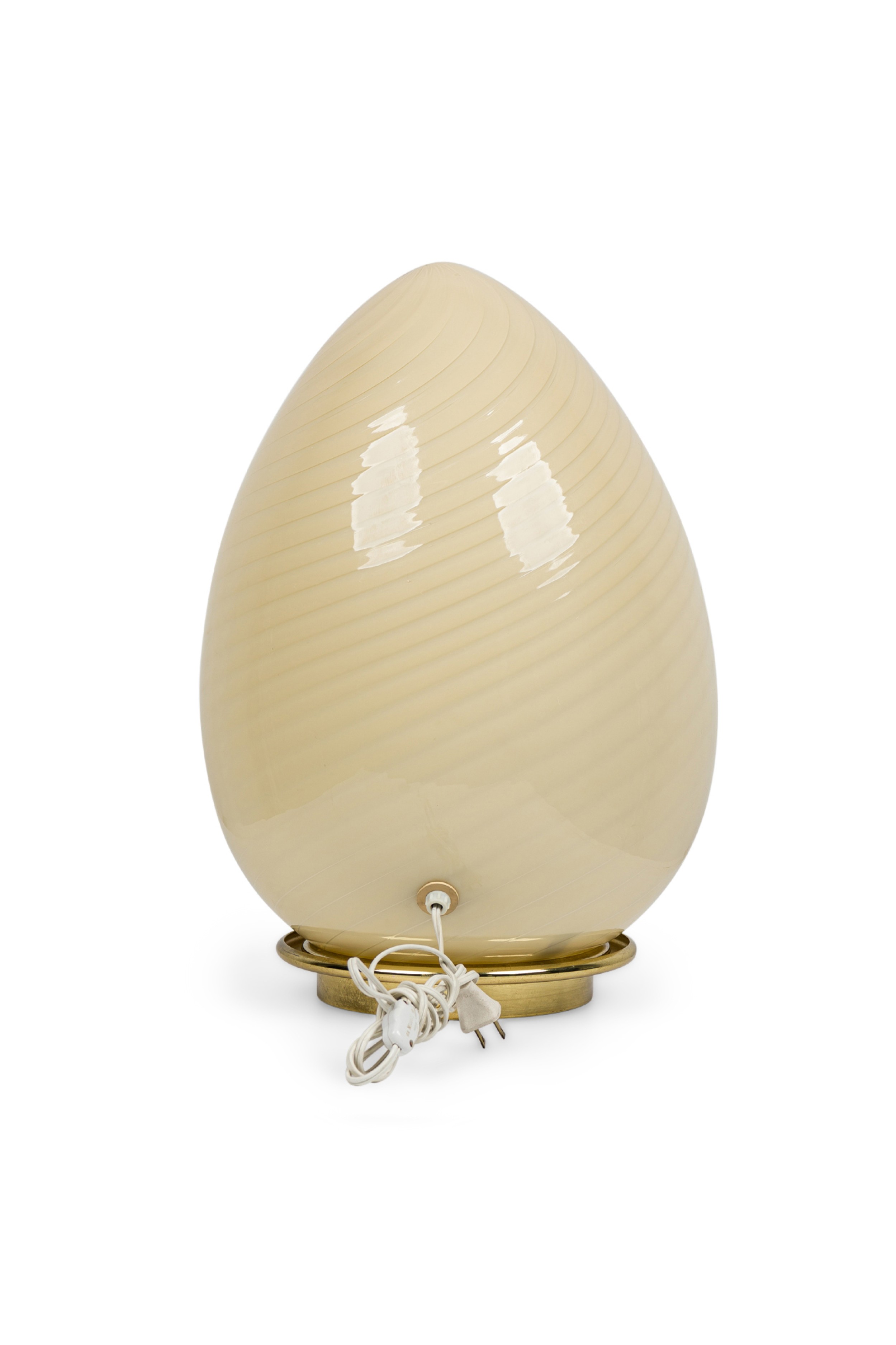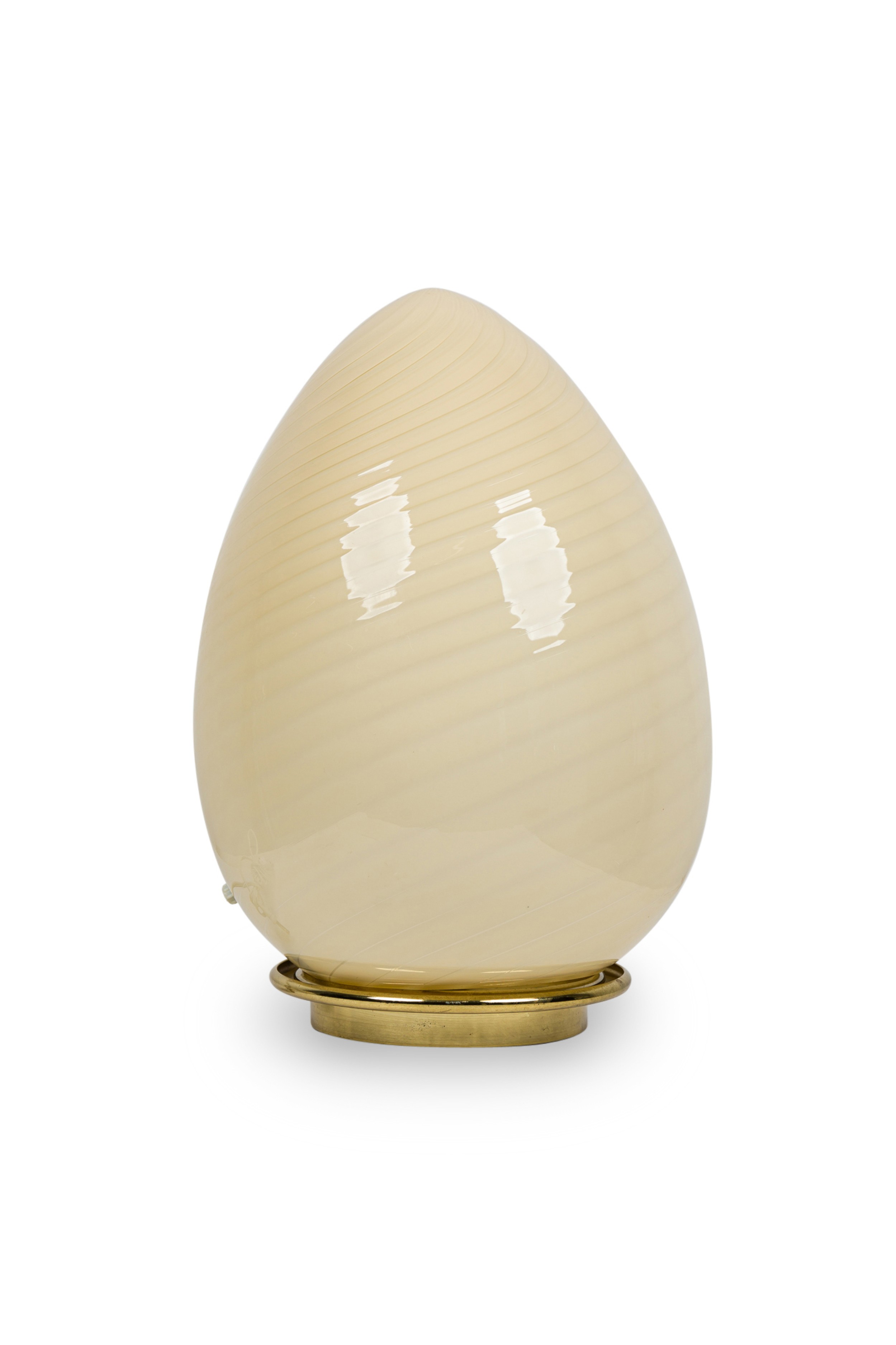 Italian Mid-Century Murano glass egg lamp with a golden spiral hue design and sitting on a stepped brass base.