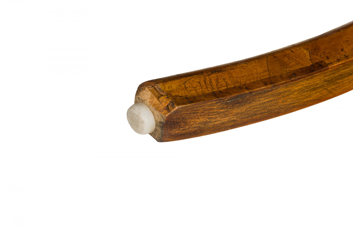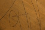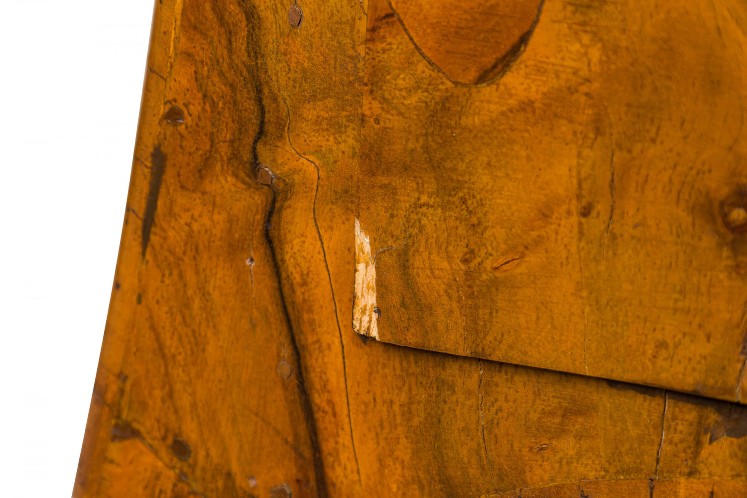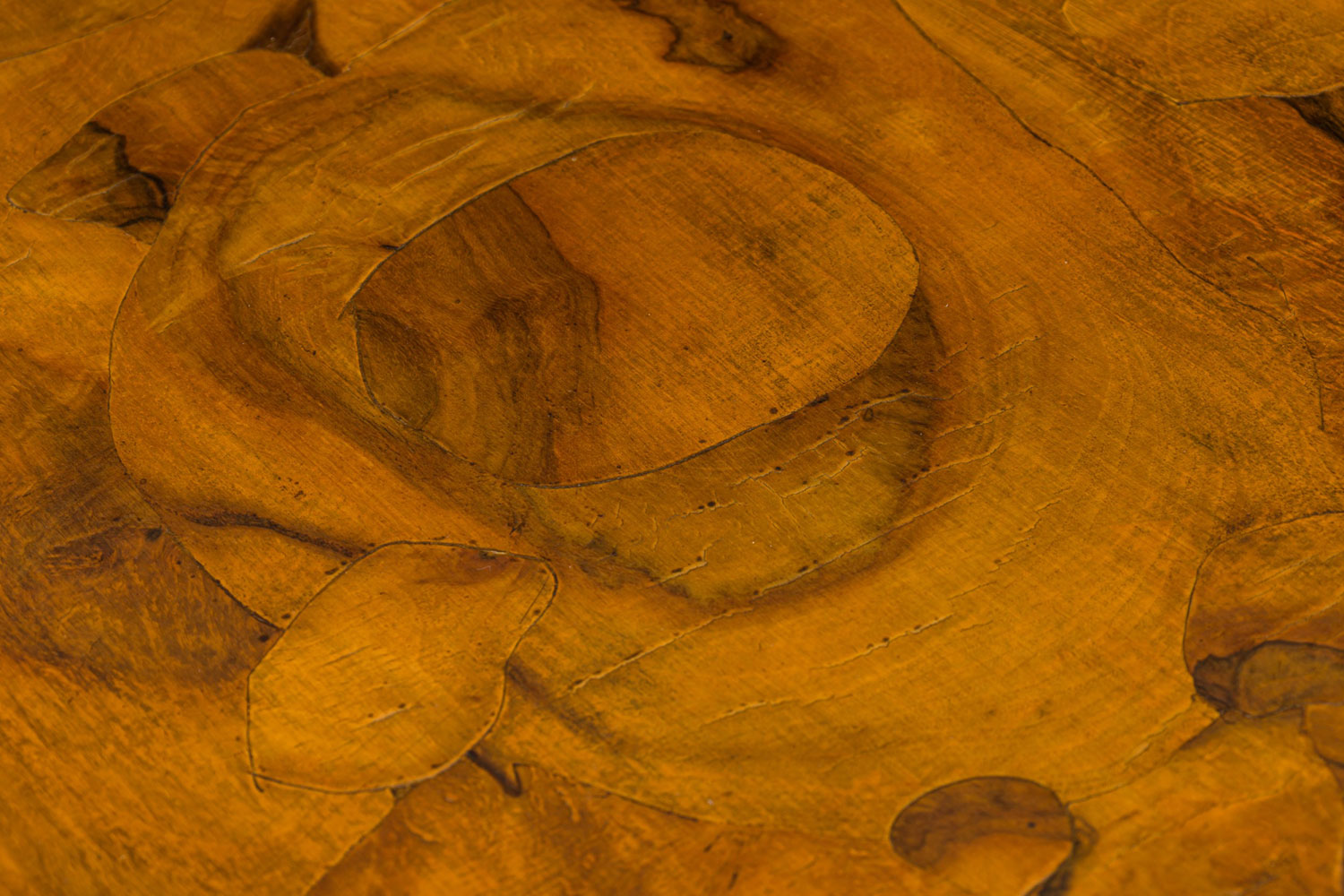 Style: Mid-Century Materials & Techniques: Brass, burl, metal, wood Category: Tables, Office/Library Condition: Minor cracks and losses to veneer. Good; Wear consistent with age and use