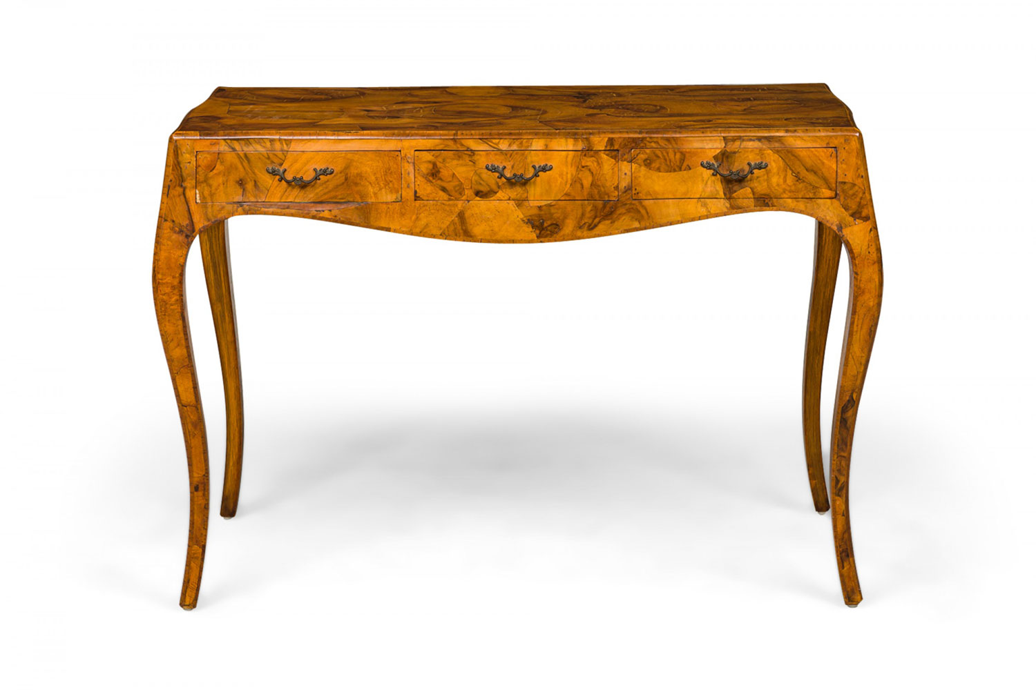 Italian Mid-Century rectangular writing table with oyster burl veneer and three drawers with brass drawer pulls, resting on four cabriole legs..