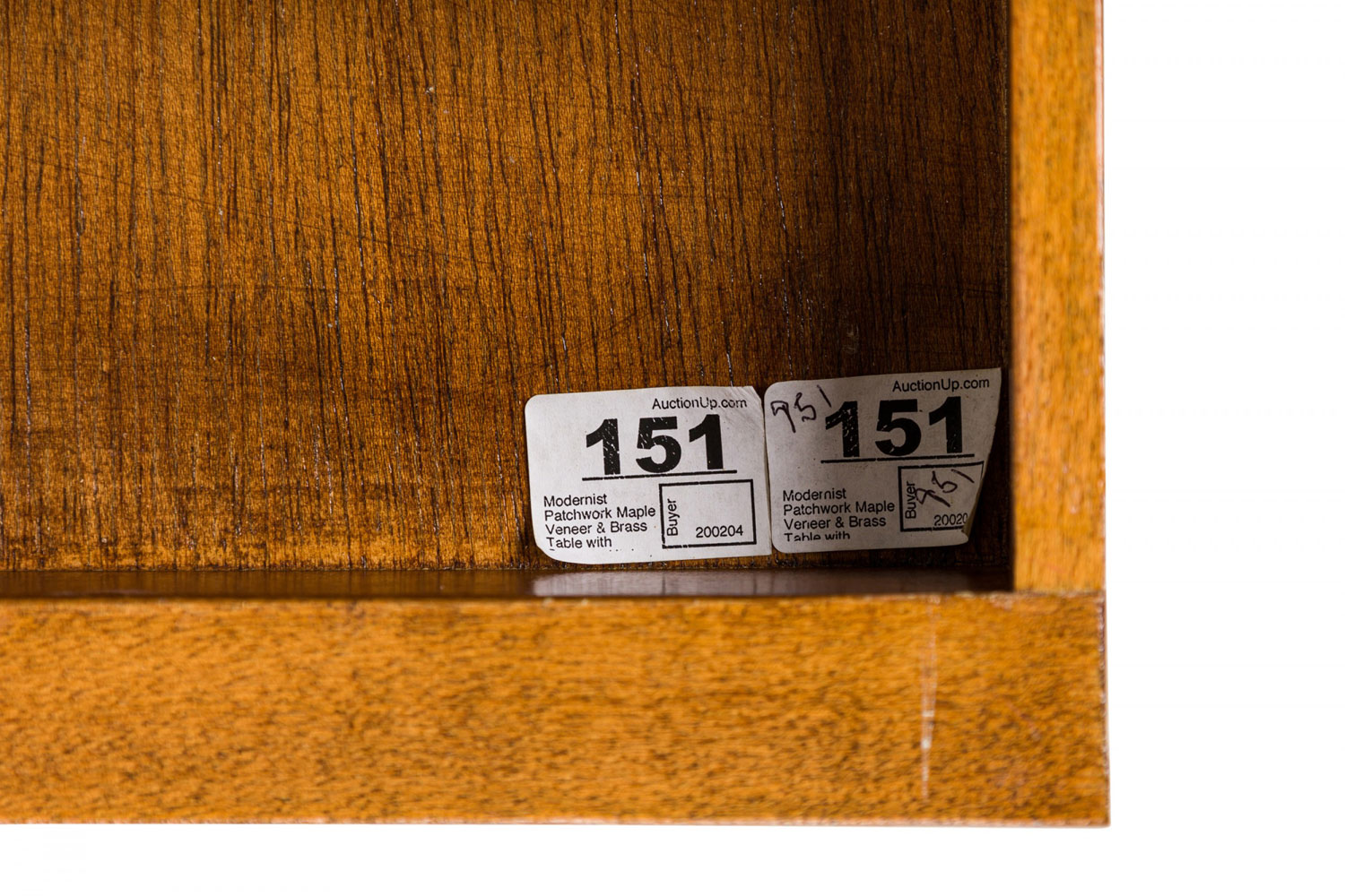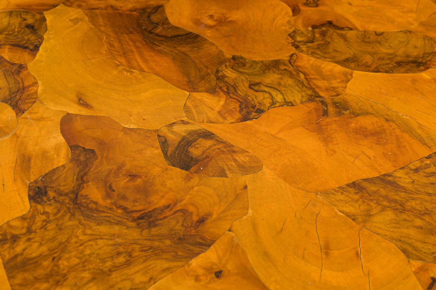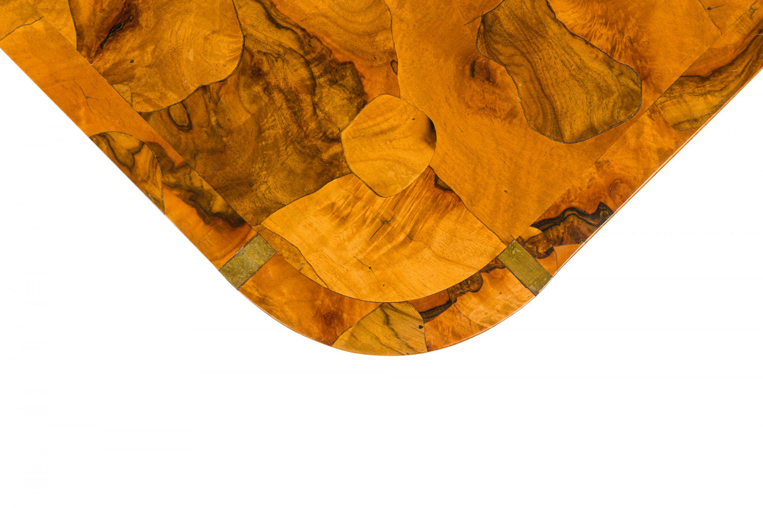 Style: Mid-Century Materials & Techniques: Burl, veneer, wood Category: Tables, Office/Library Condition: Veneer buckling and losses throughout, brass banding is tarnished. Good; Wear consistent with age and use