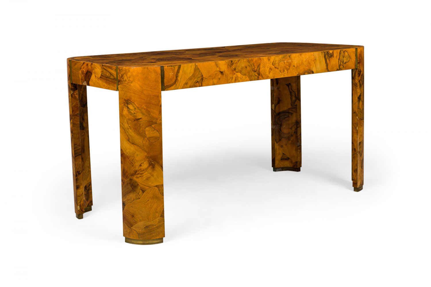 Italian Mid-Century "Radius" writing desk with a rectangular top with rounded edges and two drawers, finished in oyster burl veneer and resting on four rounded triangular legs.